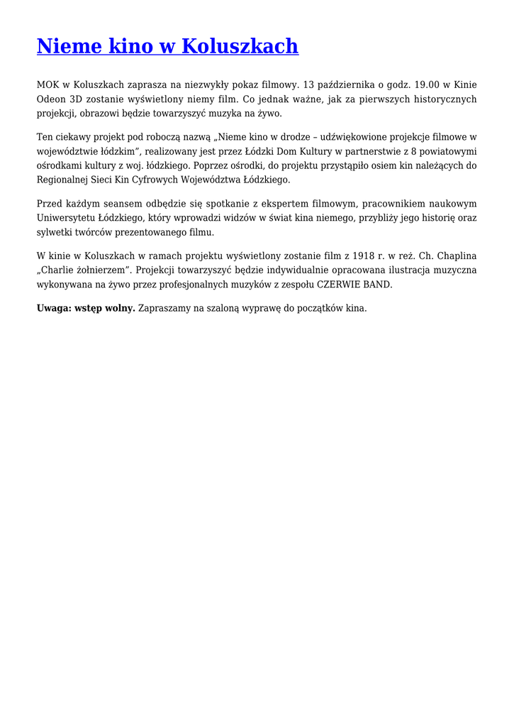 Nieme kino w Koluszkach MOK w Koluszkach zaprasza na niezwykły pokaz filmowy. 13 października o godz. 19.00 w Kinie Odeon 3D zostanie wyświetlony niemy film. Co jednak ważne, jak za pierwszych historycznych projekcji, obrazowi będzie towarzyszyć muzyka na żywo. Ten ciekawy projekt pod roboczą nazwą „Nieme kino w drodze – udźwiękowione projekcje filmowe w województwie łódzkim”, realizowany jest przez Łódzki Dom Kultury w partnerstwie z 8 powiatowymi ośrodkami kultury z woj. łódzkiego. Poprzez ośrodki, do projektu przystąpiło osiem kin należących do Regionalnej Sieci Kin Cyfrowych Województwa Łódzkiego. Przed każdym seansem odbędzie się spotkanie z ekspertem filmowym, pracownikiem naukowym Uniwersytetu Łódzkiego, który wprowadzi widzów w świat kina niemego, przybliży jego historię oraz sylwetki twórców prezentowanego filmu. W kinie w Koluszkach w ramach projektu wyświetlony zostanie film z 1918 r. w reż. Ch. Chaplina „Charlie żołnierzem”. Projekcji towarzyszyć będzie indywidualnie opracowana ilustracja muzyczna wykonywana na żywo przez profesjonalnych muzyków z zespołu CZERWIE BAND. Uwaga: wstęp wolny. Zapraszamy na szaloną wyprawę do początków kina.