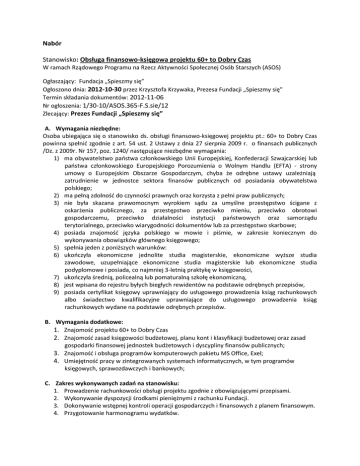 Nabór Stanowisko: Obsługa finansowo-księgowa projektu 60+ to Dobry Czas W ramach Rządowego Programu na Rzecz Aktywności Społecznej Osób Starszych (ASOS) Ogłaszający: Fundacja „Spieszmy się” Ogłoszono dnia: 2012-10-30 przez Krzysztofa Krzywaka, Prezesa Fundacji „Spieszmy się” Termin składania dokumentów: 2012-11-06 Nr ogłoszenia: 1/30-10/ASOS.365-F.S.sie/12 Zlecający: Prezes Fundacji „Spieszmy się” A. Wymagania niezbędne: Osoba ubiegająca się o stanowisko ds. obsługi finansowo-księgowej projektu pt.: 60+ to Dobry Czas powinna spełnić zgodnie z art. 54 ust. 2 Ustawy z dnia 27 sierpnia 2009 r. o finansach publicznych /Dz. z 2009r. Nr 157, poz. 1240/ następujące niezbędne wymagania: 1) ma obywatelstwo państwa członkowskiego Unii Europejskiej, Konfederacji Szwajcarskiej lub państwa członkowskiego Europejskiego Porozumienia o Wolnym Handlu (EFTA) - strony umowy o Europejskim Obszarze Gospodarczym, chyba że odrębne ustawy uzależniają zatrudnienie w jednostce sektora finansów publicznych od posiadania obywatelstwa polskiego; 2) ma pełną zdolność do czynności prawnych oraz korzysta z pełni praw publicznych; 3) nie była skazana prawomocnym wyrokiem sądu za umyślne przestępstwo ścigane z oskarżenia publicznego, za przestępstwo przeciwko mieniu, przeciwko obrotowi gospodarczemu, przeciwko działalności instytucji państwowych oraz samorządu terytorialnego, przeciwko wiarygodności dokumentów lub za przestępstwo skarbowe; 4) posiada znajomość języka polskiego w mowie i piśmie, w zakresie koniecznym do wykonywania obowiązków głównego księgowego; 5) spełnia jeden z poniższych warunków: 6) ukończyła ekonomiczne jednolite studia magisterskie, ekonomiczne wyższe studia zawodowe, uzupełniające ekonomiczne studia magisterskie lub ekonomiczne studia podyplomowe i posiada, co najmniej 3-letnią praktykę w księgowości, 7) ukończyła średnią, policealną lub pomaturalną szkołę ekonomiczną, 8) jest wpisana do rejestru byłych biegłych rewidentów na podstawie odrębnych przepisów, 9) posiada certyfikat księgowy uprawniający do usługowego prowadzenia ksiąg rachunkowych albo świadectwo kwalifikacyjne uprawniające do usługowego prowadzenia ksiąg rachunkowych wydane na podstawie odrębnych przepisów. B. Wymagania dodatkowe: 1. Znajomość projektu 60+ to Dobry Czas 2. Znajomość zasad księgowości budżetowej, planu kont i klasyfikacji budżetowej oraz zasad gospodarki finansowej jednostek budżetowych i dyscypliny finansów publicznych; 3. Znajomość i obsługa programów komputerowych pakietu MS Office, Exel; 4. Umiejętność pracy w zintegrowanych systemach informatycznych, w tym programów księgowych, sprawozdawczych i bankowych; C. Zakres wykonywanych zadań na stanowisku: 1. Prowadzenie rachunkowości obsługi projektu zgodnie z obowiązującymi przepisami. 2. Wykonywanie dyspozycji środkami pieniężnymi z rachunku Fundacji. 3. Dokonywanie wstępnej kontroli operacji gospodarczych i finansowych z planem finansowym. 4. Przygotowanie harmonogramu wydatków. 5. Sporządzenie bilansu, prowadzenie sprawozdawczości, wykonywanie analiz, zestawień oraz prognoz kosztów i wydatków. 6. Obsługa płacowa projektu D. Wymagane dokumenty: 1. List motywacyjny 2. Kserokopie dokumentów potwierdzających kwalifikacje wymagane do zajmowania stanowiska głównego księgowego. 3. Kserokopia dowodu osobistego. 4. Oświadczenie o wyrażaniu zgody na przetwarzanie danych osobowych zawartych w ofercie pracy w zakresie niezbędnym do realizacji procesu rekrutacji zgodnie z ustawą z dnia 29 sierpnia 1997 r. o ochronie danych osobowych (Dz. U. z 2002 r. Nr 101, poz.926 ze zm.) oraz Ustawą z dnia 21 listopada 2008 r. o pracownikach samorządowych (Dz. U. z 2008 r. Nr 223, poz. 1458 ze zm.). E. Termin, sposób i miejsce składania dokumentów aplikacyjnych: a) Termin: 2012-11-06 b) Sposób: Wymagane dokumenty aplikacyjne należy składać w zamkniętej kopercie w siedzibie Partnera projektu Ośrodek Pomocy Społecznej w Zbąszynku ul. Długa 1 66-210 Zbąszynek „Nabór na stanowisko obsługi finansowo-księgowej projektu - , w terminie do dnia 06.11.2012 r. do godziny 15.00 c) Dokumenty, które wpłyną po wyżej określonym terminie nie będą rozpatrywane. d) Szczegółowych informacji można uzyskać pod nr tel. 693989143. e) Informacja o wyniku naboru będzie umieszczona na stronie internetowej fundacji oraz na tablicy ogłoszeń siedziby Fundacji w Zbąszynku w terminie do 10 .11.2012r.