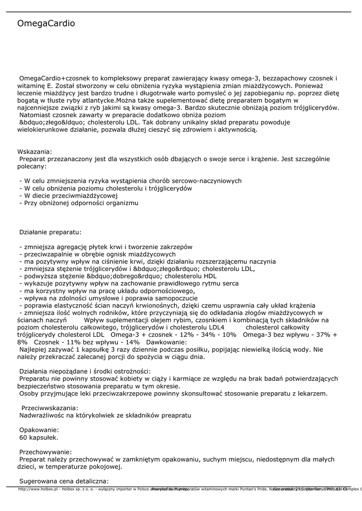 OmegaCardio OmegaCardio+czosnek to kompleksowy preparat zawierający kwasy omega-3, bezzapachowy czosnek i witaminę E. Został stworzony w celu obniżenia ryzyka wystąpienia zmian miażdżycowych. Ponieważ leczenie miażdżycy jest bardzo trudne i długotrwałe warto pomysleć o jej zapobieganiu np. poprzez dietę bogatą w tłuste ryby atlantycke.Można także supelementować dietę preparatem bogatym w najcenniejsze związki z ryb jakimi są kwasy omega-3. Bardzo skutecznie obniżają poziom trójglicerydów. Natomiast czosnek zawarty w preparacie dodatkowo obniża poziom „złego“ cholesterolu LDL. Tak dobrany unikalny skład preparatu powoduje wielokierunkowe działanie, pozwala dłużej cieszyć się zdrowiem i aktywnością. Wskazania: Preparat przezanaczony jest dla wszystkich osób dbających o swoje serce i krążenie. Jest szczególnie polecany: - W celu zmniejszenia ryzyka wystąpienia chorób sercowo-naczyniowych W celu obniżenia poziomu cholesterolu i trójglicerydów W diecie przeciwmiażdżycowej Przy obniżonej odporności organizmu Działanie preparatu: - zmniejsza agregację płytek krwi i tworzenie zakrzepów - przeciwzapalnie w obrębie ognisk miażdżycowych - ma pozytywny wpływ na ciśnienie krwi, dzięki działaniu rozszerzającemu naczynia - zmniejsza stężenie trójglicerydów i „złego” cholesterolu LDL, - podwyższa stężenie „dobrego” cholesterolu HDL - wykazuje pozytywny wpływ na zachowanie prawidłowego rytmu serca - ma korzystny wpływ na pracę układu odpornościowego, - wpływa na zdolności umysłowe i poprawia samopoczucie - poprawia elastyczność ścian naczyń krwionośnych, dzięki czemu usprawnia cały układ krążenia - zmniejsza ilość wolnych rodników, które przyczyniają się do odkładania złogów miażdżycowych w ścianach naczyń Wpływ suplementacji olejem rybim, czosnkiem i kombinacją tych składników na poziom cholesterolu całkowitego, trójglicerydów i cholesterolu LDL4 cholesterol całkowity trójglicerydy cholesterol LDL Omega-3 + czosnek - 12% - 34% - 10% Omega-3 bez wpływu - 37% + 8% Czosnek - 11% bez wpływu - 14% Dawkowanie: Najlepiej zażywać 1 kapsułkę 3 razy dziennie podczas posiłku, popijając niewielką ilością wody. Nie należy przekraczać zalecanej porcji do spożycia w ciągu dnia. Działania niepożądane i środki ostrożności: Preparatu nie powinny stosować kobiety w ciąży i karmiące ze względu na brak badań potwierdzających bezpieczeństwo stosowania preparatu w tym okresie. Osoby przyjmujące leki przeciwzakrzepowe powinny skonsultować stosowanie preparatu z lekarzem. Przeciwwskazania: Nadwrażliwośc na którykolwiek ze składników preapratu Opakowanie: 60 kapsułek. Przechowywanie: Preparat należy przechowywać w zamkniętym opakowaniu, suchym miejscu, niedostępnym dla małych dzieci, w temperaturze pokojowej. Sugerowana cena detaliczna: http://www.holbex.pl - Holbex sp. z o. o. - wyłączny importer w Polsce amerykańskich Powered by Mambo preparatów witaminowych marki Puritan's Pride. Nasze Generated: produkty 29to: September, Vita-Femin2007, Prenatal 12:49 Complex O 23 zł Suplement diety dostepny w aptekach i sklepach zielarskich. Czy wiesz, że... - Czosnek ogranicza namnażanie pewnego rodzaju bakterii, odpowiedzialnej za rozwój zmian miażdżycowych - Ryby wytwarzają drogocenne kwasy omega-3 z planktonu, którym się żywią. - Wilelotenie obserwacje nawyków żywieniowych Japończyków dowodzą, że długowieczność zawdzięczają diecie obfitującej w kwasy omega-3 pochodzące z ryb. - Nienasycone kwasy tłuszczowe szybko ulegają utleniuniu i zepsuciu, dlatego kupując preparaty z omega-3 należy zwracać uwagę, czy zawierają witaminę E, która zapobiega temu procesowi. Źródła informacji: 1. Holub BJ. Fish oils and cardiovascular disease, CMAJ 1989; 141: 1063.171s-5s 2. Kłosiewicz-Latoszek L. Znaczenie kwasów tłuszczowych omega-3 w profilaktyce chorób sercowonaczyniowych. Żywienie człowieka i metabolizm, 2002, XXIX, nr ½, 78-86 3. Lutomski J. Fascynacja czosnkiem – wczoraj i dziś, Postępy Fitoterapii zeszyt 5 (1/2001) 4. Adler, Adam J and Holub, Bruce J. Effect of garlic and fish-oil supplementation on serum lipid and lipoprotein concentrations in hypercholesterolemic men. Am J Clin Nutr, Vol. 65, February 1997, 445-50 http://www.holbex.pl - Holbex sp. z o. o. - wyłączny importer w Polsce amerykańskich Powered by Mambo preparatów witaminowych marki Puritan's Pride. Nasze Generated: produkty 29to: September, Vita-Femin2007, Prenatal 12:49 Complex O