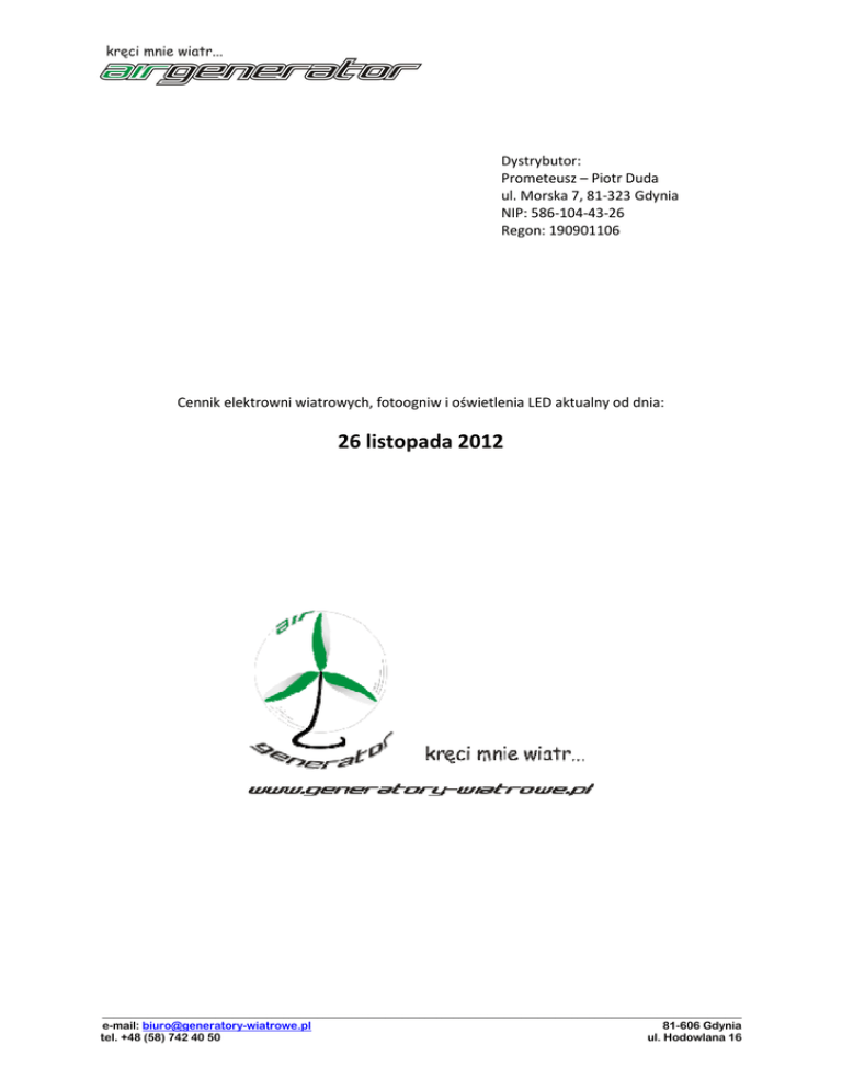 Dystrybutor: Prometeusz – Piotr Duda ul. Morska 7, 81-323 Gdynia NIP: 586-104-43-26 Regon: 190901106 Cennik elektrowni wiatrowych, fotoogniw i oświetlenia LED aktualny od dnia: 26 listopada 2012 _________________________________________________________________________________________________________________ e-mail: [email protected] 81-606 Gdynia tel. +48 (58) 742 40 50 ul. Hodowlana 16 www.generatory-wiatrowe.pl __________________________________________________________________________________ Spis treści Elektrownia wiatrowa M300 ................................................................................................................... 3 Elektrownia wiatrowa M400 (M+) .......................................................................................................... 4 Elektrownia wiatrowa SkyWing (S-series) ............................................................................................... 5 Elektrownia wiatrowa AirGenerator (E/EW-series) ................................................................................ 6 Elektrownia wiatrowa Ventus (Y-type).................................................................................................... 7 Pionowa elektrownia wiatrowa VAWT (M-type) .................................................................................... 8 Zaawansowane elektrownie wiatrowe FD-series.................................................................................... 9 Maszty do elektrowni wiatrowych ........................................................................................................ 10 Elektronika do wiatraków i fotoogniw .................................................................................................. 11 Fotoogniwa QXPV .................................................................................................................................. 12 Oświetlenie uliczne, parkowe i ogrodowe ............................................................................................ 13 Główne atuty ulicznych lamp LED ......................................................................................................... 14 Kolektory słoneczne do grzania wody ................................................................................................... 15 Miejsce na notatki ................................................................................................................................. 16 _________________________________________________________________________________________________________________ e-mail: [email protected] 81-606 Gdynia tel. +48 (58) 742 40 50 2 ul. Hodowlana 16 www.generatory-wiatrowe.pl __________________________________________________________________________________ Elektrownia wiatrowa M300 Zestaw podstawowy z wbudowanym kontrolerem do ładowania akumulatora 12V/(24V) Komplet do samodzielnego montażu z przeznaczeniem do zastosowań mobilnych (jacht, kemping). Służy głównie do zasilania oświetlenia. Może być wykorzystany do zasilania oświetlenia znaków drogowych lub zasilania małych przekaźników sygnałowych. Moc znamionowa 100W, maksymalna 300W. Po prawej zestaw części montażowych: Cena zestawu: 1289 zł _________________________________________________________________________________________________________________ e-mail: [email protected] 81-606 Gdynia tel. +48 (58) 742 40 50 3 ul. Hodowlana 16 www.generatory-wiatrowe.pl __________________________________________________________________________________ Elektrownia wiatrowa M400 (M+) Zestaw podstawowy z wbudowanym kontrolerem do ładowania akumulatora 12V/(24V) Elektrownia do samodzielnego montażu na rurze ɸ58 Parametry techniczne: Może służyć do zasilania oświetlenia lub odbiorników o mocy nie przekraczającej zwykle 80W. Często we współpracy z fotoogniwami. Krzywa mocy Napięcie znamionowe(DCV) 12/24 Moc Maksymalna(W) 400 Prędkość startowa (M/S) 1.5 Prędkość przetrwania(M/S) 35 Typ generatora PMG Średnica wirnika (M) 1.5 Ilość łopat 3 Materiał łopat Kompozyt Kontroler Wbudowany Ochrona Hamulec elektromagnetyczny Planowana żywotność(lat) 15-20 Opakowanie Skrzynia ze sklejki Wymiary paczki(mm) 118*39*32 Waga brutto(kg) 22 Cena zestawu: 1549 zł _________________________________________________________________________________________________________________ e-mail: [email protected] 81-606 Gdynia tel. +48 (58) 742 40 50 4 ul. Hodowlana 16 www.generatory-wiatrowe.pl __________________________________________________________________________________ Kontroler Light Street model WWS Elektrownia wiatrowa SkyWing (S-series) Zestaw podstawowy 24V/(48V) w komplecie z kontrolerem light street do sterownia oświetleniem. Najczęściej ten model elektrowni jest stosowany do zasilania oświetlenia ulicznego. Zwykle pracuje we współpracy z fotoogniwami. Dzięki zewnętrznemu kontrolerowi z funkcją czasowego i zmierzchowego załączania odbiorników jest najprostszym systemem do autonomicznego zasilania lamp. Czasem wykorzystywana do oświetlenia wysokich masztów. Elektrownia wiatrowa S-series występuje w wersjach o mocach: Model 400W 600W 1000W Moc znamionowa (W) 400 600 1 000 Moc maksymalna (W) 800 1000 1 600 Napięcie znamionowe (DCV) 24 24 24 Prąd znamionowy (DCA) 16 25 41 Średnica wirnika (m) 1,5 1,6 1,8 Startowa prędkość wiatru (m/s) 2,5 2,5 2,5 Znamionowa prędkość wiatru (m/s) 12 13 13 Graniczna prędkość wiatru (m/s) 45 45 45 Rodzaj generatora PMG (generator na magnesy stałe) Masa generatora (kg) 16 16,5 18 Materiał łopaty śmigła włókno węglowe Ilość łopat śmigła 3 3 3 Odchylanie do kierunku wiatru mech. Cena zestawu 400W: 3638 zł Cena zestawu 600W: 4419 zł Cena zestawu 1kW: 5279 zł _________________________________________________________________________________________________________________ e-mail: [email protected] 81-606 Gdynia tel. +48 (58) 742 40 50 5 ul. Hodowlana 16 www.generatory-wiatrowe.pl ______