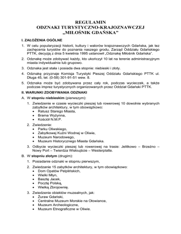REGULAMIN ODZNAKI TURYSTYCZNO-KRAJOZNAWCZEJ „MIŁOŚNIK GDAŃSKA” I. ZAŁOŻENIA OGÓLNE 1. W celu popularyzacji historii, kultury i walorów krajoznawczych Gdańska, jak tez zachęcenia turystów do poznania naszego grodu, Zarząd Oddziału Gdańskiego PTTK, decyzją z dnia 5 kwietnia 1995 ustanowił „Odznakę Miłośnik Gdańska”. 2. Odznakę może zdobywać każdy, kto ukończył 10 lat na terenie administracyjnym miasta indywidualnie lub grupowo. 3. Odznaka jest stała i posiada dwa stopnie: niebieski i złoty. 4. Odznakę przyznaje Komisja Turystyki Pieszej Oddziału Gdańskiego PTTK ul. Długa 45, tel. (0-58) 301-91-51 wew. 8. 5. Odznaka może być zdobywana przez cały rok, podczas wycieczek, a także podczas imprez turystycznych organizowanych przez Oddział Gdański PTTK. II. WARUNKI ZDOBYWANIA ODZNAKI A. W stopniu niebieskim (pierwszym): 1. Zwiedzenie w czasie wycieczki pieszej lub rowerowej 10 dowolnie wybranych zabytków architektury, w tym obowiązkowo: • Ratusz Starego Miasta, • Brama Wyżynna, • Kościół N.M.P. 2. Zwiedzenie: • Parku Oliwskiego, • Zabytkowej Kuźni Wodnej w Oliwie, • Muzeum Narodowego, • Muzeum Historycznego Miasta Gdańska. 3. Odbycie wycieczki pieszej lub rowerowej na trasie: Jelitkowo – Brzeźno – Nowy Port – Twierdza Wisłoujście – Westerplatte. B. W stopniu złotym (drugim): 1. Posiadanie odznaki w stopniu pierwszym, 2. Zwiedzanie 15 zabytków architektury, w tym obowiązkowo: • Dom Opatów Pelplińskich, • Wielki Młyn, • Basztę Jacek, • Pocztę Polską, • Wielką Zbrojownię. 3. Zwiedzenie obiektów muzealnych, jak: • Żuraw Gdański, • Centralne Muzeum Morskie na Ołowiance, • Muzeum Archeologiczne, • Muzeum Etnograficzne w Oliwie. 4. Zwiedzenie Ogrodu Zoologicznego w Oliwie, 5. Uczestniczenie w jednym spektaklu teatralnym w Gdańsku, 6. Odbycie rejsu statkiem na trasie: Gdańsk Zielona Brama – Port Gdański – Westerplatte, 7. Odbycie wycieczki pieszej po terenie Trójmiejskiego Parku Krajobrazowego „Żółtym Szlakiem” na trasie: Gdańsk dw. PKS – Góra Gradowa (punkt widokowy) – Jaśkowa Dolina – Matemblewo – Złota Karczma. Na trasie pomniki przyrody, 8. Odwiedzenie Pomnika Poległych Stoczniowców, 9. Udział w dowolnej imprezie organizowanej przez Oddział Gdański PTTK. C. Normy na stopnie odznaki można zdobywać: − w stopniu niebieskim (pierwszym) w ciągu jednego roku (12 m-cy), − w stopniu złotym (drugim) w ciągu trzech kolejnych lat (36 m-cy). D. W jednym roku można zdobyć tylko jeden stopień odznaki, E. Zwiedzane obiekty i tereny nie mogą się powtarzać przy zdobywaniu wyższego stopnia odznaki, F. Punkty zdobyte na Odznakę Turystyczno-Krajoznawczą „Miłośnik Gdańska”, można równocześnie zaliczać przy zdobywaniu innych odznak turystycznych i krajoznawczych PTTK, G. Ubiegający się o przyznanie odznaki danego stopnia obowiązany jest przedstawić weryfikatorowi informacje zawierające jego imię, nazwisko, adres, rok urodzenia i zestawienie odbytych i potwierdzonych, wymaganych regulaminem wycieczek i imprez. Sposób opracowania dokumentacji jest dowolny. Potwierdzenia należy uzyskiwać u kierowników wycieczek, przewodników, przodowników turystyki kwalifikowanej, instruktorów krajoznawstwa, a także bezpośrednio w obiektach zwiedzanych lub ich sąsiedztwie. III. POSTANOWIENIA KOŃCOWE 1. Podstawą dającą prawo zakupu odznaki jest zapis weryfikacyjny Komisji Turystyki Pieszej Oddziału Gdańskiego PTTK. 2. Za wybitne zasługi i osiągnięcia w działalności na rzecz Gdańska oraz dla turystyki i krajoznawstwa na terenie Gdańska odznaka może być przyznana Honorowo przez Zarząd Oddziału Gdańskiego PTTK. 3. Interpretacja regulaminu należy do Zarządu Oddziału Gdańskiego PTTK. 4. Odznakę można zakupić w biurze Oddziału Gdańskiego PTTK przy ul. Długiej 45. 5. Niniejszy regulamin zatwierdzony został przez Zarząd Główny PTTK. 2