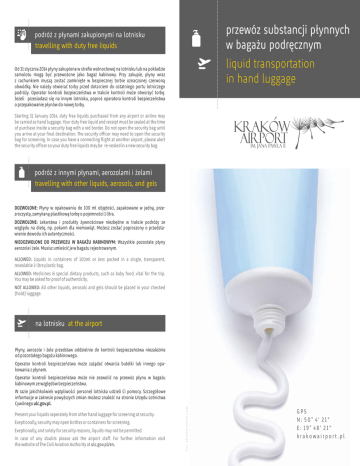 przewóz substancji płynnych w bagażu podręcznym liquid transportation in hand luggage podróż z płynami zakupionymi na lotnisku travelling with duty free liquids Od 31 stycznia 2014 płyny zakupione w strefie wolnocłowej na lotnisku lub na pokładzie samolotu mogą być przewożone jako bagaż kabinowy. Przy zakupie, płyny wraz z rachunkiem muszą zostać zamknięte w bezpiecznej torbie oznaczonej czerwoną obwódką. Nie należy otwierać torby przed dotarciem do ostatniego portu lotniczego podróży. Operator kontroli bezpieczeństwa w trakcie kontroli może otworzyć torbę. Jeżeli przesiadasz się na innym lotnisku, poproś operatora kontroli bezpieczeństwa o przepakowanie płynów do nowej torby. Starting 31 January 2014, duty free liquids purchased from any airport or airline may be carried as hand luggage. Your duty free liquid and receipt must be sealed at the time of purchase inside a security bag with a red border. Do not open the security bag until you arrive at your final destination. The security officer may need to open the security bag for screening. In case you have a connecting flight at another airport, please alert the security officer so your duty free liquids may be re-sealed in a new security bag. podróż z innymi płynami, aerozolami i żelami travelling with other liquids, aerosols, and gels DOZWOLONE: Płyny w opakowaniu do 100 ml objętości, zapakowane w jedną, przezroczystą, zamykaną plastikową torbę o pojemności 1 litra. DOZWOLONE: Lekarstwa i produkty żywnościowe niezbędne w trakcie podróży ze względu na dietę, np. pokarm dla niemowląt. Możesz zostać poproszony o przedstawienie dowodu ich autentyczności. NIEDOZWOLONE DO PRZEWOZU W BAGAŻU KABINOWYM: Wszystkie pozostałe płyny aerozole i żele. Musisz umieścić je w bagażu rejestrowanym. ALLOWED: Liquids in containers of 100ml or less packed in a single, transparent, resealable 1-litre plastic bag. ALLOWED: Medicines & special dietary products, such as baby food, vital for the trip. You may be asked for proof of authenticity. NOT ALLOWED: All other liquids, aerosols and gels should be placed in your checked (hold) luggage. na lotnisku at the airport Płyny, aerozole i żele przedstaw oddzielnie do kontroli bezpieczeństwa niezależnie od pozostałego bagażu kabinowego. Operator kontroli bezpieczeństwa może zażądać otwarcia butelki lub innego opakowania z płynem. W razie jakichkolwiek wątpliwości personel lotniska udzieli Ci pomocy. Szczegółowe informacje w zakresie powyższych zmian możesz znaleźć na stronie Urzędu Lotnictwa Cywilnego ulc.gov.pl. Present your liquids seperately from other hand luggage for screening at security. Exeptionally, security may open bottles or containers for screening. Exeptionally, and solely for security reasons, liquids may not be permitted. In case of any doubts please ask the airport staff. For further information visit the website of The Civil Aviation Authority at ulc.gov.pl/en. fot. shutterstock.com Operator kontroli bezpieczeństwa może nie zezwolić na przewóz płynu w bagażu kabinowym ze względów bezpieczeństwa. GPS N: 50° 4' 21" E: 19° 48' 21" krakowairport.pl Jakie płyny mogę zabrać w bagażu kabinowym? Which liquids can I take on my flight as hand luggage? szczegółowe informacje dot. przewózu płynów, aerozoli i żeli further information on liquids, aerosols and gels Jedynie niektóre kategorie substancji płynnych mogą być przewożone jako bagaż kabinowy. Należy przedstawić je do kontroli bezpieczeństwa. Only certain liquids may be carried as hand luggage and they must be presented at security. Definicja substancji płynnych obejmuje: The definition of Liquids includes: - wodę i inne napoje, zupy, syropy, dżemy, - perfumy, - żele (np. do włosów, kąpieli), - pasty (w tym pasty do zębów), - kosmetyki w płynnej formie (błyszczyk, podkład, tusz do rzęs), - kremy, balsamy, - spraye, - substancje płynne pod ciśnieniem (np. żele do golenia, dezodoranty), - inne substancje o podobnej konsystencji. - water and other drinks, soups, syrups, jams, - perfumes, - gels (e.g. hair gel, bath gel), - pastes (including toothpaste), - cosmetics (lip gloss, foundation, mascara), - cremes, lotions, - sprays, - aerosols (shaving foams, deodorants), - other items of similar consistency. Można zabrać na pokład You can take State: Manufacturer: Płyny w opakowaniach do 100 ml objętości, w jednej przezroczystej, zamykanej torbie o pojemności nie przekraczającej 1 litra (torebki są dostępne w punkcie informacji lotniskowej lub na stanowiskach kontroli bezpieczeństwa). Każdy pasażer może zabrać tylko jedną litrową plastikową torebkę. Leki i inne produkty przeznaczone do użycia w trakcie podróży do celów leczniczych lub ze względu na specjalne wymogi w zakresie diety z uwzględnieniem żywności dla niemowląt. Starting 31 January 2014 Liquids purchased after the security screening at an airport, or on board of a carrier, packed in a special bag (STEB), tightly closed (it shall be packed by a salesperson) with visible proof of purchase or ID of the place of purchase. Receipt place (inside bag) Do not open until nal destination Contents may be conscated if bag is tampered with DO NOT OPEN - or N ame of the Airport -o any other continous messa g e or d sign e r max. 100 ml max. 100 ml max. 100 ml max. 100 ml max. 100 ml max. 100 ml max. 100 ml max. 100 ml max. 100 ml ba g max. 100 ml airport or any other continous message or design over the edge of ba g max. 100 ml Od 31 stycznia 2014 roku Płyny zakupione w strefie wolnocłowej na lotnisku lub na pokładzie przewoźnika, zapakowane w specjalną torbę (STEB) szczelnie zamkniętą (pakowania dokonuje sprzedawca) z widocznym dowodem zakupu lub identyfikatorem miejsca zakupu. DO NOT OPEN - or the name of the airport or any other continous message or design over the edge of Do not open until nal destination Contents may be conscated if bag is tamper