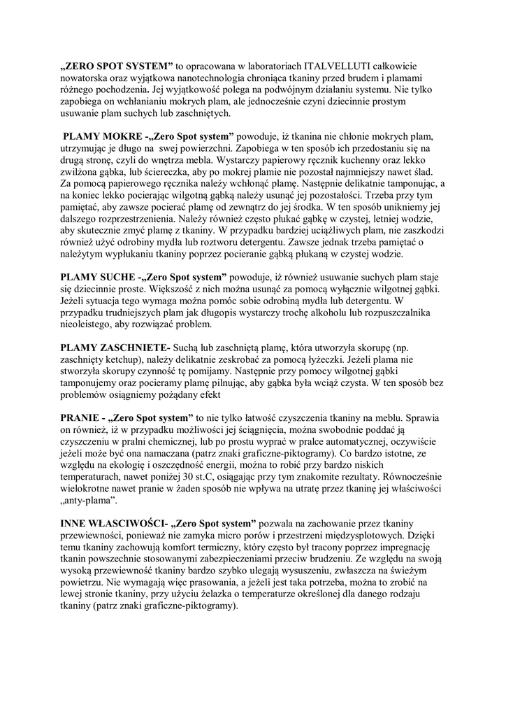 „ZERO SPOT SYSTEM” to opracowana w laboratoriach ITALVELLUTI całkowicie nowatorska oraz wyjątkowa nanotechnologia chroniąca tkaniny przed brudem i plamami różnego pochodzenia. Jej wyjątkowość polega na podwójnym działaniu systemu. Nie tylko zapobiega on wchłanianiu mokrych plam, ale jednocześnie czyni dziecinnie prostym usuwanie plam suchych lub zaschniętych. PLAMY MOKRE -„Zero Spot system” powoduje, iż tkanina nie chłonie mokrych plam, utrzymując je długo na swej powierzchni. Zapobiega w ten sposób ich przedostaniu się na drugą stronę, czyli do wnętrza mebla. Wystarczy papierowy ręcznik kuchenny oraz lekko zwilżona gąbka, lub ściereczka, aby po mokrej plamie nie pozostał najmniejszy nawet ślad. Za pomocą papierowego ręcznika należy wchłonąć plamę. Następnie delikatnie tamponując, a na koniec lekko pocierając wilgotną gąbką należy usunąć jej pozostałości. Trzeba przy tym pamiętać, aby zawsze pocierać plamę od zewnątrz do jej środka. W ten sposób unikniemy jej dalszego rozprzestrzenienia. Należy również często płukać gąbkę w czystej, letniej wodzie, aby skutecznie zmyć plamę z tkaniny. W przypadku bardziej uciążliwych plam, nie zaszkodzi również użyć odrobiny mydła lub roztworu detergentu. Zawsze jednak trzeba pamiętać o należytym wypłukaniu tkaniny poprzez pocieranie gąbką płukaną w czystej wodzie. PLAMY SUCHE -„Zero Spot system” powoduje, iż również usuwanie suchych plam staje się dziecinnie proste. Większość z nich można usunąć za pomocą wyłącznie wilgotnej gąbki. Jeżeli sytuacja tego wymaga można pomóc sobie odrobiną mydła lub detergentu. W przypadku trudniejszych plam jak długopis wystarczy trochę alkoholu lub rozpuszczalnika nieoleistego, aby rozwiązać problem. PLAMY ZASCHNIETE- Suchą lub zaschniętą plamę, która utworzyła skorupę (np. zaschnięty ketchup), należy delikatnie zeskrobać za pomocą łyżeczki. Jeżeli plama nie stworzyła skorupy czynność tę pomijamy. Następnie przy pomocy wilgotnej gąbki tamponujemy oraz pocieramy plamę pilnując, aby gąbka była wciąż czysta. W ten sposób bez problemów osiągniemy pożądany efekt PRANIE - „Zero Spot system” to nie tylko łatwość czyszczenia tkaniny na meblu. Sprawia on również, iż w przypadku możliwości jej ściągnięcia, można swobodnie poddać ją czyszczeniu w pralni chemicznej, lub po prostu wyprać w pralce automatycznej, oczywiście jeżeli może być ona namaczana (patrz znaki graficzne-piktogramy). Co bardzo istotne, ze względu na ekologię i oszczędność energii, można to robić przy bardzo niskich temperaturach, nawet poniżej 30 st.C, osiągając przy tym znakomite rezultaty. Równocześnie wielokrotne nawet pranie w żaden sposób nie wpływa na utratę przez tkaninę jej właściwości „anty-plama”. INNE WŁASCIWOŚCI- „Zero Spot system” pozwala na zachowanie przez tkaniny przewiewności, ponieważ nie zamyka micro porów i przestrzeni międzysplotowych. Dzięki temu tkaniny zachowują komfort termiczny, który często był tracony poprzez impregnację tkanin powszechnie stosowanymi zabezpieczeniami przeciw brudzeniu. Ze względu na swoją wysoką przewiewność tkaniny bardzo szybko ulegają wysuszeniu, zwłaszcza na świeżym powietrzu. Nie wymagają więc prasowania, a jeżeli jest taka potrzeba, można to zrobić na lewej stronie tkaniny, przy użyciu żelazka o temperaturze określonej dla danego rodzaju tkaniny (patrz znaki graficzne-piktogramy).