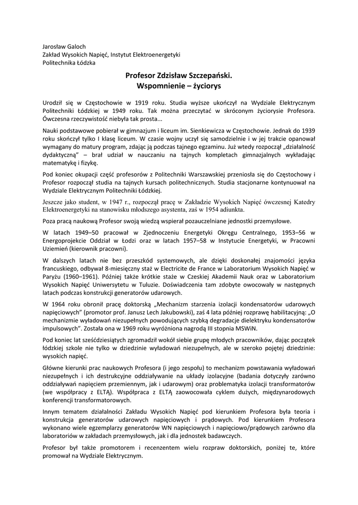 Jarosław Galoch Zakład Wysokich Napięć, Instytut Elektroenergetyki Politechnika Łódzka Profesor Zdzisław Szczepański. Wspomnienie – życiorys Urodził się w Częstochowie w 1919 roku. Studia wyższe ukończył na Wydziale Elektrycznym Politechniki Łódzkiej w 1949 roku. Tak można przeczytać w skróconym życiorysie Profesora. Ówczesna rzeczywistość niebyła tak prosta... Nauki podstawowe pobierał w gimnazjum i liceum im. Sienkiewicza w Częstochowie. Jednak do 1939 roku skończył tylko I klasę liceum. W czasie wojny uczył się samodzielnie i w jej trakcie opanował wymagany do matury program, zdając ją podczas tajnego egzaminu. Już wtedy rozpoczął „działalność dydaktyczną” – brał udział w nauczaniu na tajnych kompletach gimnazjalnych wykładając matematykę i fizykę. Pod koniec okupacji część profesorów z Politechniki Warszawskiej przeniosła się do Częstochowy i Profesor rozpoczął studia na tajnych kursach politechnicznych. Studia stacjonarne kontynuował na Wydziale Elektrycznym Politechniki Łódzkiej. Jeszcze jako student, w 1947 r., rozpoczął pracę w Zakładzie Wysokich Napięć ówczesnej Katedry Elektroenergetyki na stanowisku młodszego asystenta, zaś w 1954 adiunkta. Poza pracą naukową Profesor swoją wiedzą wspierał pozauczelniane jednostki przemysłowe. W latach 1949–50 pracował w Zjednoczeniu Energetyki Okręgu Centralnego, 1953–56 w Energoprojekcie Oddział w Łodzi oraz w latach 1957–58 w Instytucie Energetyki, w Pracowni Uziemień (kierownik pracowni). W dalszych latach nie bez przeszkód systemowych, ale dzięki doskonałej znajomości języka francuskiego, odbywał 8-miesięczny staż w Electricite de France w Laboratorium Wysokich Napięć w Paryżu (1960–1961). Później także krótkie staże w Czeskiej Akademii Nauk oraz w Laboratorium Wysokich Napięć Uniwersytetu w Tuluzie. Doświadczenia tam zdobyte owocowały w następnych latach podczas konstrukcji generatorów udarowych. W 1964 roku obronił pracę doktorską „Mechanizm starzenia izolacji kondensatorów udarowych napięciowych” (promotor prof. Janusz Lech Jakubowski), zaś 4 lata później rozprawę habilitacyjną: „O mechanizmie wyładowań niezupełnych powodujących szybką degradacje dielektryku kondensatorów impulsowych”. Została ona w 1969 roku wyróżniona nagrodą III stopnia MSWiN. Pod koniec lat sześćdziesiątych zgromadził wokół siebie grupę młodych pracowników, dając początek łódzkiej szkole nie tylko w dziedzinie wyładowań niezupełnych, ale w szeroko pojętej dziedzinie: wysokich napięć. Główne kierunki prac naukowych Profesora (i jego zespołu) to mechanizm powstawania wyładowań niezupełnych i ich destrukcyjne oddziaływanie na układy izolacyjne (badania dotyczyły zarówno oddziaływań napięciem przemiennym, jak i udarowym) oraz problematyka izolacji transformatorów (we współpracy z ELTĄ). Współpraca z ELTĄ zaowocowała cyklem dużych, międzynarodowych konferencji transformatorowych. Innym tematem działalności Zakładu Wysokich Napięć pod kierunkiem Profesora była teoria i konstrukcja generatorów udarowych napięciowych i prądowych. Pod kierunkiem Profesora wykonano wiele egzemplarzy generatorów WN napięciowych i napięciowo/prądowych zarówno dla laboratoriów w zakładach przemysłowych, jak i dla jednostek badawczych. Profesor był także promotorem i recenzentem wielu rozpraw doktorskich, poniżej te, które promował na Wydziale Elektrycznym. Ryszard Zybert: Badanie nad możliwością oceny odporności folii propylenowych na degradację wywołaną wyładowaniami niezupełnymi, 1977 r. Włodzimierz Sitek: Weryfikacja schematu zastępczego dielektryku z otwartą szczeliną gazową, 1979 r. Sabina Domaradzka: Badanie napięcia zapłonu wyładowań w układzie dielektryk – metal, 1981 r. Jarosław Galoch: Wybór i zastosowanie najbardziej przydatnej metody do praktycznej analizy pól elektrycznych w transformatorach energetycznych, 1982 r. Zdzisław Paciorek: Badanie wpływu rezystywności powierzchniowej i pojemności jednostkowej materiałów elektroizolacyjnych na rozwój wyładowań ślizgowych, 1982 r. Działalność Profesora nie ograniczała się tylko do aktywności naukowej. Od 1956 do 1966 roku pełnił obowiązki kierownika Zakładu Wysokich Napięć. W latach 1966–1976 był zastępcą kierownika Katedry Wysokich Napięć oraz zastępcą dyrektora Instytutu Transformatorów, Maszyn i Aparatów Elektrycznych. Od 1976 roku aż do śmierci kierował Katedrą Wysokich Napięć. W latach 1969–1973 był prodziekanem Wydziału Elektrycznego, a później, aż do 1981 roku dziekanem. W czasie Jego kadencji nastąpiła znaczna rozbudowa Wydziału o nowe audytoria, bibliotekę. Jednocześnie dzięki Jego staraniom Zakład Wysokich Napięć wzbogacił się o nową halę – laboratorium wysokich napięć. Praca na uczelni wiąże się nierozerwalnie z kształceniem studentów. W tej dziedzinie Profesor był cenionym wykładowcą, szanowanym przez studentów. Uczęszczałem na Jego wykłady i wielokrotnie zastanawiałem się, jak w tamtym czasie mogłem nie rozumieć zagadnień, które Profesor przedstawiał w sposób prosty i często intuicyjnie zrozumiały. Wyróżniało go niezwykle życzliwe traktowanie nie tylko studentów, ale i nas, jego współpracowników. Gdy czasami nie spełnialiśmy jego oczekiwań w pracy zawodowej, dawał nam do zrozumienia, że wie, iż poza uczelnią mamy także życie prywatne. W czasie, gdy był kierownikiem Zakładu/Katedry organizowaliśmy cyklicznie spotkania z naszymi absolwentami. Poniżej jedne z niewielu zachowanych zdjęć z takich spotkań. Spotkanie absolwentów i pracowników Zakładu Wysokich Napięć w 1983 roku - oficjalne powitanie Spotkanie absolwentów i pracowników Zakładu Wysokich Napięć w 1983 roku - panie koleeego!!! (jak pan się urodził to ja już generatory budowałem) Nie zdawaliśmy sobie sprawy, jak często 