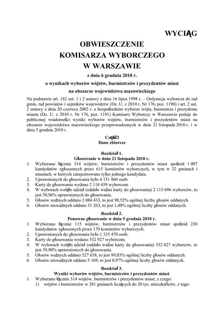 WYCIĄG OBWIESZCZENIE KOMISARZA WYBORCZEGO W WARSZAWIE z dnia 6 grudnia 2010 r. o wynikach wyborów wójtów, burmistrzów i prezydentów miast na obszarze województwa mazowieckiego Na podstawie art. 182 ust. 1 i 2 ustawy z dnia 16 lipca 1998 r. – Ordynacja wyborcza do rad gmin, rad powiatów i sejmików województw (Dz. U. z 2010 r. Nr 176, poz. 1190) i art. 2 ust. 2 ustawy z dnia 20 czerwca 2002 r. o bezpośrednim wyborze wójta, burmistrza i prezydenta miasta (Dz. U. z 2010 r. Nr 176, poz. 1191) Komisarz Wyborczy w Warszawie podaje do publicznej wiadomości wyniki wyborów wójtów, burmistrzów i prezydentów miast na obszarze województwa mazowieckiego przeprowadzonych w dniu 21 listopada 2010 r. i w dniu 5 grudnia 2010 r. Część I Dane zbiorcze 1. 2. 3. 4. 5. 6. 1. 2. 3. 4. 5. 6. 1. Rozdział 1. Głosowanie w dniu 21 listopada 2010 r. Wybierano łącznie 314 wójtów, burmistrzów i prezydentów miast spośród 1 007 kandydatów zgłoszonych przez 615 komitetów wyborczych, w tym w 32 gminach i miastach, w których zarejestrowano tylko jednego kandydata. Uprawnionych do głosowania było 4 151 860 osób. Karty do głosowania wydano 2 118 459 wyborcom. W wyborach wzięło udział (oddało ważne karty do głosowania) 2 115 696 wyborców, to jest 50,96% uprawnionych do głosowania. Głosów ważnych oddano 2 084 433, to jest 98,52% ogólnej liczby głosów oddanych. Głosów nieważnych oddano 31 263, to jest 1,48% ogólnej liczby głosów oddanych. Rozdział 2. Ponowne głosowanie w dniu 5 grudnia 2010 r. Wybierano łącznie 115 wójtów, burmistrzów i prezydentów miast spośród 230 kandydatów zgłoszonych przez 170 komitetów wyborczych. Uprawnionych do głosowania było 1 335 470 osób. Karty do głosowania wydano 532 927 wyborcom. W wyborach wzięło udział (oddało ważne karty do głosowania) 532 827 wyborców, to jest 39,90% uprawnionych do głosowania. Głosów ważnych oddano 527 658, to jest 99,03% ogólnej liczby głosów oddanych. Głosów nieważnych oddano 5 169, to jest 0,97% ogólnej liczby głosów oddanych. Rozdział 3. Wyniki wyborów wójtów, burmistrzów i prezydentów miast Wybierano łącznie 314 wójtów, burmistrzów i prezydentów miast, z czego: 1) wójtów i burmistrzów w 281 gminach liczących do 20 tys. mieszkańców, z tego: 2. 3. 1. 2. 3. a) w głosowaniu w dniu 21 listopada 2010 r. 281 wójtów i burmistrzów, b) w ponownym głosowaniu w dniu 5 grudnia 2010 r. 96 wójtów i burmistrzów; 2) burmistrzów, prezydentów miast w 28 gminach liczących powyżej 20 tys. mieszkańców, z tego: a) w głosowaniu w dniu 21 listopada 2010 r. 28 burmistrzów, prezydentów miast, b) w ponownym głosowaniu w dniu 5 grudnia 2010 r. 17 burmistrzów, prezydentów miast; 3) prezydentów miast w 5 miastach na prawach powiatu, z tego: a) w głosowaniu w dniu 21 listopada 2010 r. 5 prezydentów miast, b) w ponownym głosowaniu w dniu 5 grudnia 2010 r. 2 prezydentów miast. Wybrano łącznie 314 wójtów, burmistrzów, prezydentów miast, z czego: 1) wójtów i burmistrzów w 281 gminach liczących do 20 tys. mieszkańców, z tego: a) w głosowaniu w dniu 21 listopada 2010 r. 185 wójtów i burmistrzów, b) w ponownym głosowaniu w dniu 5 grudnia 2010 r. 96 wójtów i burmistrzów; 2) burmistrzów, prezydentów miast w 28 gminach liczących powyżej 20 tys. mieszkańców, z tego: a) w głosowaniu w dniu 21 listopada 2010 r. 11 burmistrzów, prezydentów miast, b) w ponownym głosowaniu w dniu 5 grudnia 2010 r. 17 burmistrzów, prezydentów miast; 3) prezydentów miast w 5 miastach na prawach powiatu, z tego: a) w głosowaniu w dniu 21 listopada 2010 r. 3 prezydentów miast, b) w ponownym głosowaniu w dniu 5 grudnia 2010 r. 2 prezydentów miast. W 115 gminach i miastach, z czego: 1) w 96 gminach liczących do 20 tys. mieszkańców, 2) w 17 gminach liczących powyżej 20 tys. mieszkańców, 3) w 2 miastach na prawach powiatu, przeprowadzono ponowne głosowanie w dniu 5 grudnia 2010 r. z uwagi na nieuzyskanie przez kandydata na wójta, burmistrza lub prezydenta miasta, wymaganej większości ważnie oddanych głosów za wyborem w głosowaniu przeprowadzonym w dniu 21 listopada 2010 r. Część II Szczegółowe wyniki wyborów wójtów, burmistrzów i prezydentów miast na obszarze województwa mazowieckiego Rozdział 187 Wybory Wójta Gminy Krasne Wyboru dokonano, ponieważ w wyborach spośród 2 kandydatów, wymaganą liczbę głosów uzyskał KOŁAKOWSKI Paweł zgłoszony przez KWW WÓJTA PAWŁA. Liczba osób uprawnionych do głosowania wynosiła 3 172. W wyborach wzięło udział (oddało ważne karty do głosowania) 1 826 wyborców, co stanowi 57,57% uprawnionych do głosowania. Komisarz Wyborczy / - / Dorota Tyrała