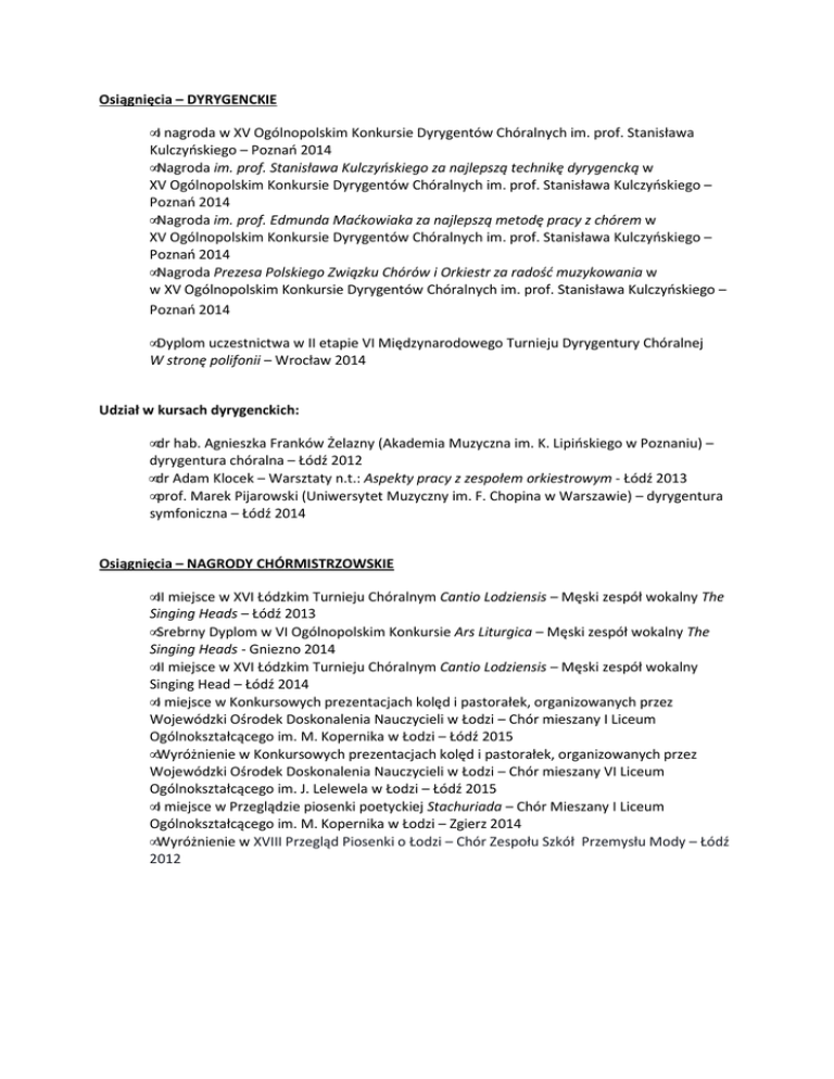 Osiągnięcia – DYRYGENCKIE •I nagroda w XV Ogólnopolskim Konkursie Dyrygentów Chóralnych im. prof. Stanisława Kulczyńskiego – Poznań 2014 •Nagroda im. prof. Stanisława Kulczyńskiego za najlepszą technikę dyrygencką w XV Ogólnopolskim Konkursie Dyrygentów Chóralnych im. prof. Stanisława Kulczyńskiego – Poznań 2014 •Nagroda im. prof. Edmunda Maćkowiaka za najlepszą metodę pracy z chórem w XV Ogólnopolskim Konkursie Dyrygentów Chóralnych im. prof. Stanisława Kulczyńskiego – Poznań 2014 •Nagroda Prezesa Polskiego Związku Chórów i Orkiestr za radość muzykowania w w XV Ogólnopolskim Konkursie Dyrygentów Chóralnych im. prof. Stanisława Kulczyńskiego – Poznań 2014 •Dyplom uczestnictwa w II etapie VI Międzynarodowego Turnieju Dyrygentury Chóralnej W stronę polifonii – Wrocław 2014 Udział w kursach dyrygenckich: •dr hab. Agnieszka Franków Żelazny (Akademia Muzyczna im. K. Lipińskiego w Poznaniu) – dyrygentura chóralna – Łódź 2012 •dr Adam Klocek – Warsztaty n.t.: Aspekty pracy z zespołem orkiestrowym - Łódź 2013 •prof. Marek Pijarowski (Uniwersytet Muzyczny im. F. Chopina w Warszawie) – dyrygentura symfoniczna – Łódź 2014 Osiągnięcia – NAGRODY CHÓRMISTRZOWSKIE •II miejsce w XVI Łódzkim Turnieju Chóralnym Cantio Lodziensis – Męski zespół wokalny The Singing Heads – Łódź 2013 •Srebrny Dyplom w VI Ogólnopolskim Konkursie Ars Liturgica – Męski zespół wokalny The Singing Heads - Gniezno 2014 •II miejsce w XVI Łódzkim Turnieju Chóralnym Cantio Lodziensis – Męski zespół wokalny Singing Head – Łódź 2014 •I miejsce w Konkursowych prezentacjach kolęd i pastorałek, organizowanych przez Wojewódzki Ośrodek Doskonalenia Nauczycieli w Łodzi – Chór mieszany I Liceum Ogólnokształcącego im. M. Kopernika w Łodzi – Łódź 2015 •Wyróżnienie w Konkursowych prezentacjach kolęd i pastorałek, organizowanych przez Wojewódzki Ośrodek Doskonalenia Nauczycieli w Łodzi – Chór mieszany VI Liceum Ogólnokształcącego im. J. Lelewela w Łodzi – Łódź 2015 •I miejsce w Przeglądzie piosenki poetyckiej Stachuriada – Chór Mieszany I Liceum Ogólnokształcącego im. M. Kopernika w Łodzi – Zgierz 2014 •Wyróżnienie w XVIII Przegląd Piosenki o Łodzi – Chór Zespołu Szkół Przemysłu Mody – Łódź 2012 Osiągnięcia – KOMPOZYTORSKIE •Stypendium kompozytorskie Bruno-Frey-Musikpreis-Förderpreis 2013 – Landesakdemie für die musizierende Jugend in Baden- Württemberg – Ochsenhausen 2013 •Udział w Międzynarodowych warsztatach kompozytorskich 3. Europäisches Chorforum für junge Komponisten – Ochsenhausen 2012 Prawykonania i wykonania kompozycji chóralnych: •15 kwietnia 2012 r., Łódź, Akademicki ośrodek inicjatyw artystycznych; Łódź ma to coś (prawykonanie) Wykonawca: Chór Zespołu Szkół Przemysłu Mody w Łodzi, dyr. Mariusz Lewy •8 września 2012 r., Niemcy Ochsenhausen: Gift oraz Psalm 102 (prawykonania) Wykonawca: Orpheus Ensamble, dyr. Bo Holten •7 lipca 2013 r., Grotniki, Kościół Parafialny pw. Niepokalanego Poczęcia NMP Alleluja (prawykonanie) Wykonawca: Męski Zespół Wokalny The Singing Heads, dyr. Mariusz Lewy •16 listopad 2013 r., Łódź, Łódzki Dom Kultury Na gałązce do wiersza J. Tuwima Ptak (prawykonanie) Wykonawca: Chór Nauczycielski w Łodzi, dyr. Maria Hubluk •1 grudnia 2013 r., Łódź, Parafia Najświętszego imienia Jezus Psalm 102 Wykonawca: Chór mieszany ZSM im. S. Moniuszki w Łodzi, dyr. Patryk Kobylarczyk i Dawid Ber •11 marca 2014 Łódź r., Filharmonia Łódzka Leć głosie po rosie Wykonawca: Chór Filharmonii Łódzkiej im. A. Rubinsteina, dyr. Dawid Ber •30 marca 2014 r., Łódź, Sala koncertowa WSP Na gałązce do wiersza J. Tuwima Ptak (prawykonanie) Wykonawca: Chór Nauczycielski w Łodzi, dyr. Maria Hubluk •12 kwiecień 2014 r., Zgierz, Kościół Opatrzności Bożej Stabat Mater Wykonawca: Męski Zespół Wokalny The Singing Heads, dyr. Mariusz Lewy •11 września 2014 r., Łódź, Parafia Najświętszego imienia Jezus Gift Wykonawca: Chór kameralny Vivid Singers, dyr. Dawid Ber •19 października 2014 r., Łowicz, Bazylika Katedralna Psalm (nagranie na płytę DVD) Wykonawca: Chór Filharmonii Łódzkiej im. A. Rubinsteina, dyr. Dawid Ber •22 listopada 2014 r., Zgierz, Miejski Ośrodek Kultury w Zgierzu Jednoskrzydli Wykonawca: Chór I LO im. M. Kopernika w Łodzi, dyr. Mariusz Lewy •Szereg aranżacji i opracowań utworów chóralnych Wykonawcy: Męski Zespół Wokalny The Singing Heads, Chór amatorski Filharmonii Łódzkiej im. A. Rubinsteina dla (nie)opornych, Chór mieszany I LO w Łodzi, Zespół wokalny VI LO w Łodzi, Chór dziecięcym SM I st. w Brzezinach Działalność – DYRYGENCKA Ważniejsze koncerty: - 5 marca 2012 r., Muzeum Miasta Łodzi. Egzamin Dyplomowy z dyrygowania zespołami wokalnymi i instrumentalnymi Zespół Wokalny - Ubi Caritas Ola Gjeilo Orkiestra kameralna ODEON - Adagio na smyczki Samuel Barber - 15 kwietnia 2012 r. , Akademicki Ośrodek Inicjatyw Artystycznych w Łodzi . XVIII Przegląd Piosenki o Łodzi - Chór Zespołu Szkół Przemysłu Mody w Łodzi Akkeko ofana no Jesu - oprac. Martin Carbow, Łódź ma to coś - Mariusz Lewy - 14 maja 2012r., ZSM im. Stanisława Moniuszki w Łodzi. Popis zespołów kameralnych - Chór Kameralny Sentito Ubi caritas - Ola Gjeilo, Goodnight sweetharth - 24 listopada 2012r., Miejski Dom Kultury w Radomsku. IV Spotkania Chóralne - Chór Nauczycielski w Łodzi Szła liseczka - oprac. Franciszek Ryling, W moim ogródeczku - Romuald Twardowski, Ciche wierzby pochylone wpół - Leopold Kozłowski, Błogosławiony człowiek (Psalm I) - Wacław z Szamotuł, Tiebie pojem - Dymitr Bortniański - 22 kwietnia 2013 r., Akademia Muzyczna im. Grażyny i Kiejstuta Bacewiczów w Łodzi. Sesja Musica Moderna, Koncert Młodzi Kompozytorzy i Młodzi Wykonawcy Kameralny zespół instrumentalny Antybajka 