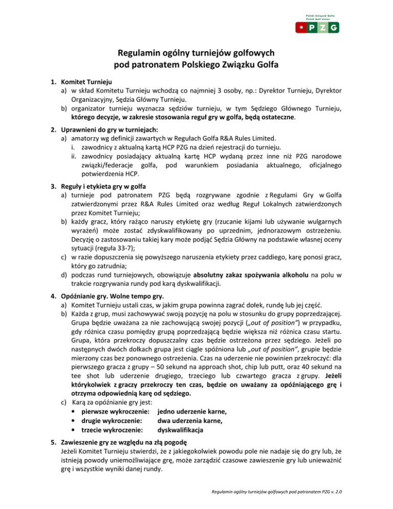 Regulamin ogólny turniejów golfowych pod patronatem Polskiego Związku Golfa 1. Komitet Turnieju a) w skład Komitetu Turnieju wchodzą co najmniej 3 osoby, np.: Dyrektor Turnieju, Dyrektor Organizacyjny, Sędzia Główny Turnieju. b) organizator turnieju wyznacza sędziów turnieju, w tym Sędziego Głównego Turnieju, którego decyzje, w zakresie stosowania reguł gry w golfa, będą ostateczne. 2. Uprawnieni do gry w turniejach: a) amatorzy wg definicji zawartych w Regułach Golfa R&A Rules Limited. i. zawodnicy z aktualną kartą HCP PZG na dzień rejestracji do turnieju. ii. zawodnicy posiadający aktualną kartę HCP wydaną przez inne niż PZG narodowe związki/federacje golfa, pod warunkiem posiadania aktualnego, oficjalnego potwierdzenia HCP. 3. Reguły i etykieta gry w golfa a) turnieje pod patronatem PZG będą rozgrywane zgodnie z Regułami Gry w Golfa zatwierdzonymi przez R&A Rules Limited oraz według Reguł Lokalnych zatwierdzonych przez Komitet Turnieju; b) każdy gracz, który rażąco naruszy etykietę gry (rzucanie kijami lub używanie wulgarnych wyrażeń) może zostać zdyskwalifikowany po uprzednim, jednorazowym ostrzeżeniu. Decyzję o zastosowaniu takiej kary może podjąć Sędzia Główny na podstawie własnej oceny sytuacji (reguła 33-7); c) w razie dopuszczenia się powyższego naruszenia etykiety przez caddiego, karę ponosi gracz, który go zatrudnia; d) podczas rund turniejowych, obowiązuje absolutny zakaz spożywania alkoholu na polu w trakcie rozgrywania rundy pod karą dyskwalifikacji. 4. Opóźnianie gry. Wolne tempo gry. a) Komitet Turnieju ustali czas, w jakim grupa powinna zagrać dołek, rundę lub jej część. b) Każda z grup, musi zachowywać swoją pozycję na polu w stosunku do grupy poprzedzającej. Grupa będzie uważana za nie zachowującą swojej pozycji („out of position”) w przypadku, gdy różnica czasu pomiędzy grupą poprzedzającą będzie większa niż różnica czasu startu. Grupa, która przekroczy dopuszczalny czas będzie ostrzeżona przez sędziego. Jeżeli po następnych dwóch dołkach grupa jest ciągle spóźniona lub „out of position”, grupie będzie mierzony czas bez ponownego ostrzeżenia. Czas na uderzenie nie powinien przekroczyć: dla pierwszego gracza z grupy – 50 sekund na approach shot, chip lub putt, oraz 40 sekund na tee shot lub uderzenie drugiego, trzeciego lub czwartego gracza z grupy. Jeżeli którykolwiek z graczy przekroczy ten czas, będzie on uważany za opóźniającego grę i otrzyma odpowiednią karę od sędziego. c) Karą za opóźnianie gry jest: • pierwsze wykroczenie: jedno uderzenie karne, • drugie wykroczenie: dwa uderzenia karne, • trzecie wykroczenie: dyskwalifikacja 5. Zawieszenie gry ze względu na złą pogodę Jeżeli Komitet Turnieju stwierdzi, że z jakiegokolwiek powodu pole nie nadaje się do gry lub, że istnieją powody uniemożliwiające grę, może zarządzić czasowe zawieszenie gry lub unieważnić grę i wszystkie wyniki danej rundy. Regulamin ogólny turniejów golfowych pod patronatem PZG v. 2.0 6. Zawieszenie gry z powodu niebezpiecznej sytuacji (uwaga do Reg. 6-8b) a) Jeżeli gra zostanie zawieszona przez Komitet Turnieju z powodu niebezpiecznej sytuacji w momencie, gdy zawodnicy znajdują się między dołkami, nie wolno im rozpocząć gry do czasu wznowienia jej przez Komitet Turnieju. Jeżeli zawodnicy są w trakcie rozgrywania dołka, muszą niezwłocznie przerwać grę i postąpić zgodnie z Reg. 6-8.c. Jeżeli zawodnik nie przerwie gry, zostanie on zdyskwalifikowany, chyba, że okoliczności dadzą podstawy do odstąpienia od takiej kary, zgodnie z Reg. 33-7. b) Sygnałem do zawieszenia gry będzie dźwięk syreny: • natychmiastowe przerwanie gry: jeden długi sygnał syreny, • przerwanie gry: trzy następujące po sobie sygnały syreny, • wznowienie gry: dwa krótkie sygnały syreny. 7. Klasyfikacja netto a) W turniejach, w których prowadzona będzie klasyfikacja netto, w celu sklasyfikowania, gracz musi posiadać aktualny HCP (wyświetlany na czarno w bazie HCP PZG). Jeżeli HCP gracza jest nieaktualny (wyświetlany na czerwono w bazie HCP PZG) gracz nie może być klasyfikowany w kategorii netto. 8. Piłki oraz kije golfowe Piłki oraz kije używane w turniejach muszą być dopuszczone do rozgrywek amatorskich przez R&A (www.randa.org/rules/equipment). 9. Reklamy sponsorów i inne a) Informacje na temat dopuszczalnych rozmiarów oraz ilości reklam na ubiorze i sprzęcie gracza dostępna jest na poniższej stronie R&A: (http://www.randa.org/index.cfm?action=rules.amateur.ruleslist&cfid=16631873&cftoken =86341642). b) Jeżeli reklamy na ubiorze lub sprzęcie zawodników będą wykraczały poza ustalone tam normy, zawodnicy zostaną poproszeni o zastosowanie się do przywołanych powyżej zasad. W razie niezastosowania się do polecenia Komitetu Turnieju, zawodnik może podlegać karze dyskwalifikacji. 10. Sprzęt elektroniczny a) Używanie krótkofalówek, telefonów komórkowych oraz pagerów w trakcie gry jest zabronione. Używanie telefonów komórkowych dozwolone jest wyłącznie w celu skontaktowania się z sędzią lub Komitetem Turnieju. b) Dozwolone jest używanie elektronicznych urządzeń do pomiaru odległości, pod warunkiem, że nie można nimi mierzyć innych wartości takich jak: różnice wysokości, temperatura, prędkość i kierunek wiatru. Urządzenia z dodatkowymi opcjami są zabronione, nawet jeśli opcje te są nieużywane podczas gry. 11. Wózki golfowe samojezdne (typu Melex) a) Komitet Turnieju może zezwolić na używanie samojezdnych wózków golfowych w uzasadnionych przypadkach. b) Kara za złamanie reguły: dwa punkty karne za każdy dołek, na którym to nastąpiło; maksymalna kara podczas jednej rundy: cztery uderzenia. Jeżeli złamanie tej reguły miało miejsce pomiędzy dwoma dołkami, kara dwóch uderzeń wymierzona jest na drugim dołku. 12. Wózki golfowe elektryczne Wózki elektryczne są dozwolone