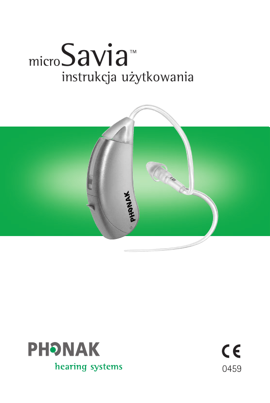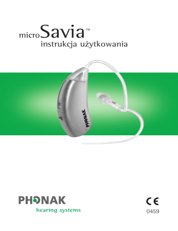 micro Savia instrukcja użytkowania ™ 0459 Spis treści Wprowadzenie 4 Opis budowy aparatu 5 Przygotowanie aparatu do działania Wymiana baterii Identyfikacja aparatów Umieszczanie aparatu za uchem Dopasowanie aparatu microSavia 6 6 10 11 13 Obsługa aparatu Włączanie / wyłączanie Zdalne sterowanie (opcja) 14 14 15 Ważne informacje Etui ochronne Osłona mikrofonu Mikrodźwiękowód i mikrowkładka Istotne wskazówki 18 18 19 20 25 Ostrzeżenia 27 Serwis i informacja o gwarancji 28 Wprowadzenie Gratulujemy wyboru aparatu słuchowego microSavia, najmniejszego i najbardziej zaawansowanego technicznie aparatu firmy Phonak. Aparat microSavia wykorzystuje najnowsze osiągnięcia technologii cyfrowej, oferując doskonałe połączenie miniaturyzacji, możliwości słuchowych i komfortu. Ten niepozorny zauszny aparat słuchowy dostarcza w sposób całkowicie automatyczny najlepszą jakość dźwięku, zrozumienie mowy i komfort słyszenia we wszystkich sytuacjach słuchowych. Aparat microSavia jest najwyższej klasy produktem szwajcarskiej firmy Phonak – znanej na świecie z nowoczesnej technologii słuchowej, innowacji i rzetelności. Prosimy uważnie przeczytać niniejszą instrukcję, aby móc w pełni skorzystać z wszystkich funkcji Twojego nowego aparatu słuchowego. Właściwe użytkowanie zgodnie z instrukcją i pielęgnacja Twojego aparatu microSavia zapewnią doskonałą jakość słyszenia, zrozumienie mowy i prawidłowe jego funkcjonowanie. Jeśli chcesz uzyskać dodatkowe informacje o aparacie microSavia, prosimy odwiedzić stronę internetową firmy Phonak: www.phonak.com; www.phonak.pl Phonak – Twój partner dla lepszego słyszenia! 4 Opis budowy aparatu Wejście mikrofonu z osłoną zabezpieczającą przed wiatrem i zanieczyszczeniami Kieszeń baterii z przełącznikiem włączania/wyłączania Mikrodźwiękowód (wyjście dźwiękowe) Mikrowkładka Element podtrzymujący 5 Przygotowanie aparatu do działania Wymiana baterii Otwórz paznokciem całkowicie kieszeń baterii i wyjmij starą baterię . Zdejmij folię zabezpieczającą z nowej baterii . 6 Włóż nową baterię znakiem „+“ (płaska strona baterii) zgodnie ze znakiem „+”, znajdującym się na kieszeni baterii i zamknij ją . 7 Przygotowanie aparatu do działania Wymiana baterii ! ! ! ! 8 Należy bardzo ostrożnie postępować z kieszenią baterii, nie używać siły. Jeśli w trakcie wymiany baterii wystąpi opór podczas zamykania kieszeni baterii, należy sprawdzić czy bateria została prawidłowo włożona. W przeciwnym razie aparat nie będzie działać. Jeśli aparat nie jest używany, należy pozostawić otwartą kieszeń baterii, aby wyparowała wilgoć. Zalecamy używać baterii tylko sprzedawanych i polecanych przez Twojego protetyka słuchu. Ostrzeżenie o zużyciu baterii Sygnał dźwiękowy informuje o wyczerpywaniu się baterii na około 30 minut przed całkowitym jej zużyciem. W przypadku zastosowania baterii wysokiej jakości czas działania może być dłuższy. Sygnał dźwiękowy w aparacie będzie się powtarzać co każde 30 minut. 9 Przygotowanie aparatu do działania Rozróżnianie aparatów dla lewego i prawego ucha Bardzo ważne jest, aby używać odpowiedniego aparatu do lewego i prawego ucha. Twój protetyk słuchu może oznakować aparaty dla Ciebie, umieszczając kolorową nalepkę na obudowie aparatu pod otwieraną kieszenią baterii. Nalepka widoczna będzie po otworzeniu kieszeni baterii. Stosowany jest następujący system oznaczania: kolor czerwony – prawy aparat kolor niebieski – lewy aparat 10 Nakładanie aparatu microSavia na ucho Umieść aparat słuchowy na górnej części ucha . 11 Przygotowanie aparatu do działania Trzymaj mikrodźwiękowód w miejscu połączenia z miniaturową wkładką i delikatnie wkładaj ją do kanału słuchowego. Wkładkę należy umieścić tak głęboko wewnątrz ucha, aby mikrodźwiękowód przylegał do głowy. Element przytrzymujący od mikrodźwiękowodu umieść w zagłębieniu ucha . 12 Dostosowywanie aparatu microSavia do Twoich osobistych preferencji Istnieje możliwość regulacji głośności w aparacie microSavia za pomocą zdalnego sterowania. Prosimy zwrócić się do swojego protetyka słuchu, aby ademonstrował Ci dostępne piloty współpracujące z aparatem microSavia (patrz: str. 15-17). Aparat microSavia wyposażony jest w funkcję zwaną „DataLoggingplus ”, która zapamiętuje Twoje indywidualne zmiany głośności w aparacie słuchowym. Dane te odczytywane są przez protetyka słuchu podczas kolejnej wizyty kontrolnej. Za pomocą programu komputerowego, używanego do programowania aparatu microSavia, Twój protetyk słuchu może poprawić ustawienia aparatu bazując na Twoich osobistych preferencjach i wcześniejszych poprawkach. 13 Obsługa aparatu Włączanie i wyłączanie Wyłączanie Używając paznokcia delikatnie otwieraj kieszeń baterii do chwili, aż poczujesz „kliknięcie”, oznaczające że aparat jest wyłączony. Włączanie Włączenie aparatu następuje poprzez zamknięcie kieszeni baterii. Twój protetyk słuchu może opóźnić działanie aparatu microSavia o 9 lub 15 sekund natychmiast po jego włączeniu, w celu uniknięcia zakłóceń, podczas zakładania aparatu za ucho. Rozpoczęcie działania aparatu potwierdzane jest sygnałem akustycznym. 14 Zdalne sterowanie (dostępne jako opcja) Piloty do zdalnego sterowania firmy Phonak pozwalają na wygodne i dyskretne sterowanie wszystkimi funkcjami aparatów słuchowych Savia, takimi jak: • zwiększanie głośności, • zminiejszanie głośności, • wybór programu słyszenia. Jeśli nosisz aparaty słuchowe obuusznie, pilot pozwala sterować funkcjami w obu aparatach jednocześnie. Sterowanie obuuszne zapewnia wyrównaną głośność w obu aparatach. Firma Phonak oferuje pełną gamę pilotów do zdalnego sterowania. Poproś swojego protetyka słuchu, aby przedstawił Ci ofertę pilotów i pomógł wybrać model najbardziej o