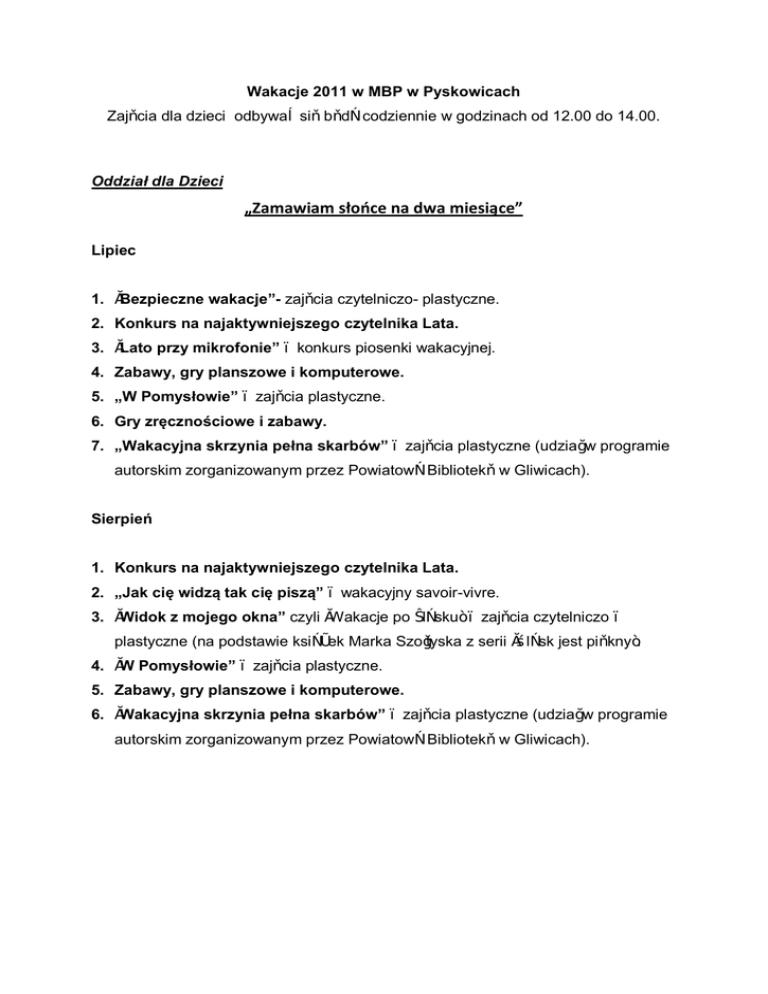 Wakacje 2011 w MBP w Pyskowicach Zajęcia dla dzieci odbywać się będą codziennie w godzinach od 12.00 do 14.00. Oddział dla Dzieci „Zamawiam słońce na dwa miesiące” Lipiec 1. „Bezpieczne wakacje”- zajęcia czytelniczo- plastyczne. 2. Konkurs na najaktywniejszego czytelnika Lata. 3. „Lato przy mikrofonie” – konkurs piosenki wakacyjnej. 4. Zabawy, gry planszowe i komputerowe. 5. „W Pomysłowie” – zajęcia plastyczne. 6. Gry zręcznościowe i zabawy. 7. „Wakacyjna skrzynia pełna skarbów” – zajęcia plastyczne (udział w programie autorskim zorganizowanym przez Powiatową Bibliotekę w Gliwicach). Sierpień 1. Konkurs na najaktywniejszego czytelnika Lata. 2. „Jak cię widzą tak cię piszą” – wakacyjny savoir-vivre. 3. „Widok z mojego okna” czyli „Wakacje po śląsku” – zajęcia czytelniczo – plastyczne (na podstawie książek Marka Szołtyska z serii „Śląsk jest piękny”. 4. „W Pomysłowie” – zajęcia plastyczne. 5. Zabawy, gry planszowe i komputerowe. 6. „Wakacyjna skrzynia pełna skarbów” – zajęcia plastyczne (udział w programie autorskim zorganizowanym przez Powiatową Bibliotekę w Gliwicach). Filia Nr 1 „Śląsk - takie miejsce na Ziemi” 1. Śląskie krajobrazy - zajęcia plastyczne i czytelnicze. 2. Śląskie hobby - zajęcia plastyczne i czytelnicze. 3. Zabawy i zabawki śląskie -zajęcia plastyczne i czytelnicze. 4. Skarbniki, utopce i inne strachy -zajęcia plastyczne i czytelnicze. 5. Śląskie podróże - zajęcia plastyczne i czytelnicze. 6. Wakacyjna skrzynia skarbów- udział w konkursie Powiatowej Biblioteki Publicznej w Gliwicach. 7. Wycieczka do Stobrawskiego Parku Krajobrazowego (lipiec). 8. Wycieczka w Góry Opawskie (sierpień). Zakończenie wakacji 31.08.2011. W poniedziałki spotkania filatelistyczne