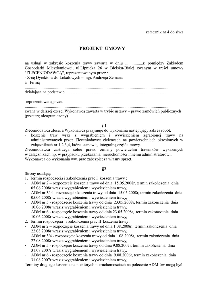 załącznik nr 4 do siwz PROJEKT UMOWY na usługi w zakresie koszenia trawy zawarta w dniu .................r. pomiędzy Zakładem Gospodarki Mieszkaniowej, ul.Lipnicka 26 w Bielsku-Białej zwanym w treści umowy "ZLECENIODAWCĄ", reprezentowanym przez : - Z-cę Dyrektora ds. Lokalowych – mgr. Andrzeja Zemana a Firmą ........................................................................................................................................... działającą na podstawie .................................................................................................... reprezentowaną przez: ........................................................................................................................................... zwaną w dalszej części Wykonawcą zawarta w trybie ustawy – prawo zamówień publicznych (przetarg nieograniczony). §1 Zleceniodawca zleca, a Wykonawca przyjmuje do wykonania następujący zakres robót: - koszenie traw wraz z wygrabieniem i wywiezieniem zgrabionej trawy na administrowanych przez Zleceniodawcę zieleńcach na powierzchniach określonych w załącznikach nr 1,2,3,4, które stanowią integralną część umowy. Zleceniodawca zastrzega sobie prawo zmiany powierzchni trawników wykazanych w załącznikach np. w przypadku przekazania nieruchomości innemu administratorowi. Wykonawca do wykonania ww. prac zabezpiecza własny sprzęt. §2 Strony ustalają: 1. Termin rozpoczęcia i zakończenia prac I koszenia trawy : - ADM nr 2 – rozpoczęcie koszenia trawy od dnia 15.05.2008r, termin zakończenia dnia 05.06.2008r wraz z wygrabieniem i wywiezieniem trawy, - ADM nr 3/ 4 - rozpoczęcie koszenia trawy od dnia 15.05.2008r, termin zakończenia dnia 05.06.2008r wraz z wygrabieniem i wywiezieniem trawy, - ADM nr 5 - rozpoczęcie koszenia trawy od dnia 23.05.2008r, termin zakończenia dnia 10.06.2008r wraz z wygrabieniem i wywiezieniem trawy, - ADM nr 6 - rozpoczęcie koszenia trawy od dnia 23.05.2008r, termin zakończenia dnia 10.06.2008r wraz z wygrabieniem i wywiezieniem trawy, 2. Termin rozpoczęcia i zakończenia prac II koszenia trawy : - ADM nr 2 – rozpoczęcie koszenia trawy od dnia 1.08.2008r, termin zakończenia dnia 22.08.2008r wraz z wygrabieniem i wywiezieniem trawy, - ADM nr 3/4 - rozpoczęcie koszenia trawy od dnia 1.08.2008r, termin zakończenia dnia 22.08.2008r wraz z wygrabieniem i wywiezieniem trawy, - ADM nr 5 - rozpoczęcie koszenia trawy od dnia 9.08.2007r, termin zakończenia dnia 31.08.2007r wraz z wygrabieniem i wywiezieniem trawy, - ADM nr 6 - rozpoczęcie koszenia trawy od dnia 9.08.2006r, termin zakończenia dnia 31.08.2007r wraz z wygrabieniem i wywiezieniem trawy, Terminy drugiego koszenia na niektórych nieruchomościach na polecenie ADM-ów mogą być przesunięte na terminy późniejsze. Z uwagi na warunki atmosferyczne terminy rozpoczęcia i zakończenia ww. prac mogą ulec zmianie pod warunkiem pisemnego uzgodnienia przesunięcia tych terminów pomiędzy Zamawiającym i Wykonawcą. 3.Termin rozpoczęcia prac - III koszenie na wyraźne polecenie Zleceniodawcy. Rozpoczęcie prac związanych z III koszeniem trawy uzgodnione będzie każdorazowo z Kierownikami ADM. 4. Wywóz skoszonej trawy następować będzie w terminie najpóźniej do trzech dni od momentu jej skoszenia. §3 1.Wartość robót określona zostanie kosztorysem powykonawczym po każdorazowym odbiorze robót wg obmiaru zakresu faktycznie wykonanych robót, przemnożonego przez cenę ........... zł/100 m2 (cenę jednostkową netto podaną w ofercie) 2. Całkowita wartość wykonania usługi trzykrotnego koszenia nie może przekroczyć kwoty .......................... zł brutto, słownie :................................................................................. §4 Wykonawca zobowiązuje się każdorazowo do zawiadomienia Zleceniodawcy o zakończeniu kolejnego etapu robót wymienionych w § 1. §5 Zleceniodawca zobowiązuje się każdorazowo po zgłoszeniu wykonania prac przez Wykonawcę, odebrać je w terminie do 5 dni. §6 1. Czynności odbiorowe polegają na dokonaniu oceny zgodności wykonanych robót ze zleceniem oraz oceny jakości robót. Zamawiający może odmówić odbioru robót w następujących przypadkach: - gdy wykonany zakres robót jest inny niż zlecony, - złej jakości wykonanych robót. 2. W przypadku zastrzeżeń co do jakości wykonanych robót Zamawiający może ponadto: - wstrzymać część wynagrodzenia za wykonane roboty do czasu usunięcia usterek, - potrącić część wynagrodzenia z tytułu złej jakości. 3. Odbiory robót odbywać się będą na każdym obiekcie objętym zleceniem. 4. Wykonawca ponosi pełną odpowiedzialność cywilno-prawną za szkody powstałe na skutek niepodjęcia lub niezakończenia robót w ustalonym terminie, powstałe w trakcie wykonywania robót czy też na skutek błędów w wykonaniu itp. §7 Z ramienia Zleceniodawcy obowiązki Inspektora nadzoru sprawować będą: ADM nr 2 – Grażyna Świątnicka i Aleksandra Lenik ADM nr 3/4 – Regina Nikiel ADM nr 5 - Bogusława Fijak ADM nr 6 - Elżbieta Wincenciak §8 1. W przypadku opóźnienia terminów wymienionych w § 2 (rozpoczęcie lub zakończenie prac) potrąca się po 20% wartości jednokrotnego koszenia za każdy dzień przekroczenia terminu za roboty niewykonane w terminie. 2. Za nienależytą jakość wykonania usługi np. niestaranne skoszenie, wygrabienie itp. potrąca się 20 % wartości robót, których wykonania dotyczą. 3. W przypadku niewykonania umowy, Zleceniodawcy przysługuje kara umowna w wysokości wartości umowy. §9 W przypadku nienależytego wykonania umowy (np. niestaranne skoszenie lub zgrabienie itp.) Zleceniodawca pisemnie wyznaczy dodatkowy termin Wykonawcy celem usunięcia nieprawidłowości . W przypadku niedostosowania się Wykonawcy do wyznaczonego terminu Zleceniodawcy przysługuje prawo rozwiązania umowy bez zachowania terminu wypowiedzenia. § 10 1. Zleceniodawca zobowiązuje się do zap