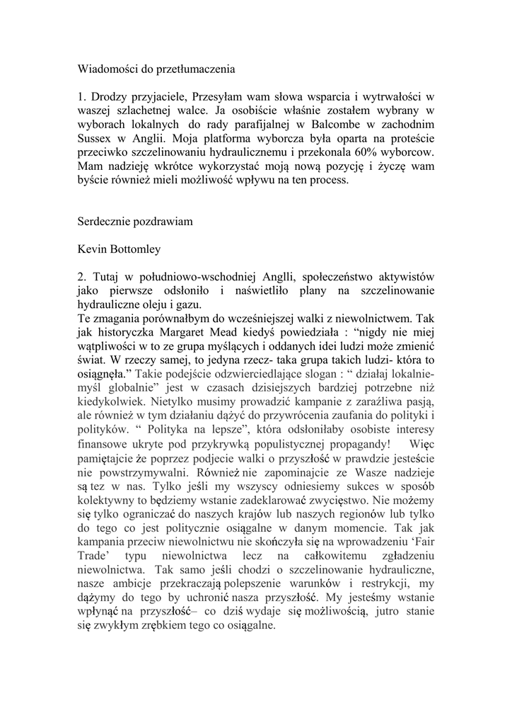 Wiadomości do przetłumaczenia 1. Drodzy przyjaciele, Przesyłam wam słowa wsparcia i wytrwałości w waszej szlachetnej walce. Ja osobiście właśnie zostałem wybrany w wyborach lokalnych do rady parafijalnej w Balcombe w zachodnim Sussex w Anglii. Moja platforma wyborcza była oparta na proteście przeciwko szczelinowaniu hydraulicznemu i przekonala 60% wyborcow. Mam nadzieję wkrótce wykorzystać moją nową pozycję i życzę wam byście również mieli możliwość wpływu na ten process. Serdecznie pozdrawiam Kevin Bottomley 2. Tutaj w południowo-wschodniej Anglli, społeczeństwo aktywistów jako pierwsze odsłoniło i naświetliło plany na szczelinowanie hydrauliczne oleju i gazu. Te zmagania porównałbym do wcześniejszej walki z niewolnictwem. Tak jak historyczka Margaret Mead kiedyś powiedziała : “nigdy nie miej wątpliwości w to ze grupa myślących i oddanych idei ludzi może zmienić świat. W rzeczy samej, to jedyna rzecz- taka grupa takich ludzi- która to osiągnęła.” Takie podejście odzwierciedlające slogan : “ działaj lokalniemyśl globalnie” jest w czasach dzisiejszych bardziej potrzebne niż kiedykolwiek. Nietylko musimy prowadzić kampanie z zaraźliwa pasją, ale również w tym działaniu dążyć do przywrócenia zaufania do polityki i polityków. “ Polityka na lepsze”, która odsłoniłaby osobiste interesy finansowe ukryte pod przykrywką populistycznej propagandy! Więc pamiętajcie że poprzez podjecie walki o przyszłość w prawdzie jesteście nie powstrzymywalni. Również nie zapominajcie ze Wasze nadzieje są tez w nas. Tylko jeśli my wszyscy odniesiemy sukces w sposób kolektywny to będziemy wstanie zadeklarować zwycięstwo. Nie możemy się tylko ograniczać do naszych krajów lub naszych regionów lub tylko do tego co jest politycznie osiągalne w danym momencie. Tak jak kampania przeciw niewolnictwu nie skończyła się na wprowadzeniu ‘Fair Trade’ typu niewolnictwa lecz na całkowitemu zgładzeniu niewolnictwa. Tak samo jeśli chodzi o szczelinowanie hydrauliczne, nasze ambicje przekraczają polepszenie warunków i restrykcji, my dążymy do tego by uchronić nasza przyszłość. My jesteśmy wstanie wpłynąć na przyszłość– co dziś wydaje się możliwością, jutro stanie się zwykłym zrębkiem tego co osiągalne. Więc, jeśli kieruje wami troska o nieodwracalne problemy z lokalną wodą głębinową, albo troska o globalną zmianę klimatu- mam nadzieje że odniesiecie sukces w Waszej walce. Wierzę w to że moja wiara i solidarność z wami nie jest ślepa. Wierzę że zwyciężycie w Waszej walkce o lepszą przyszłość z wystarczającymi zasobami naturalnymi. Dla mnie szelinowanie hydrauliczne podsumowywuje naszą współczesną kulturę- ciągłe poszukiwanie nowych ‘kopalni’- ciągłe ich porzucanie i znow ciągłe poszukiwanie jakiś innych krótkoterminowych rozwiązań. Co powinniśmy wypracować w miejsce takiego krótkoterminowego podejścia to kulturę, która sprawiedliwie nie tylko lokalnie lecz też bioregionalnie wykorzystywałaby nasze naturalne dobra. Więc wysyłam Wam najlepsze życzenia nie tylko do walki przeciwko tym aspektom kapitalizmu , które wyniszczają nasze bogactwa naturalne, lecz także do walki o nową ekonomię, o sile lokalnej odporności i zaparcia, które pozwoli nam razem stawić czoła w nadziei na lepszą przyszłość. Najlepsze życzenia Jonathan Essex A Campaigner i Radny Miasta (Partia Zielonych), Surrey, England 3. Wiadomosc ze wschodniego Kentu dla tych w Polsce walczących ze szczelinowaniem hydraulicznym i jego adwokatów: Wysyłamy Wam najlepsze życzenia sukcesu w Waszej kampanii. Wiedzcie że podzielamy Wasze troski i flustracje i że ubolewamy na tym ze Wasza walka jest jeszcze bardziej tudna niż nasza. Wysyłam specjalne ciepłe pozdrowienia dla moich polskich sióstr, które w tym samym czasie co ja przedstawiały petycje do Unii Europejskiej. Rosie Rechter, aktywistka w walce ze szczelinowaniem hydraulicznym z Kent. 4. “ Ekstrymalna Energia”, włączając w to taką która pochodzi ze szczelinowania hydraulicznego jest zagrożeniem globalnym dla społeczności na całym świecie. Tutaj w Wielkiej Brytanii, pomimo mocnego politycznego wsparcia dla tej formy eksploatacji, inicjatywy i kampanie społeczne przeciwko tej idei odniosły spory sukces. W ostatnich 18 miesiącach odnotowano tylko 5 podań o pozwolenie na szczelinowanie hydrauliczne a w ostatnich 2 latach odnotowaliśmy powstanie ponad 60 nowych grup społecznych i nowych inicjatyw społecznych przeciwko szczelinowaniu hydraulicznemu. W związku z tym wysyłamy wam solidarne życzenia otuchy i wsparcia w Waszej walce przeciwko szczelinowaniu hydraulicznemu. Will Cottrell, członek organizacji ‘frack off’.