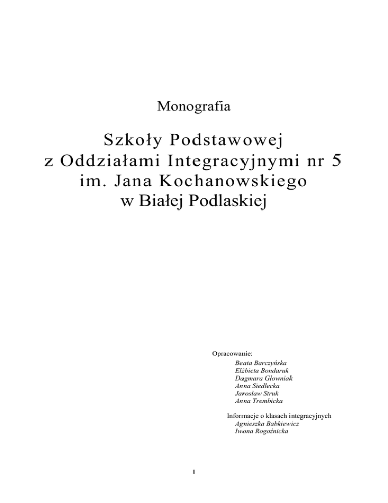 Monografia Szkoły Podstawowej z Oddziałami Integracyjnymi nr 5 im. Jana Kochanowskiego w Białej Podlaskiej Opracowanie: Beata Barczyńska Elżbieta Bondaruk Dagmara Głowniak Anna Siedlecka Jarosław Struk Anna Trembicka Informacje o klasach integracyjnych Agnieszka Babkiewicz Iwona Rogoźnicka 1 SPIS TREŚCI Wstęp …………………………………………………………………...……………. 3 I Krótki rys historyczny Białej Podlaskiej …………………………………..………… 4 II Geneza i rozwój Szkoły Podstawowej nr 5 w Białej Podlaskiej …………………...... 8 III Organizacje działające w szkole …………………………………………….……….. 168 IV Zespół pracowników pedagogicznych …………………………………….………..... 173 Zakończenie …………………………………………………………...……………... 175 Bibliografia …………………………………………………………………...……… 176 2 Wstęp Celem pracy jest wskazanie dziejów i roli społeczno – wychowawczej Szkoły Podstawowej z Oddziałami Integracyjnymi nr 5 im. Jana Kochanowskiego w Białej Podlaskiej na przestrzeni lat 1933 – 2008. Podejmując próbę zbadania wybranego wycinka rzeczywistości musimy przyjąć takie działania, które zapewnią ukazanie wyczerpujących informacji o przedmiocie poznania. Terenem badań była Szkoła Podstawowa nr 5 w Białej Podlaskiej. Placówka mieści się w dwupiętrowym budynku z 1961 roku. W 1989 roku dobudowano jedno skrzydło z 14 salami lekcyjnymi. W 1998 została wzniesiona piękna, nowoczesna hala widowiskowo – sportowa z salami do korektywy, pełnowymiarowym boiskiem, widownią dla kibiców, dziesięcioma łazienkami i prysznicami, zapleczem na przechowywanie sprzętu sportowego. W 2009 roku do gmachu głównego szkoły dołączono pomieszczenia znajdujące się w budynku obok. Szkoła zyskała nowe sale lekcyjne, a dzieci wcześniejszy powrót do domu – lekcje kończyły się wcześniej. W przyłączonej części obok sal lekcyjnych znajduje się gabinet logopedy. Uczniowie szkoły są mieszkańcami Białej Podlaskiej oraz sąsiadujących wiosek: Czosnówki, Janówki oraz Wólki Plebańskiej. Praca składa się z czterech rozdziałów. Rozdział I: „Krótki rys historyczny Białej Podlaskiej.” Prezentuje ważne wydarzenia, które miały wpływ na rozwój miasta. Rozdział II: „Geneza i rozwój szkoły.” Zawiera informacje na temat utworzenia szkoły, istotnych wydarzeń z historii miasta, które wpłynęły na rozwój tej placówki oświatowej. Rozdział III: „Organizacje działające w szkole.” Znajdują się tam informacje na temat ich najważniejszych dokonań i osiągnięć dawniej i dziś. Rozdział IV: „Zespół pracowników pedagogicznych na przestrzeni lat.” 3 I. Krótki rys historyczny Białej Podlaskiej Biała Podlaska, dawniej Radziwiłłowska, położona jest nad rzeką Krzną. Administracyjnie Biała leżała na terenie Wielkiego Księstwa Litewskiego, w latach 1413-1514 wchodziła w skład województwa trockiego, a następnie podlaskiego do 1564 r., a w końcu brzeskiego do 1795. Nazwa miasta według legend pochodzi od Piotra Montygerdowicza, zwanego Białym. Jednak w okresie jego życia Biała była własnością Nasutów, później Zabierzyńskich. Wydaje się raczej, że nazwa jest związana z warunkami glebowymi – bielicami, występującymi na tym terenie. Pierwszym znanym właścicielem Białej był Mikołaj Nasuta, potem jego syn Jan. Następnie dobra poprzez małżeństwo Anny z Nasutów z Janem Juriewiczem Zabierzyńskim przeszły w posiadanie tegoż wojewody trockiego (1498 - 1505) i marszałka ziemskiego litewskiego (1498 - 1508). Po śmierci Zabierzyńskiego Biała przeszła w ręce jego zięcia Jerzego Iwanowicza Ilinicza, który ufundował kościół pod wezwaniem Panny Marii. Po śmierci Jerzego (ok. 1527) dobra odziedziczyły jego dzieci – synowie: Stanisław i Szczęsny oraz córki: Jadwiga wraz z mężem Janem Abramowiczem Ezofowiczem i Hanna wraz z mężem Piotrem Kiszką. Po śmierci Stanisława Ilinicza jego część przeszła na własność siostry Jadwigi, która z kolei odsprzedała ją siostrze Hannie Kiszczynej. Jerzy Ilinicz związany był z Mikołajem Radziwiłłem „Czarnym” wojewodą wileńskim, który w młodości był jego opiekunem i mecenasem. Jerzy Ilinicz pozostając bez potomstwa adoptował syna swego opiekuna Mikołaja Krzysztofa Radziwiłła „Sierotkę”. W 1566 r. odpisał mu część swych dóbr m.in. część Białej należącą do Iliniczów. „Sierotka” w 1594 r. odkupił pozostałą część Białej od Barbary Kiszczyny, wdowy po Mikołaju i tak stał się właścicielem całego miasta. Szczególny rozwój i rozbudowa miasta nastąpiły za najmłodszego syna „Sierotki” – Aleksandra Ludwika, którego zasługą była budowa pałacu trwająca od 1622 r. do końca XVII w. oraz zapoczątkowanie kształtowania struktur samorządowych w mieście. Za czasów Aleksandra Ludwika w 1628 r. założono w Białej szkołę średnią tzw. Akademię Bialską. Twórcą jej był Krzysztof Ciborowicz – Wilski, kanonik i oficjał brzeski, proboszcz bialski. Szkoła rozpoczęła swą działalność w 1631 r., a dwa lata później została podporządkowana Uniwersytetowi Krakowskiemu, który w 1640 r. zatwierdził jej ordynację. Szkoła miała duży wpływ na poziom intelektualny mieszkańców, obyczaje i rozwój ekonomiczny miasta. Ciężkie czasy przyszły w połowie XVII w., kiedy to oddziały kozackie zajęły Białą i dotkliwie ją splądrowały. W 1655 r. do Rzeczypospolitej wkroczyły wojska szwedzkie, Biała uniknęła pożogi wojennej, ale stała się ofiarą oddziałów kozackich Jerzego II Rakoczego. Następnie, podobno zamieszkał w mieście król szwedzki Karol X Gustaw, czemu towarzyszyły grabieże i zniszczenia. W 1660 r. zagroziły miastu tym razem oddzia