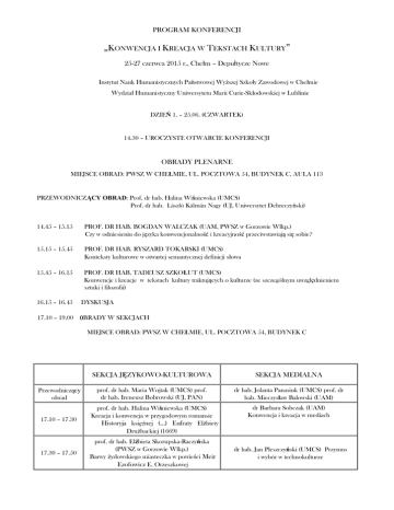 PROGRAM KONFERENCJI „KONWENCJA I KREACJA W TEKSTACH KULTURY” 25-27 czerwca 2015 r., Chełm – Depułtycze Nowe Instytut Nauk Humanistycznych Państwowej Wyższej Szkoły Zawodowej w Chełmie Wydział Humanistyczny Uniwersytetu Marii Curie-Skłodowskiej w Lublinie DZIEŃ 1. – 25.06. (CZWARTEK) 14.30 – UROCZYSTE OTWARCIE KONFERENCJI OBRADY PLENARNE MIEJSCE OBRAD: PWSZ W CHEŁMIE, UL. POCZTOWA 54, BUDYNEK C, AULA 113 PRZEWODNICZĄCY OBRAD: Prof. dr hab. Halina Wiśniewska (UMCS) Prof. dr hab. László Kálmán Nagy (UJ, Uniwersytet Debreczyński) 14.45 – 15.15 PROF. DR HAB. BOGDAN WALCZAK (UAM, PWSZ w Gorzowie Wlkp.) Czy w odniesieniu do języka konwencjonalność i kreacyjność przeciwstawiają się sobie? 15.15 – 15.45 PROF. DR HAB. RYSZARD TOKARSKI (UMCS) Konteksty kulturowe w otwartej semantycznej definicji słowa 15.45 – 16.15 PROF. DR HAB. TADEUSZ SZKOŁUT (UMCS) Konwencje i kreacje w tekstach kultury traktujących o kulturze (ze szczególnym uwzględnieniem sztuki i filozofii) 16.15 – 16.45 DYSKUSJA 17.10 – 19.00 0BRADY W SEKCJACH MIEJSCE OBRAD: PWSZ W CHEŁMIE, UL. POCZTOWA 54, BUDYNEK C Przewodniczący obrad SEKCJA JĘZYKOWO-KULTUROWA SEKCJA MEDIALNA prof. dr hab. Maria Wojtak (UMCS) prof. dr hab. Ireneusz Bobrowski (UJ, PAN) dr hab. Jolanta Panasiuk (UMCS) prof. dr hab. Mieczysław Balowski (UAM) 17.10 – 17.30 prof. dr hab. Halina Wiśniewska (UMCS) Kreacja i konwencja w przygodowym romansie Historyja księżnej (...) Eufraty Elżbiety Drużbackiej (1669) 17.30 – 17.50 prof. dr hab. Elżbieta Skorupska-Raczyńska (PWSZ w Gorzowie Wlkp.) Barwy żydowskiego miasteczka w powieści Meir Ezofowicz E. Orzeszkowej dr Barbara Sobczak (UAM) Konwencja i kreacja w mediach dr hab. Jan Pleszczyński (UMCS) Przymus i wybór w technokulturze 17.50 – 18.10 dr Lucyna Sikorska (PWSZ w Chełmie) Kreowanie obrazu wsi w Placówce Bolesława Prusa prof. dr hab. Małgorzata Kita (UŚ) Internet: nowe środowisko komunikacyjne, nowe konwencje komunikacyjno-językowe 18.10 – 18.30 dr Małgorzata Nowak (KUL) Konwencja i kreacja w Pieśni nad pieśniami Henryka Adamczyka prof. dr hab. Jacek Warchala (UŚ) Reklama – między konwencją a kreacją 18.30 – 19.00 DYSKUSJA DYSKUSJA DZIEŃ 2. – 26.06. (PIĄTEK) MIEJSCE OBRAD: DEPUŁTYCZE NOWE, CENTRUM KONFERENCYJNE SEKCJA JĘZYKOWO-KULTUROWA SEKCJA MEDIALNA Przewodniczący obrad dr hab. Dorota Filar (UMCS) prof. dr hab. Jacek Warchala (UŚ) prof. dr hab. Małgorzata Kita (UŚ) prof. dr hab. Kazimierz Ożóg (URz) 10.00 – 10.20 prof. dr hab. Ireneusz Bobrowski (UJ, PAN) Gramatyka jako tekst kultury dr Agnieszka Kula (UAM) Granice publicystyki – co to jest „autorski program publicystyczny”? 10.20 – 10.40 dr hab. Jolanta Panasiuk (UMCS) Konwencja versus kreakcja w perspektywie praw neurobiologii dr Monika Grzelka (UAM) Sposoby prezentowania stanowiska w dyskusji redakcyjnej 10.40 – 11.00 dr hab. Dorota Piekarczyk (UMCS) Schematy poznawcze – między konwencją a kreacją prof. dr hab. Eliza Grzelak (UAM) Kreacja vs konwencja w e-recenzjach publikowanych na portalu www.booklikes.com 11.00 – 11.30 DYSKUSJA DYSKUSJA SEKCJA JĘZYKOWO-KULTUROWA SEKCJA HISTORYCZNA Przewodniczący obrad dr hab. Iwona Morawska (UMCS) prof. dr hab. Andrzej Sieradzki (UAM) prof. dr hab. Przemysław Łozowski (UMCS) dr Małgorzata Nowak (KUL) 12.00 – 12.20 dr hab. Piotr Krzyżanowski (UMCS) Kryteria kreatywności językowej prof. dr hab. Marek Wożniak (UMCS) (Nie)konwencjonalne dyskursy historyczne 12.20 – 12.40 prof. dr hab. Leonarda Dacewicz (UwB) Stabilność konwencji w tekstach ksiąg metrykalnych w XIX wieku prof. dr hab. Andrzej Stępnik (UMCS) Kreowanie mitów w wiązaniu narracji historycznej 12.40 – 13.00 prof. dr hab. Mieczysław Balowski (UAM) Konwencja i kreacja w tekstach sepulkralnych (na przykładzie nekropolii w Orłowej) prof. dr hab. Robert Litwiński (UMCS) W imię polskiej racji stanu? Kreowane wizerunku służb specjalnych w III Rzeczypospolitej 13.00 – 13.20 dr hab. Paweł Nowak (KUL) Językowy obraz rozstania w tekstach piosenek The National – między konwencją i kreacją mgr Monika Napora (UMCS) „Niecodzienna rzeczywistość” – kreacje przestrzeni życia codziennego w prasie gadzinowej 13.20 – 13.50 DYSKUSJA DYSKUSJA 15.00 – 18.30 OBRADY W SEKCJACH SEKCJA JĘZYKOWO-KULTUROWA SEKCJA EDUKACYJNA Przewodniczący obrad prof. dr hab. Leonarda Dacewicz (UwB) dr hab. Henryk Duda (KUL) dr hab. Dorota Piekarczyk (UMCS) prof. dr hab. Artur Rejter (UŚ) 15.00 – 15.20 prof. dr hab. Bogdan Walczak (UAM, PWSZ w Gorzowie Wlkp.) dr hab. Jolanta Migdał (UAM) Łacińskie creare z rodziną słowotwórczą w dziejach języka polskiego prof. dr hab. Kazimierz Ożóg (URz) Napięcie między konwencją a kreacją w języku młodzieży 15.20– 15.40 dr hab. Michał Szczyszek (UAM) Nowatorskie i konwencjonalne środki słowotwórcze we współczesnej polszczyźnie mówionej mgr Beata Szejgiec (UMCS) Kreatywność w języku licealistów (na przykładzie porównań młodości) 15.40– 16.00 prof. dr hab. Aldona Skudrzyk (UŚ) Presupozycja jako konwencja 16.00 – 16.30 DYSKUSJA DYSKUSJA Przewodniczący obrad dr hab. Marta Wójcicka (UMCS) prof. dr hab. Mariusz Rutkowski (UWM) prof. dr hab. Elżbieta Skorupska-Raczyńska (PWSZ w Gorzowie Wlkp.) dr hab. Michał Szczyszek (UAM) 17.00 – 17.20 prof. dr hab. László Kálmán Nagy (UJ, Uniwersytet Debreczyński) Konwencja hungaropesymizmu jako podstawowy paradygmat współczesnej kultury węgierskiej dr hab. Iwona Morawska (UMCS) Gry z tradycją w kulturze i edukacji polonistycznej 17.20 – 17.40 prof. dr hab. Andrzej Sieradzki (UAM) Kreacja i konwencja – dwa czynniki sprawcze tworzenia polskich nazwisk (okres średniopolski) dr hab. Małgorzata Latoch-Zielińska (UMCS) Konwencjonalne i niekonwencjonalne metody organizowania dialogu ucznia z tekstami kultury 17.40 – 18.00 dr Beata Jarosz (UMCS) Słownik płciowy z 1913 r. w świetle teorii socjolektu prof. dr hab. Leszek T