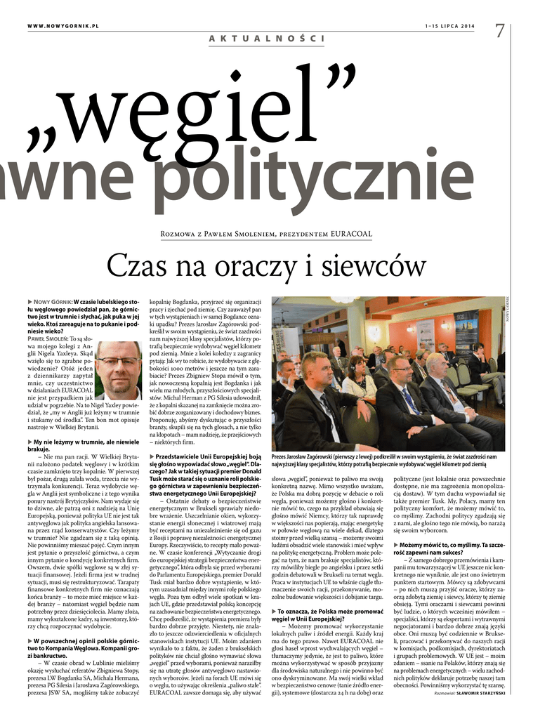 W W W.NOW YGORNIK.PL 1–15 L I P C A 2 014 A K T U A L N O Ś C I „węgiel” 7 awne politycznie Rozmowa z Pawłem Smoleniem, prezydentem EURACOAL XXNowy Górnik: W czasie lubelskiego stołu węglowego powiedział pan, że górnictwo jest w trumnie i słychać, jak puka w jej wieko. Ktoś zareaguje na to pukanie i podniesie wieko? Paweł Smoleń: To są słowa mojego kolegi z Anglii Nigela Yaxleya. Skąd wzięło się to zgrabne powiedzenie? Otóż jeden z dziennikarzy zapytał mnie, czy uczestnictwo w działaniach EURACOAL nie jest przypadkiem jak udział w pogrzebie. Na to Nigel Yaxley powiedział, że „my w Anglii już leżymy w trumnie i stukamy od środka”. Ten bon mot opisuje nastroje w Wielkiej Brytanii. XXMy nie leżymy w trumnie, ale niewiele brakuje. – Nie ma pan racji. W Wielkiej Brytanii nałożono podatek węglowy i w krótkim czasie zamknięto trzy kopalnie. W pierwszej był pożar, drugą zalała woda, trzecia nie wytrzymała konkurencji. Teraz wydobycie węgla w Anglii jest symboliczne i z tego wynika ponury nastrój Brytyjczyków. Nam wydaje się to dziwne, ale patrzą oni z nadzieją na Unię Europejską, ponieważ polityka UE nie jest tak antywęglowa jak polityka angielska lansowana przez rząd konserwatystów. Czy leżymy w trumnie? Nie zgadzam się z taką opinią. Nie powinniśmy mieszać pojęć. Czym innym jest pytanie o przyszłość górnictwa, a czym innym pytanie o kondycję konkretnych firm. Owszem, dwie spółki węglowe są w złej sytuacji finansowej. Jeżeli firma jest w trudnej sytuacji, musi się restrukturyzować. Tarapaty finansowe konkretnych firm nie oznaczają końca branży – to może mieć miejsce w każdej branży – natomiast węgiel będzie nam potrzebny przez dziesięciolecia. Mamy złoża, mamy wykształcone kadry, są inwestorzy, którzy chcą rozpoczynać wydobycie. XXW powszechnej opinii polskie górnictwo to Kompania Węglowa. Kompanii grozi bankructwo. – W czasie obrad w Lublinie mieliśmy okazję wysłuchać referatów Zbigniewa Stopy, prezesa LW Bogdanka SA, Michala Hermana, prezesa PG Silesia i Jarosława Zagórowskiego, prezesa JSW SA, mogliśmy także zobaczyć NOWY GÓRNIK Czas na oraczy i siewców kopalnię Bogdanka, przyjrzeć się organizacji pracy i zjechać pod ziemię. Czy zauważył pan w tych wystąpieniach i w samej Bogdance oznaki upadku? Prezes Jarosław Zagórowski podkreślił w swoim wystąpieniu, że świat zazdrości nam najwyższej klasy specjalistów, którzy potrafią bezpiecznie wydobywać węgiel kilometr pod ziemią. Mnie z kolei koledzy z zagranicy pytają: Jak wy to robicie, że wydobywacie z głębokości 1000 metrów i jeszcze na tym zarabiacie? Prezes Zbigniew Stopa mówił o tym, jak nowoczesną kopalnią jest Bogdanka i jak wielu ma młodych, przyszłościowych specjalistów. Michal Herman z PG Silesia udowodnił, że z kopalni skazanej na zamknięcie można zrobić dobrze zorganizowany i dochodowy biznes. Proponuję, abyśmy dyskutując o przyszłości branży, skupili się na tych głosach, a nie tylko na kłopotach – mam nadzieję, że przejściowych – niektórych firm. XXPrzedstawiciele Unii Europejskiej boją się głośno wypowiadać słowo „węgiel”. Dlaczego? Jak w takiej sytuacji premier Donald Tusk może starać się o uznanie roli polskiego górnictwa w zapewnieniu bezpieczeństwa energetycznego Unii Europejskiej? – Ostatnie debaty o bezpieczeństwie energetycznym w Brukseli sprawiały niedobre wrażenie. Uszczelnianie okien, wykorzystanie energii słonecznej i wiatrowej mają być receptami na uniezależnienie się od gazu z Rosji i poprawę niezależności energetycznej Europy. Rzeczywiście, to recepty mało poważne. W czasie konferencji „Wytyczanie drogi do europejskiej strategii bezpieczeństwa energetycznego”, która odbyła się przed wyborami do Parlamentu Europejskiego, premier Donald Tusk miał bardzo dobre wystąpienie, w którym uzasadniał między innymi rolę polskiego węgla. Poza tym odbył wiele spotkań w krajach UE, gdzie przedstawiał polską koncepcję na zachowanie bezpieczeństwa energetycznego. Chcę podkreślić, że wystąpienia premiera były bardzo dobrze przyjęte. Niestety, nie znalazło to jeszcze odzwierciedlenia w oficjalnych stanowiskach instytucji UE. Moim zdaniem wynikało to z faktu, że żaden z brukselskich polityków nie chciał głośno wymawiać słowa „węgiel” przed wyborami, ponieważ naraziłby się na utratę głosów antywęglowo nastawionych wyborców. Jeżeli na forach UE mówi się o węglu, to używając określenia „paliwo stałe”. EURACOAL zawsze domaga się, aby używać Prezes Jarosław Zagórowski (pierwszy z lewej) podkreślił w swoim wystąpieniu, że świat zazdrości nam najwyższej klasy specjalistów, którzy potrafią bezpiecznie wydobywać węgiel kilometr pod ziemią słowa „węgiel”, ponieważ to paliwo ma swoją konkretną nazwę. Mimo wszystko uważam, że Polska ma dobrą pozycję w debacie o roli węgla, ponieważ możemy głośno i konkretnie mówić to, czego na przykład obawiają się głośno mówić Niemcy, którzy tak naprawdę w większości nas popierają, mając energetykę w połowie węglową na wiele dekad, dlatego stoimy przed wielką szansą – możemy swoimi ludźmi obsadzić wiele stanowisk i mieć wpływ na politykę energetyczną. Problem może polegać na tym, że nam brakuje specjalistów, którzy mówiliby biegle po angielsku i przez setki godzin debatowali w Brukseli na temat węgla. Praca w instytucjach UE to właśnie ciągłe tłumaczenie swoich racji, przekonywanie, mozolne budowanie większości i dobijanie targu. XXTo oznacza, że Polska może promować węgiel w Unii Europejskiej? – Możemy promować wykorzystanie lokalnych paliw i źródeł energii. Każdy kraj ma do tego prawo. Nawet EURACOAL nie głosi haseł wprost wychwalających węgiel – tłumaczymy jedynie, że jest to paliwo, które można wykorzystywać w sposób przyjazny dla środowi