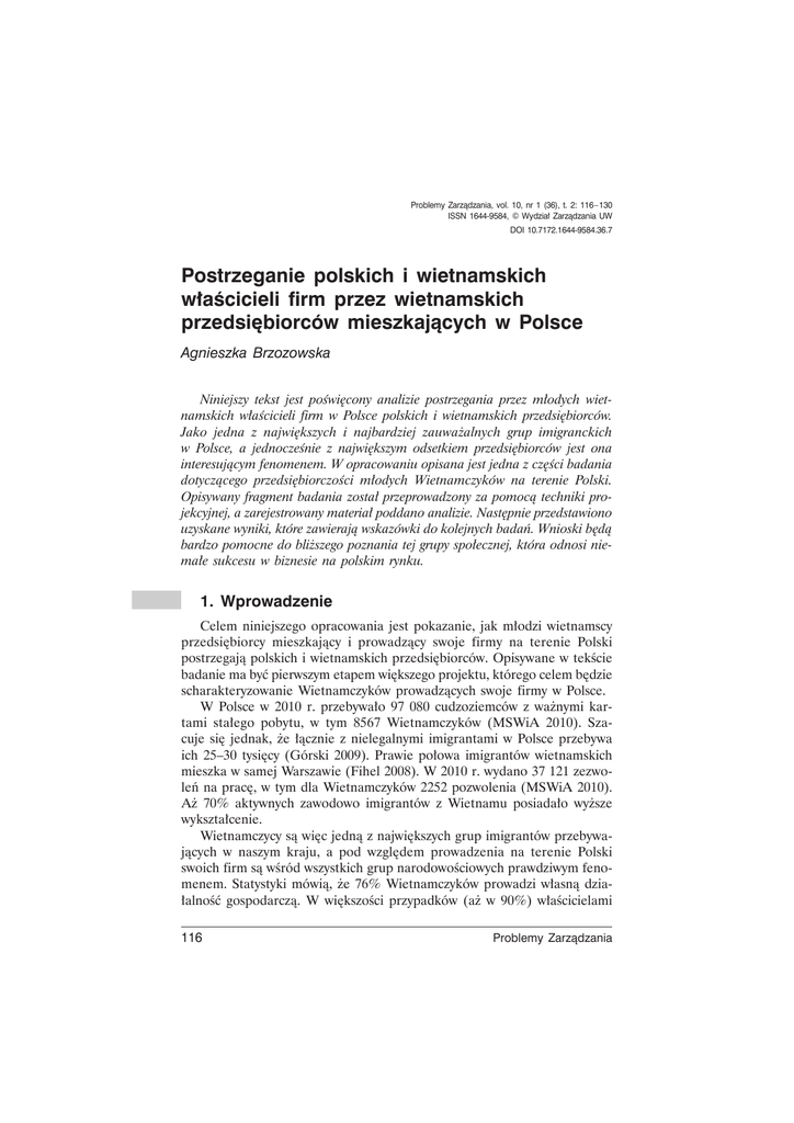 Problemy ZarzÈdzania, vol. 10, nr 1 (36), t. 2: 116 – 130 ISSN 1644-9584, © Wydziaï ZarzÈdzania UW DOI 10.7172.1644-9584.36.7 Postrzeganie polskich i wietnamskich wïaĂcicieli firm przez wietnamskich przedsiÚbiorców mieszkajÈcych w Polsce Agnieszka Brzozowska Niniejszy tekst jest poĂwiÚcony analizie postrzegania przez mïodych wietnamskich wïaĂcicieli firm w Polsce polskich i wietnamskich przedsiÚbiorców. Jako jedna z najwiÚkszych i najbardziej zauwaĝalnych grup imigranckich wb Polsce, a jednoczeĂnie z najwiÚkszym odsetkiem przedsiÚbiorców jest ona interesujÈcym fenomenem. W opracowaniu opisana jest jedna z czÚĂci badania dotyczÈcego przedsiÚbiorczoĂci mïodych Wietnamczyków na terenie Polski. Opisywany fragment badania zostaï przeprowadzony za pomocÈ techniki projekcyjnej, a zarejestrowany materiaï poddano analizie. NastÚpnie przedstawiono uzyskane wyniki, które zawierajÈ wskazówki do kolejnych badañ. Wnioski bÚdÈ bardzo pomocne do bliĝszego poznania tej grupy spoïecznej, która odnosi niemaïe sukcesu w biznesie na polskim rynku. 1. Wprowadzenie Celem niniejszego opracowania jest pokazanie, jak mïodzi wietnamscy przedsiÚbiorcy mieszkajÈcy i prowadzÈcy swoje firmy na terenie Polski postrzegajÈ polskich i wietnamskich przedsiÚbiorców. Opisywane w tekĂcie badanie ma byÊ pierwszym etapem wiÚkszego projektu, którego celem bÚdzie scharakteryzowanie Wietnamczyków prowadzÈcych swoje firmy w Polsce. W Polsce w 2010 r. przebywaïo 97 080 cudzoziemców z waĝnymi kartami staïego pobytu, w tym 8567 Wietnamczyków (MSWiA 2010). Szacuje siÚ jednak, ĝe ïÈcznie z nielegalnymi imigrantami w Polsce przebywa ich 25–30b tysiÚcy (Górski 2009). Prawie poïowa imigrantów wietnamskich mieszka w samej Warszawie (Fihel 2008). W 2010 r. wydano 37 121 zezwoleñ na pracÚ, w tym dla Wietnamczyków 2252 pozwolenia (MSWiA 2010). Aĝ 70% aktywnych zawodowo imigrantów z Wietnamu posiadaïo wyĝsze wyksztaïcenie. Wietnamczycy sÈ wiÚc jednÈ z najwiÚkszych grup imigrantów przebywajÈcych w naszym kraju, a pod wzglÚdem prowadzenia na terenie Polski swoich firm sÈ wĂród wszystkich grup narodowoĂciowych prawdziwym fenomenem. Statystyki mówiÈ, ĝe 76% Wietnamczyków prowadzi wïasnÈ dziaïalnoĂÊ gospodarczÈ. W wiÚkszoĂci przypadków (aĝ w 90%) wïaĂcicielami 116 Problemy ZarzÈdzania Postrzeganie polskich i wietnamskich wïaĂcicieli firm przez wietnamskich... firm sÈ kobiety. WĂród mÚĝczyzn odsetek ten jest niĝszy i wynosi 69% (Fihel, Górny i Kaczmarczyk 2008). Prawie 75% wietnamskich przedsiÚbiorców ma wspólników. W przewaĝajÈcej wiÚkszoĂci, (ponad 90%) wspólnikami sÈ Wietnamczycy. Natomiast w 41% przypadków wspólnikami sÈ Polacy. Wspólnicy najczÚĂciej dobierani sÈ z krÚgu rodziny, a najwiÚkszy odsetek wspólników jest wĂród wspóïmaïĝonków. SieÊ kontaktów wïasnych jest doskonale zorganizowana. Wietnamscy przedsiÚbiorcy chÚtniej zatrudniajÈ Wietnamczyków (Górny 2007), szczególnie tych – jak sami mówiÈ – którzy zostajÈ im poleceni. Wietnamscy imigranci sÈ obecnie grupÈ bardzo widocznÈ, stali siÚ integralnym skïadnikiem ĝycia codziennego w Polsce. Jednak, mimo ĝe przebywajÈ tu od lat 50. ubiegïego wieku, nadal sÈ spoïecznoĂciÈ, o której nie wiemy duĝo, gïównie dlatego, ĝe jej czïonkowie utrzymujÈ kontakty gïównie ze sobÈ. Szczególnie interesujÈca jest kwestia sposobu zarobkowania, jakÈ jest przede wszystkim prowadzenie wïasnych dziaïalnoĂci gospodarczych. Ciekawe jest, czemu tak duĝo Wietnamczyków wybiera wïaĂnie ten sposób zarobkowania i na czym polega róĝnica miÚdzy ich sposobem prowadzenia biznesu a sposobem Polaków, ĝe tak dobrze sobie radzÈ. Szczególnie interesujÈca jest przedsiÚbiorczoĂÊ mïodego pokolenia Wietnamczyków, którzy ze swoimi firmami chcÈ wychodziÊ poza schemat handlu bazarowego oraz budek z jedzeniem. Z jednej strony mïodzi przedsiÚbiorcy zakïadajÈ nowoczesne bary, z nowoczesnym wystrojem, sÈ artystami, projektujÈ nowoczesne przedmioty, zakïadajÈ klubokawiarnie. Z drugiej strony prowadzÈ oni swoje biznesy podobnie do swoich rodziców. PrezentujÈ podobny styl zarzÈdzania firmÈ, przywiÈzanie do tradycji, kult pracy. Aby lepiej poznaÊ tych przedsiÚbiorców, waĝne wydaje siÚ poznanie w pierwszej kolejnoĂci ich podejĂcia do biznesu i postrzegania przedsiÚbiorczoĂci polskiej i wietnamskiej. 2. PrzeglÈd badañ W literaturze opisano zaledwie kilka badañ, które miaïy na celu poznanie spoïecznoĂci wietnamskiej zamieszkujÈcej PolskÚ. WiÚkszoĂÊ dotyczyïa warunków pobytu imigrantów w Polsce i ich adaptacji w naszym kraju, natomiast ĝadne nie dotyczyïo przedsiÚbiorczoĂci Wietnamczyków. Jedno z ciekawszych badañ polegaïo na analizie polskich czasopism pod kÈtem przedstawiania w nich wizerunku wietnamskich imigrantów przebywajÈcych w Polsce (Grzymaïa-Kazïowska 2007: 161–166). Z badania wynika, ĝe przedsiÚbiorczoĂÊ wietnamska w Polsce jest kojarzona gïównie z tanimi produktami, które sÈ masowo importowane do naszego kraju. Przede wszystkim majÈ to byÊ tekstylia bÚdÈce podróbkami ekskluzywnych marek, które nastÚpnie sprzedawane sÈ na polskich bazarach. Oprócz handlu Wietnamczycy majÈ zajmowaÊ siÚ równieĝ tanimi usïugami gastronomicznymi. Kojarzeni sÈ teĝ z duĝÈ ekspansjÈ na polskim rynku oraz sukcesem – do tego stopnia, ĝe w niektórych gazetach prezentowano ich jako zagroĝenie dla vol. 10, nr 1 (36), t. 2, 2012 117 Agnieszka Brzozowska polskich przedsiÚbiorców, szczególnie z branĝy tekstylnej. Do sukcesów, które osiÈgajÈ, maja dochodziÊ dziÚki swoim cechom, takim jak pracowitoĂÊ, samodyscyplina, oszczÚdnoĂÊ, wewnÚtrzna kooperacja i zorganizowanie, ale takĝe dziÚki nielegalnym dziaïaniom, np. ïapówkom, niepïaceniu podatków. SpoïecznoĂÊ wietnamska opisana jest z jeszcze innej perspektywy we wnioskach z sondaĝu przeprowadzonego w 2003 r.