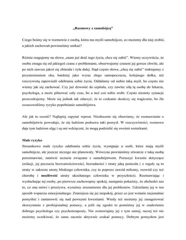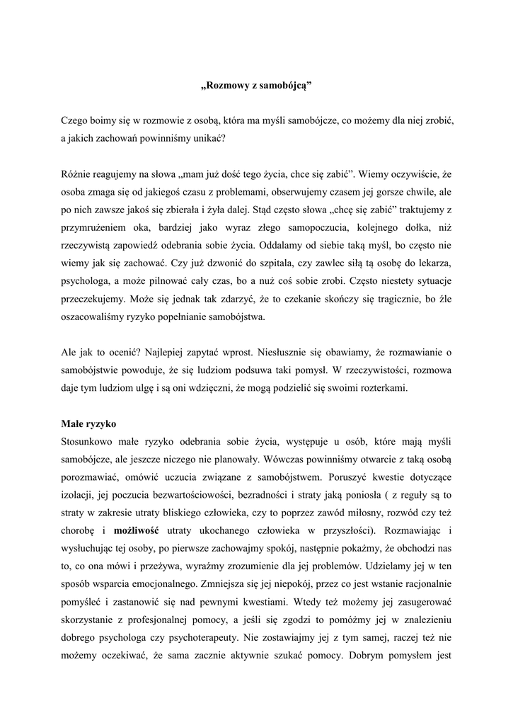 „Rozmowy z samobójcą” Czego boimy się w rozmowie z osobą, która ma myśli samobójcze, co możemy dla niej zrobić, a jakich zachowań powinniśmy unikać? Różnie reagujemy na słowa „mam już dość tego życia, chce się zabić”. Wiemy oczywiście, że osoba zmaga się od jakiegoś czasu z problemami, obserwujemy czasem jej gorsze chwile, ale po nich zawsze jakoś się zbierała i żyła dalej. Stąd często słowa „chcę się zabić” traktujemy z przymrużeniem oka, bardziej jako wyraz złego samopoczucia, kolejnego dołka, niż rzeczywistą zapowiedź odebrania sobie życia. Oddalamy od siebie taką myśl, bo często nie wiemy jak się zachować. Czy już dzwonić do szpitala, czy zawlec siłą tą osobę do lekarza, psychologa, a może pilnować cały czas, bo a nuż coś sobie zrobi. Często niestety sytuacje przeczekujemy. Może się jednak tak zdarzyć, że to czekanie skończy się tragicznie, bo źle oszacowaliśmy ryzyko popełnianie samobójstwa. Ale jak to ocenić? Najlepiej zapytać wprost. Niesłusznie się obawiamy, że rozmawianie o samobójstwie powoduje, że się ludziom podsuwa taki pomysł. W rzeczywistości, rozmowa daje tym ludziom ulgę i są oni wdzięczni, że mogą podzielić się swoimi rozterkami. Małe ryzyko Stosunkowo małe ryzyko odebrania sobie życia, występuje u osób, które mają myśli samobójcze, ale jeszcze niczego nie planowały. Wówczas powinniśmy otwarcie z taką osobą porozmawiać, omówić uczucia związane z samobójstwem. Poruszyć kwestie dotyczące izolacji, jej poczucia bezwartościowości, bezradności i straty jaką poniosła ( z reguły są to straty w zakresie utraty bliskiego człowieka, czy to poprzez zawód miłosny, rozwód czy też chorobę i możliwość utraty ukochanego człowieka w przyszłości). Rozmawiając i wysłuchując tej osoby, po pierwsze zachowajmy spokój, następnie pokażmy, że obchodzi nas to, co ona mówi i przeżywa, wyraźmy zrozumienie dla jej problemów. Udzielamy jej w ten sposób wsparcia emocjonalnego. Zmniejsza się jej niepokój, przez co jest wstanie racjonalnie pomyśleć i zastanowić się nad pewnymi kwestiami. Wtedy też możemy jej zasugerować skorzystanie z profesjonalnej pomocy, a jeśli się zgodzi to pomóżmy jej w znalezieniu dobrego psychologa czy psychoterapeuty. Nie zostawiajmy jej z tym samej, raczej też nie możemy oczekiwać, że sama zacznie aktywnie szukać pomocy. Dobrym pomysłem jest wspólne pójście na pierwszą wizytę. Jednak najważniejsze jest, aby w tym okresie utrzymywać z nią regularny i stały kontakt, obserwować czy jej stan się nie pogarsza. Podpytywać, czy może nie pojawiają się plany dotyczące samobójstwa. Można użyć pytań w stylu: „ Czy zastanawiałeś/łaś się jak chcesz skończyć z życiem?”, „Czy masz dostęp do tabletek, broni, środków chemicznych itd.” - pytamy wprost, ale łagodnym, spokojnym głosem, po wcześniejszym wysłuchaniu, szczerej rozmowie i wzbudzeniu zaufania! Średnie ryzyko Średnie ryzyko popełnienia samobójstwa dotyczy tych osób, które mają zarówno myśli jak i plany samobójcze, ale nie planują samobójstwa natychmiast. Rozmawiamy więc z nimi podobnie jak przy małym ryzyku, a dodatkowo wykorzystujemy tzw. ambiwalencję. Ambiwalencja jest jednym z trzech najczęstszych stanów towarzyszących osobom o skłonnościach samobójczych. Jest to rozdarcie między pragnieniem życia i pragnieniem śmierci: „ Jeśli umrę moje problemy się rozwiążą, ale właściwie chciałabym aby mnie uratowano”. To co musimy wówczas zrobić, to wzmocnić to pragnienie życia, koncentrować się na odczuwanej przez tą osobę ambiwalencji (niepewności), podkreślać ją na każdym kroku, aby sukcesywnie wzmacniać jej wolę życia. Jeśli osoba jest wierząca, to również do jej wiary możemy się odnieść, a w szczególności do tego, co się z nią stanie po śmierci samobójczej. Są to bardzo gorzkie i ciężkie emocjonalnie słowa, ale można ich użyć w ostateczności, aby tą osobę powstrzymać od najgorszego z jej wyborów. Kolejnym krokiem jest zawarcie umowy, tzw. kontraktu. Uzyskujemy więc od tej osoby obietnicę, że nic sobie nie zrobi dopóki nie skontaktuje się ze specjalistą czy szpitalem w określonym czasie. Przy średnim ryzyku popełnienia samobójstwa koniecznie umawiamy wizytę u specjalisty oraz kontaktujemy się z rodziną i przyjaciółmi tej osoby, organizując tak zwaną grupę wsparcia. Duże ryzyko Osoba ma rozwinięte fantazje samobójcze, określony plan, środki i chce odebrać sobie życie natychmiast. Dodatkowo obserwujemy znaczące zmiany w zachowaniu i nastroju, często wyciszenie, uspokojenie, a nawet zdawałoby się poprawę nastroju i co dość łatwo też zauważyć, osoba kończy, domyka pewne niezałatwione do tej pory sprawy. Co robimy? Wzywamy specjalistyczną pomoc, nie zostawiamy tej osoby ani na chwilę samej, rozmawiamy, wspieramy i czekamy na przyjęcie do szpitala. Chce w tym momencie jasno napisać: że każda osoba zgłaszająca się do szpitala z myślami samobójczymi zostanie natychmiast na oddział przyjęta! Czego nie należy robić! Po pierwsze, nie możemy zignorować sytuacji i człowieka! Gdzieś tam w nas tkwi przekonanie, że jeśli ktoś przez jakiś czas zapowiada, że się zabije, to tak w rzeczywistości nie planuje samobójstwa, a chce jedynie zwrócić na siebie uwagę otoczenia. Nie jest to prawda! To bardzo mylne przekonanie, że ci, którzy „straszą” samobójstwem rzadko je popełniają! Około 40 % samobójców w jasny i wyraźny sposób informuje o swych zamiarach, a około 30 % z nich robi to w miesiącach poprzedzających zamach na własne życie! A mówią to głównie własnej rodzinie i przyjaciołom, do najbliższych więc kierują to ostatnie wołanie o pomoc! Od nich oczekują zrozumienia i pomocy. Nie można wówczas pozostawić tej osoby samej i traktować problemu jako nieważnego (przy czym nie 