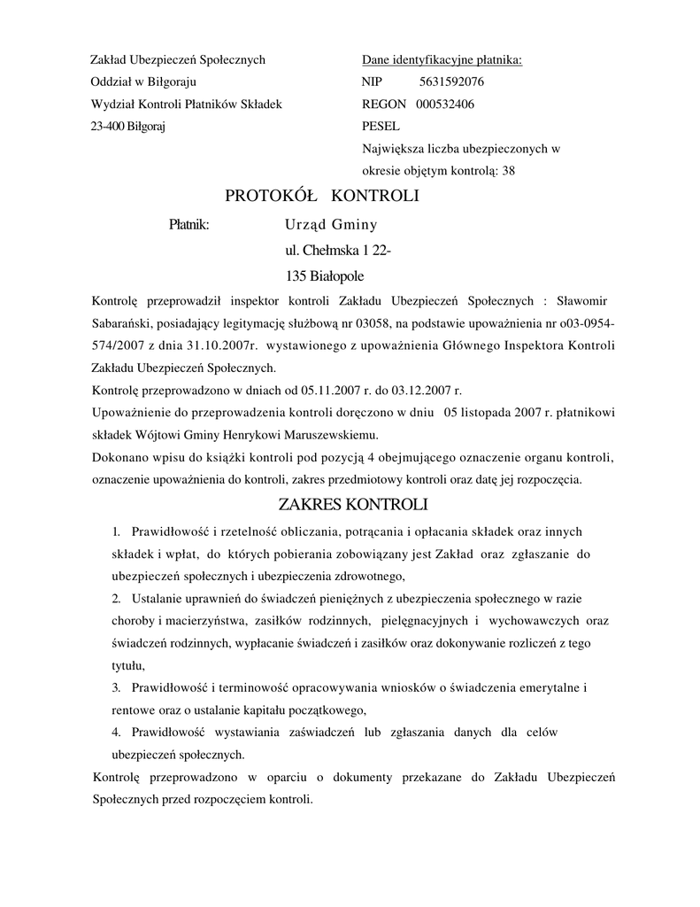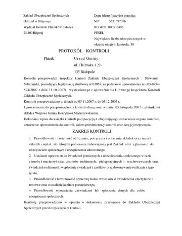 Zakład Ubezpiecze Społecznych Dane identyfikacyjne płatnika: Oddział w Biłgoraju NIP Wydział Kontroli Płatników Składek REGON 000532406 23-400 Biłgoraj PESEL 5631592076 Najwi ksza liczba ubezpieczonych w okresie obj tym kontrol : 38 PROTOKÓŁ KONTROLI Płatnik: Urz d Gminy ul. Chełmska 1 22135 Białopole Kontrol przeprowadził inspektor kontroli Zakładu Ubezpiecze Społecznych : Sławomir Sabara ski, posiadaj cy legitymacj słu bow nr 03058, na podstawie upowa nienia nr o03-0954574/2007 z dnia 31.10.2007r. wystawionego z upowa nienia Głównego Inspektora Kontroli Zakładu Ubezpiecze Społecznych. Kontrol przeprowadzono w dniach od 05.11.2007 r. do 03.12.2007 r. Upowa nienie do przeprowadzenia kontroli dor czono w dniu 05 listopada 2007 r. płatnikowi składek Wójtowi Gminy Henrykowi Maruszewskiemu. Dokonano wpisu do ksi ki kontroli pod pozycj 4 obejmuj cego oznaczenie organu kontroli, oznaczenie upowa nienia do kontroli, zakres przedmiotowy kontroli oraz dat jej rozpocz cia. ZAKRES KONTROLI 1. Prawidłowo i rzetelno obliczania, potr cania i opłacania składek oraz innych składek i wpłat, do których pobierania zobowi zany jest Zakład oraz zgłaszanie do ubezpiecze społecznych i ubezpieczenia zdrowotnego, 2. Ustalanie uprawnie do wiadcze pieni nych z ubezpieczenia społecznego w razie choroby i macierzy stwa, zasiłków rodzinnych, piel gnacyjnych i wychowawczych oraz wiadcze rodzinnych, wypłacanie wiadcze i zasiłków oraz dokonywanie rozlicze z tego tytułu, 3. Prawidłowo i terminowo opracowywania wniosków o wiadczenia emerytalne i rentowe oraz o ustalanie kapitału pocz tkowego, 4. Prawidłowo wystawiania za wiadcze lub zgłaszania danych dla celów ubezpiecze społecznych. Kontrol przeprowadzono w oparciu o dokumenty przekazane do Zakładu Ubezpiecze Społecznych przed rozpocz ciem kontroli. 2 USTALENIA KONTROLI 1. Prawidłowo i rzetelno obliczania, potr cania i opłacania składek oraz innych składek i wpłat, do których pobierania zobowi zany jest Zakład oraz zgłaszanie do ubezpiecze społecznych i ubezpieczenia zdrowotnego. Kontrol obj to okres od 01.05.2004 r. do 31.10.2007 r. Sprawdzono naliczenie składek oraz zgłaszanie do obowi zkowych ubezpiecze społecznych i ubezpieczenia zdrowotnego za okres : maj-grudzie 2004, 2005, 2006, stycze -pa dziernik 2007 r. Ustalono : Płatnik wywi zał si z obowi zku zło enia dokumentu ZUS IWA za lata 2003-2006. Płatnik w okresie obj tym kontrol dokonał zgłoszenia do ubezpiecze osób podlegaj cych obowi zkowo ubezpieczeniom społecznym i ubezpieczeniu zdrowotnemu. Płatnik składek za okres : - od maja 2004 r. do pa dziernika 2004 r., od luty 2005 r. do grudnia 2005 r., stycznia 2006 r. do grudnia 2006 r., stycznia 2007 r. do pa dziernika 2007 r., od wypłaconego wynagrodzenia ************, zatrudnionego w ramach umowy zlecenia i osi gaj cego wynagrodzenie ni sze od minimalnego naliczył składki na Fundusz Pracy. - od maja 2004 r. do pa dziernika 2004 r., od luty 2005 r. do grudnia 2005 r., stycznia 2006 r. do grudnia 2006 r., stycznia 2007 r. do pa dziernika 2007 r., od wypłaconego wynagrodzenia ****************, zatrudnionego w ramach umowy zlecenia i osi gaj cego wynagrodzenie ni sze od minimalnego naliczył składki na Fundusz Pracy. od sierpnia 2006 r. do grudnia 2006 r., od stycznia 2007 r. do pa dziernika 2007 r., od wypłaconego wynagrodzenia **************, zatrudnionego w ramach umowy zlecenia i osi gaj cego wynagrodzenie ni sze od minimalnego naliczył składki na Fundusz Pracy. - za luty 2005 r. od wypłaconego wynagrodzenia ****************, zatrudnionej w niepełnym wymiarze czasu pracy i osi gaj cej wynagrodzenie ni sze od minimalnego naliczył składki na Fundusz Pracy. - za luty 2005 r. od wypłaconego wynagrodzenia *************************, zatrudnionej w niepełnym wymiarze czasu pracy i osi gaj cej wynagrodzenie ni sze od minimalnego naliczył składki na Fundusz Pracy. - za grudzie 2006 r., stycze 2007 r., od wypłaconego wynagrodzenia *************, zatrudnionej w niepełnym wymiarze czasu pracy i osi gaj cej wynagrodzenie ni sze od minimalnego naliczył składki na Fundusz Pracy. - za grudzie 2006 r., stycze 2007 r., od wypłaconego wynagrodzenia *****************zatrudnionego w niepełnym wymiarze czasu pracy i osi gaj cego wynagrodzenie ni sze od minimalnego naliczył składki na Fundusz Pracy. 3 - za maj 2004 r., od lipca 2004 r. do pa dziernika 2004 r., od marca 2005 r. do grudnia 2005 r., za stycze 2006 r., od marca 2006- r. do grudnia 2006 r., za stycze 2007 r., od marca 2007 r. do pa dziernika 2007 r., od wypłaconego wynagrodzenia ************************* zatrudnionego w niepełnym wymiarze czasu pracy i osi gaj cego wynagrodzenie ni sze od minimalnego naliczył składki na Fundusz Pracy. - za listopad 2004 r. od wypłaconych wynagrodze z tytułu umów o prac i umów zlece naliczył składki na Fundusz Pracy w kwocie 1320,27 zł, za grudzie 2004 r. od wypłaconych wynagrodze z tytułu umów o prac i umów zlece naliczył składki na Fundusz Pracy w kwocie 1742,74 zł, za stycze 2005 r. od wypłaconych wynagrodze z tytułu umów o prac i umów zlece naliczył składki na Fundusz Pracy w kwocie 1403,25 zł. Płatnik naliczone składki rozliczył w deklaracjach rozliczeniowych ZUS DRA za okres od maja 2004 r. do pa dziernika 2007 r. Dowód: Kserokopia list płac za okres od maja 2004 r. do pa dziernika 2007 r. (akta kontroli strony 5305) deklaracje rozliczeniowe ZUS DRA za okres od maja 2004 r. do pa dziernika 2007 r. (Kompleksowy system informatyczny ZUS ) - raporty miesi czne ZUS RCA od maja 2004 r. do pa dziernika 2007 r. (Kompleksowy system informatyczny ZUS ) Zgodnie z : art. 53 ust. 1,2 ustawy z dnia 14 grudnia 1994 r. o zatrudnieniu i przeciwdziałaniu bezrobociu (tekst jednolity Dz. U. z 1997 r. Nr 25 poz. 128 z pó n. zm.) art. 104 ust. 1,2 ustawy z dnia 20 kwietnia o promocji zatrudnienia i instytucjach rynku pracy (Dz.U. z 2004 r. Nr 99 poz. 1001 z pó n. zm.), składki n