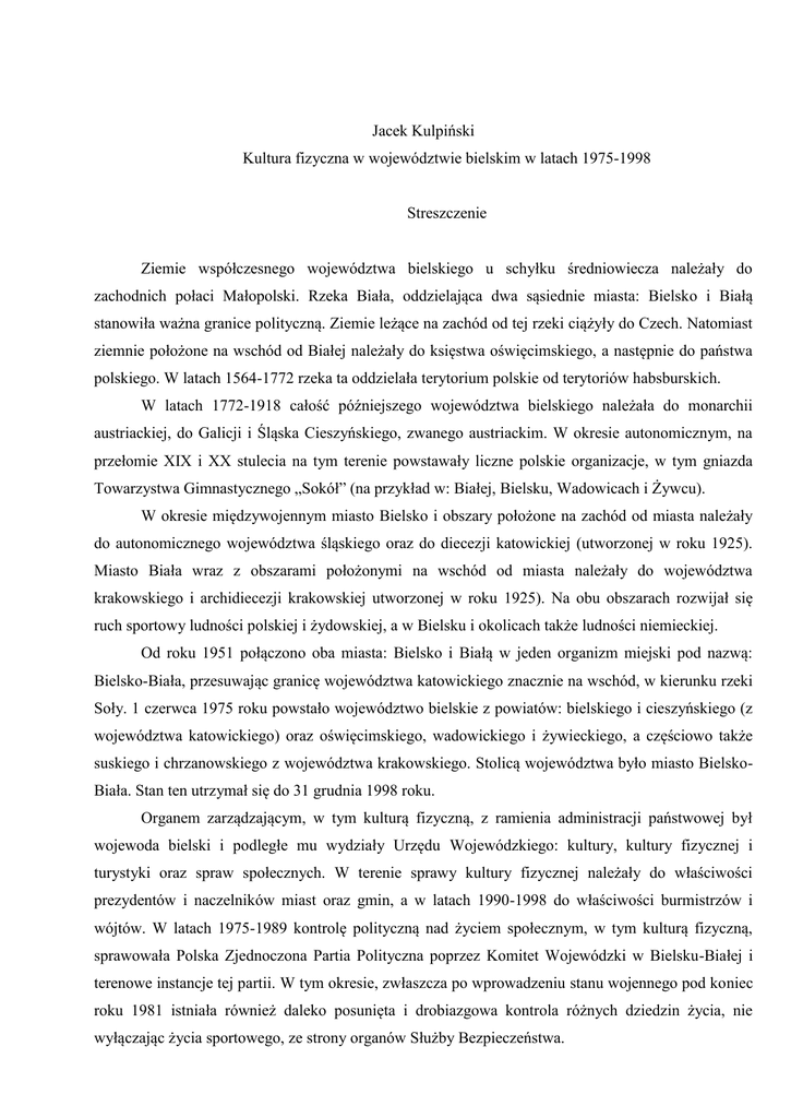 Jacek Kulpiński Kultura fizyczna w województwie bielskim w latach 1975-1998 Streszczenie Ziemie współczesnego województwa bielskiego u schyłku średniowiecza należały do zachodnich połaci Małopolski. Rzeka Biała, oddzielająca dwa sąsiednie miasta: Bielsko i Białą stanowiła ważna granice polityczną. Ziemie leżące na zachód od tej rzeki ciążyły do Czech. Natomiast ziemnie położone na wschód od Białej należały do księstwa oświęcimskiego, a następnie do państwa polskiego. W latach 1564-1772 rzeka ta oddzielała terytorium polskie od terytoriów habsburskich. W latach 1772-1918 całość późniejszego województwa bielskiego należała do monarchii austriackiej, do Galicji i Śląska Cieszyńskiego, zwanego austriackim. W okresie autonomicznym, na przełomie XIX i XX stulecia na tym terenie powstawały liczne polskie organizacje, w tym gniazda Towarzystwa Gimnastycznego „Sokół” (na przykład w: Białej, Bielsku, Wadowicach i Żywcu). W okresie międzywojennym miasto Bielsko i obszary położone na zachód od miasta należały do autonomicznego województwa śląskiego oraz do diecezji katowickiej (utworzonej w roku 1925). Miasto Biała wraz z obszarami położonymi na wschód od miasta należały do województwa krakowskiego i archidiecezji krakowskiej utworzonej w roku 1925). Na obu obszarach rozwijał się ruch sportowy ludności polskiej i żydowskiej, a w Bielsku i okolicach także ludności niemieckiej. Od roku 1951 połączono oba miasta: Bielsko i Białą w jeden organizm miejski pod nazwą: Bielsko-Biała, przesuwając granicę województwa katowickiego znacznie na wschód, w kierunku rzeki Soły. 1 czerwca 1975 roku powstało województwo bielskie z powiatów: bielskiego i cieszyńskiego (z województwa katowickiego) oraz oświęcimskiego, wadowickiego i żywieckiego, a częściowo także suskiego i chrzanowskiego z województwa krakowskiego. Stolicą województwa było miasto BielskoBiała. Stan ten utrzymał się do 31 grudnia 1998 roku. Organem zarządzającym, w tym kulturą fizyczną, z ramienia administracji państwowej był wojewoda bielski i podległe mu wydziały Urzędu Wojewódzkiego: kultury, kultury fizycznej i turystyki oraz spraw społecznych. W terenie sprawy kultury fizycznej należały do właściwości prezydentów i naczelników miast oraz gmin, a w latach 1990-1998 do właściwości burmistrzów i wójtów. W latach 1975-1989 kontrolę polityczną nad życiem społecznym, w tym kulturą fizyczną, sprawowała Polska Zjednoczona Partia Polityczna poprzez Komitet Wojewódzki w Bielsku-Białej i terenowe instancje tej partii. W tym okresie, zwłaszcza po wprowadzeniu stanu wojennego pod koniec roku 1981 istniała również daleko posunięta i drobiazgowa kontrola różnych dziedzin życia, nie wyłączając życia sportowego, ze strony organów Służby Bezpieczeństwa. Ruch sportowy w województwie bielskim był skupiony w Wojewódzkiej Federacji Sportu, która istniała w latach 1975-1990. Okręgowe związki sportowe były członami tej federacji. Po likwidacji federacji, jako zbędnego biurokratycznego tworu, w latach 1991-1998, poszczególne związki sportowe odzyskały samodzielność. Bielski sport kwalifikowany łączył tradycję z nowoczesnością. Już w okresie przedwojennym w Aleksandrowicach na zachód od Bielska oraz na górze Żar nad rzeką Soła w Beskidzie Małym uprawiane były sporty lotnicze (lotnictwo i szybownictwo). Z powodzeniem były uprawiane w okresie województwa bielskiego. W województwie z powodzeniem uprawiano sportowe gry zespołowe, szczególnie siatkówkę (w Bielsku i Andrychowie). Uprawiano również pozostałe gry, z wyjątkiem piłki ręcznej. Ze sportów indywidualnych uprawiano akrobatykę (w Chybiu nie opodal Cieszyna), boks (w Bielsku i Żywcu), jeździectwo (w Ochabach na Ziemi Cieszyńskiej i Wadowicach) oraz w bardziej rekreacyjnej formie w gminie Kalwaria Zebrzydowska, lekką atletykę (zwłaszcza w Bielsku), kolarstwo szosowe (w Bielsku i Oświęcimiu) oraz górskie, przełajowe i cyklotrial (w gminie Stryszów), łucznictwo (w Żywcu i Zawadce koło Wadowic) oraz pływanie (głównie w Oświęcimiu). Uprawiano także z powodzeniem liczne sporty walki Dalekiego Wschodu. Ze względu na korzystne ukształtowanie terenu oraz warunki klimatyczne, a także liczne niezbędne obiekty, sporty zimowe (narciarstwo klasyczne i alpejskie) uprawiano głównie w: Istebnej, Koniakowie, Szczyrku, Ustroniu i Wiśle. W Mikuszowicach pod Bielskiem istniał przez pewien czas tor saneczkowy. Hokej na lodzie i jazdę figurową uprawiano zwłaszcza w Oświęcimiu. Ze sportów zimowych nie uprawiano jedynie jazdy szybkiej na łyżwach. W ostatnich latach województwa bielskiego, w gminie Wadowice oraz Kalwaria Zebrzydowska zaczęto uprawiać wyścigi psich zaprzęgów. W województwie bielskim w latach 1975-1998 odbyło się wiele imprez sportowych o zasięgu krajowym i międzynarodowym, począwszy od ogólnopolskich spartakiad młodzieży, poprzez rajdy samochodowe aż do wyścigów kolarskich: Wyścigu Pokoju, Tour de Pologne, Wyścigu Solidarności i Olimpijczyków oraz Wyścigu „Kroniki” i „Startu”. Oprócz sportu kwalifikowanego, w województwie bielskim kształtował się również sport powszechny. Jego podstawą było szkolne wychowanie fizyczne. W omawianym okresie największymi problemami kultury fizycznej w szkolnictwie były: brak pełnowymiarowych obiektów sportowych, zwłaszcza w mniejszych miejscowościach oraz brak kwalifikowanej kadry nauczycielskiej do zajęć ruchowych, a także nieprowadzenie w należytym wymiarze zajęć gimnastyki kompensacyjnokorekcyjnej. Sport szkolny wspomagał Szkolny Związek Sportowy, a w środowisku wiejskim Ludowe Zespoły Sportowe. Od roku 1994 w województwie bielskim zaczęły powstawać uczniowskie kluby sportowe. Udział w kształtowaniu aktywności ruchowej młodego pokolenia miał również Związek Harcerstwa Polskiego, a w mniejszym zak