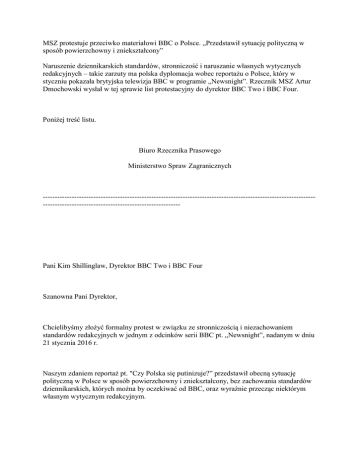 MSZ protestuje przeciwko materiałowi BBC o Polsce. „Przedstawił sytuację polityczną w sposób powierzchowny i zniekształcony” Naruszenie dziennikarskich standardów, stronniczość i naruszanie własnych wytycznych redakcyjnych – takie zarzuty ma polska dyplomacja wobec reportażu o Polsce, który w styczniu pokazała brytyjska telewizja BBC w programie „Newsnight”. Rzecznik MSZ Artur Dmochowski wysłał w tej sprawie list protestacyjny do dyrektor BBC Two i BBC Four. Poniżej treść listu. Biuro Rzecznika Prasowego Ministerstwo Spraw Zagranicznych ------------------------------------------------------------------------------------------------------------------------------------------------------------------------- Pani Kim Shillinglaw, Dyrektor BBC Two i BBC Four Szanowna Pani Dyrektor, Chcielibyśmy złożyć formalny protest w związku ze stronniczością i niezachowaniem standardów redakcyjnych w jednym z odcinków serii BBC pt. „Newsnight”, nadanym w dniu 21 stycznia 2016 r. Naszym zdaniem reportaż pt. "Czy Polska się putinizuje?” przedstawił obecną sytuację polityczną w Polsce w sposób powierzchowny i zniekształcony, bez zachowania standardów dziennikarskich, których można by oczekiwać od BBC, oraz wyraźnie przecząc niektórym własnym wytycznym redakcyjnym. Podczas oglądania programu byliśmy szczególnie zaniepokojeni następującymi kwestiami: 1. Subiektywny przekaz materiału: Już pierwsze słowa komentarza ( „Atmosfera w Polsce zmienia się, i to szybko" w 00: 12:19), wygłoszone na tle mrocznych ujęć ulic Warszawy, wywołują w widzach uczucie niepokoju i lęku. Ten ton jest następnie konsekwentnie podtrzymywany przez cały reportaż za pomocą szeregu niejasnych przeczuć wyrażanych przez niektóre osoby udzielające wywiadu (00:02:54, 00:03:34), co w jaskrawy sposób kontrastuje z pkt 4.4.13 Zasad Redakcyjnych BBC (profesjonalny sposób wydawania ocen, oparty na dowodach) 2. Nieprecyzyjny, emocjonalny język Określenie „atmosfera” wydaje się zbyt ogólnikowe, aby służyć jako podstawa do analizy sytuacji politycznej w kraju oraz do wypowiadania kategorycznych osądów na temat stanu jego demokracji. Ponadto przy wydawaniu oceny w reportażu wielokrotnie zastosowano słownictwo nacechowane emocjonalnie, np. używając słowa „niezależny” w odniesieniu do tygodnika „Kultura Liberalna” (00:03:15), wydawnictwa, które nie jest ani neutralne, ani niezależne tak w swojej ogólnej linii redakcyjnej, jak i w odniesieniu do konkretnych kontrowersji politycznych przedstawionych w reportażu. Naszym zdaniem powyższe narusza pkt 4.2.2 i 4.4.14 Zasad. 3. Pominięcie ważnego punktu widzenia, nieuzasadnione wnioski Dowody przedstawione przez producentów na poparcie twierdzenia, że atmosfera w Polsce szybko się zmienia, pokazują jedynie, że atmosfera zmienia się wśród niektórych grup przeciwników politycznych PiS - nic więcej. Wśród zwolenników rządu (większość aktywnych wyborców) raczej stale utrzymuje się radosny nastrój od wyborów prezydenckich w maju 20015. Podobnie wydaje się, że atmosfera całkowitej obojętności wobec polityki wśród 49% Polaków którzy nie głosują nie uległa zmianie. Przedstawianie nastrojów konkretnej grupy tak, jakby dotyczyły całej populacji kraju jest rażącym przykładem nieuzasadnionej ekstrapolacji, nie popartej faktami i stojącej w sprzeczności z punktem 4.4.2 Redakcyjnych Zasad BBC. 4. Bezstronność i uproszczenie (punkty 4.4.14 i 4.4.30 Zasad Redakcyjnych) Brak precyzji w języku i rozumowaniu skutkował bezkrytyczną akceptacją narracji tylko jednej części konfliktu, czyli przeciwników PiS, którzy twierdzą, że w tej chwili największy rozłam w polskiej polityce występuje pomiędzy opresyjnym rządem a społeczeństwem obywatelskim, starającym się bronić swoich praw podstawowych (00:03:41). Zestawienie wypowiedzi działaczy KOD, dziennikarzy wspierających Platformę Obywatelską i anonimowych członków społeczeństwa z jednej strony oraz polityka PiS z drugiej strony dowodzi, że autorzy reportażu podpisali się pod tym punktem widzenia. Sytuacja polityczna w Polsce jest jednak bardziej skomplikowana i interesująca, ponieważ rozłamy przebiegają w różnych kierunkach w całym społeczeństwie obywatelskim. A rząd PiS jest tylko demokratycznie wybraną reprezentacją jednej ze stron. 5. Zebranie niewystarczającej ilości informacji i brak znajomości kontekstu: Najbardziej rażącym przykładem skłaniania się dziennikarza ku wersji jednej strony sceny politycznej jest fragment w 00:58:12: „Jest u władzy dopiero od dwóch miesięcy”, mówi Katie Razzall „ale rządząca partia Prawo i Sprawiedliwość dokonała już kilku całkiem dużych zmian. Przeforsowała reformy, aby zwiększyć swoje wpływy w najwyższym sądzie w kraju. Zwolniła menedżerów i dziennikarzy w państwowych stacjach telewizyjnych i radiowych. Dokonuje czystek w służbie cywilnej i zwiększa uprawnienia do nadzoru policji i tajnym służbom”. Tylko ostatni z tych wszystkich zarzutów - odnoszący się do uprawnień do nadzoru - może być uzasadniony jako próba zmiany istniejących przepisów. Pozostałe, czy ktoś tego chce, czy nie, są dobrze ugruntowanymi praktykami w polskiej polityce. Od upadku komunizmu wszystkie nowo wybierane władze, w tym gabinet Platformy Obywatelskiej, wpływały na Trybunał Konstytucyjny, przejmowały kontrolę nad mediami publicznymi, zwalniały z pracy menedżerów spółek kontrolowanych przez państwo i oczyszczały służbę cywilną ze swoich przeciwników politycznych. Tak więc sugerowanie, że obecny rząd Prawa i Sprawiedliwości robi coś niepokojąco nietypowego i nadzwyczajnego jest po prostu błędne. 6. Brak znajomości kontekstu 02:32:10 „Agencja ratingowa Standard & Poor w piątek obniżyła rating Polski, mówiąc, że PiS osłabiło kluczowe instytucje.” Decyzja S&P o obniżeniu ratingu Polski by
