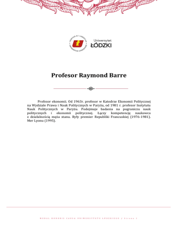 Profesor Raymond Barre Profesor ekonomii. Od 1963r. profesor w Katedrze Ekonomii Politycznej na Wydziale Prawa i Nauk Politycznych w Paryżu, od 1981 r. profesor Instytutu Nauk Politycznych w Paryżu. Podejmuje badania na pograniczu nauk politycznych i ekonomii politycznej. Łączy kompetencję naukowca z działalnością męża stanu. Były premier Republiki Francuskiej (1976-1981). Mer Lyonu (1995). M E D A L H O N O R I S C A U S A U N I W E R S Y T E T U Ł Ó D Z K I E G O / S t r o n a 1