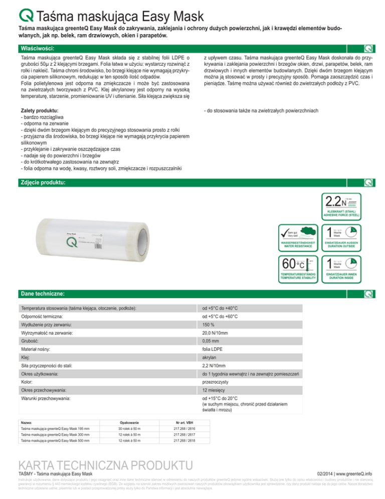 Taśma maskująca Easy Mask Taśma maskująca greenteQ Easy Mask do zakrywania, zaklejania i ochrony dużych powierzchni, jak i krawędzi elementów budowlanych, jak np. belek, ram drzwiowych, okien i parapetów. Właściwości: Taśma maskująca greenteQ Easy Mask składa się z stabilnej folii LDPE o grubości 50µ z 2 klejącymi brzegami. Folia łatwa w użyciu: wystarczy rozwinąć z rolki i nakleić. Taśma chroni środowisko, bo brzegi klejące nie wymagają przykrycia papierem silikonowym, redukując w ten sposób ilość odpadów. Folia polietylenowa jest odporna na zmiękczacze i może być zastosowana na zwietrzałych tworzywach z PVC. Klej akrylanowy jest odporny na wysoką temperaturę, starzenie, promieniowanie UV i utlenianie. Siła klejąca zwiększa się z upływem czasu. Taśma maskująca greenteQ Easy Mask doskonała do przykrywania i zaklejania powierzchni i brzegów okien, drzwi, parapetów, belek, ram drzwiowych i innych elementów budowlanych. Dzięki dwóm brzegom klejącym można ją stosować w prosty i precyzyjny sposób. Pomaga zaoszczędzić czas i pieniądze. Taśmę można używać również do zwietrzałych podłoży z PVC. Zalety produktu: - bardzo rozciągliwa - odporna na zerwanie - dzięki dwóm brzegom klejącym do precyzyjnego stosowania prosto z rolki - przyjazna dla środowiska, bo brzegi klejące nie wymagają przykrycia papierem silikonowym - przyklejanie i zakrywanie oszczędzające czas - nadaje się do powierzchni i brzegów - do krótkotrwałego zastosowania na zewnątrz - folia odporna na wodę, kwasy, roztwory soli, zmiękczacze i rozpuszczalniki - do stosowania także na zwietrzałych powierzchniach Zdjęcie produktu: Dane techniczne: Temperatura stosowania (taśma klejąca, otoczenie, podłoże): od +5°C do +40°C Odporność termiczna: od +5°C do +60°C Wydłużenie przy zerwaniu: 150 % Wytrzymałość na zerwanie: 20,0 N/10mm Grubość: 0,05 mm Materiał nośny: folia LDPE Klej: akrylan Siła przyczepności do stali: 2,2 N/10mm Okres użytkowania: do 1 tygodnia wewnątrz i na zewnątrz pomieszczeń Kolor: przezroczysty Okres przechowywania: 12 miesięcy Warunki przechowywania: od +15°C do 20°C (w suchym miejscu, chronić przed działaniem światła i mrozu) Nazwa: Opakowanie Nr art. VBH Taśma maskująca greenteQ Easy Mask 195 mm 30 rolek à 50 m 217.268 / 2616 Taśma maskująca greenteQ Easy Mask 300 mm 12 rolek à 50 m 217.268 / 2617 Taśma maskująca greenteQ Easy Mask 500 mm 12 rolek à 50 m 217.268 / 2618 KARTA TECHNICZNA PRODUKTU TAŚMY - Taśma maskująca Easy Mask 02/2014 | www.greenteQ.info Instrukcje użytkowania, dane dotyczące produktu i jego osiągnięć oraz inne dane techniczne stanowi w odniesieniu do naszych produktów greenteQ jedynie ogólne wskazówki. Służą one tylko do opisu właściwości i budowy produktów i nie stanowią gwarancji w rozumieniu § 443 niemieckiego kodeksu cywilnego (BGB). Ze względu na szeroki zakres możliwych zastosowań naszych produktów obowiązkiem użytkownika jest sprawdzenie, czy dany produkt nadaje się do jego celów. Nasze doradztwo techniczne udzielane ustnie, pisemnie lub w postaci przeprowadzonej próby służy tylko do Państwa informacji i jest absolutnie niewiążące. Taśma maskująca Easy Mask Taśma maskująca greenteQ Easy Mask do zakrywania, zaklejania i ochrony dużych powierzchni, jak i krawędzi elementów budowlanych, jak np. belek, ram drzwiowych, okien i parapetów. Zakres zastosowań: Taśma maskująca greenteQ Easy Mask doskonała do przykrywania i zaklejania powierzchni i brzegów okien, drzwi, parapetów, belek, ram drzwiowych i innych elementów budowlanych. Dzięki dwóm brzegom klejącym można ją stosować w prosty i precyzyjny sposób. Pomaga zaoszczędzić czas i pieniądze. Taśmę można używać również do zwietrzałych podłoży z PVC. Wskazówki dotyczące zastosowania: Powierzchnia klejona powinna być sucha, odtłuszczona i niezakurzona. wierzchniach plastikowych. Nie wyklucza się ryzyka pozostania resztek. Przed przyklejeniem taśmy należy ocenić podłoże: wzrokowo, pod kątem odporności na wycieranie, na zadrapania lub wykonać próbne naklejenie taśmy. Na metalowych powlekanych powierzchniach w rzadkich przypadkach mogą powstać, np. przebarwienia lub uszkodzenia. Należy zawsze całkowicie oklejać powierzchnie metalowe, tak, aby na powierzchni nie powstały pęcherzyki powietrza. W przeciwnym razie może dojść do reakcji z podłożem i tym samym do uszkodzenia powlekanej powierzchni metalu. W tym celu należy nakleić taśmę o większej przylepności od planowanej na niewidocznym fragmencie powierzchni na długości ok. 10 cm. Taśmę należy mocno docisnąć, następnie szybkim ruchem oderwać. W przypadku trudnych do ocenienia podłoży (np. zwietrzałe powierzchnie), należy przeprowadzić test przylepności trwający 24 godziny, co umożliwi ocenę właściwości przylepnych (rosnąca siła przyczepności kleju). Jeśli odrywanie taśmy powoduje uszkodzenie powierzchni należy zastosować taśmę o mniejszej przylepności. W przypadku oklejania powierzchni szklanych poddanych bezpośredniemu działaniu promieni słonecznych (np. szyby od wewnątrz) należy użyć taśmy greenteQ z klejem akrylanowym odpornym na działanie promieniowania UV, np. taśmy greenteQ z krepy UV Contour. Do powierzchni drewnianych (powlekanych lub niepowlekanych) należy stosować taśmy greenteQ o możliwie jak najmniejszej przylepności, np. taśma greenteQ z krepy UV Contour. Taśmę należy odklejać powoli i pod ukosem, aby nie uszkodzić drewnianych lub powlekanych powierzchni. W celu ochrony przed mechanicznym uszkodzeniem można nakleić dodatkową taśmę (np. greenteQ PVC-Multitape) na taśmę z krepy greenteQ UV Contour (podwójne oklejenie). Również w przypadku okładzin ściennych, takich jak tapety lub tekstylia należy używać specjalnych, lekko przylepnych taśm maskujących, np. taśmy greenteQ z krepy UV Contour. Dlatego te