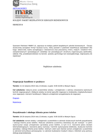 AKTUALNOŚCI KOLEJNY PAKIET BEZPŁATNYCH SZKOLEŃ BIZNESOWYCH 08/08/2014 Szanowni Państwo! MARR S.A. zaprasza na kolejny pakiet bezpłatnych szkoleń biznesowych. Chcesz skuteczniej zarządzać firmą? Szukasz kursu, który pozwoli ci podnieść kwalifikacje zawodowe? Dla kogo: właściciele, kadra zarządzająca i kierownicza oraz pracownicy mikro, małych i średnich firm, zarejestrowanych (posiadających siedzibę) lub posiadających strukturę organizacyjną (jednostkę, oddział, filię, przedstawicielstwo) na terenie powiatu gorlickiego lub nowosądeckiego. Zapraszamy do rejestracji! Najbliższe szkolenia: Negocjacje handlowe w praktyce Termin: 11-12 sierpnia 2014 roku (2-dniowe, w godz. 9.00-16.00) w Nowym Sączu Cel szkolenia: nabycie przez uczestników wiedzy i umiejętności z zakresu stosowania wybranych technik negocjacyjnych. Zdobycie wiedzy na temat specyfiki negocjacji w środowisku międzykulturowym oraz negocjacji z sieciami handlowymi. Nabycie umiejętności przygotowania do negocjacji Program Rejestracja Pozyskiwanie i obsługa klienta przez telefon Termin: 18-19 sierpnia 2014 roku (2-dniowe, w godz. 9.00-16.00) w Nowym Sączu Cel szkolenia: wzrost wiedzy i umiejętności uczestników w zakresie skutecznych technik pozyskiwania i obsługi klienta przez telefon. Podczas szkolenia uczestnicy dowiedzą się jak rozwijać i w pełni wykorzystać swoje umiejętności sprzedaży przez telefon, w tym m.in. tworzenie planu działań telemarketingowych, tworzenie planu rozmowy i techniki wykonywania telefonów, skuteczne techniki sprzedaży i obsługi klienta przez telefon. Istotnym celem jest również wzrost umiejętności uczestników w zakresie komunikacji perswazyjnej i w zakresie budowania trwałych relacji z klientem przy pomocy obsługi posprzedażowej. Program Rejestracja Merchandising - sposoby prezentacji towarów w celu zwiększenia sprzedaży Termin: 21-22 sierpnia 2014 roku (2-dniowe, w godz. 9.00-16.00) w Nowym Sączu Cel szkolenia: nabycie umiejętności wykorzystania wiedzy na temat procesu podejmowania decyzji zakupowych oraz zachowań Klientów. Poznanie wybranych zasad merchindisingu, metod prezentacji i ekspozycji produktów. Nabycie wiedzy na temat efektywnego wykorzystania przestrzeni sklepowej. Program Rejestracja Skuteczny sprzedawca Termin: 26-27 sierpnia 2014 roku (2-dniowe, w godz. 9.00-16.00) w Nowym Sączu Cel szkolenia: nabycie przez uczestników wiedzy i umiejętności w zakresie zarządzania procesem sprzedaży i w zakresie komunikacji perswazyjnej. Uczestnicy poznają techniki wywierania wpływu oraz nabędą i udoskonalą umiejętności stosowania języka korzyści i finalizowania transakcji handlowych. Zdobycie wiedzy na temat nowoczesnych technik pozyskiwania i utrzymania Klienta. Program Rejestracja Szczegóły pod nr tel.: 18 262 12 76