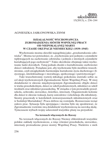 15(2013), s. 236–244 AGNIESZKA JABŁONOWSKA ZSNM DZIAŁALNOŚĆ WYCHOWAWCZA ZGROMADZENIA SIÓSTR WSPÓLNEJ PRACY OD NIEPOKALANEJ MARYI W CZASIE OKUPACJI NIEMIECKIEJ (1939–1945) Wychowanie można określić najogólniej jako „przekształcenie człowieka”. Można też powiedzieć, że „wychowanie jest jednym z czynników wpływających na zachowanie człowieka i jednym z istotnych czynników kształtujących jego osobowość”1.Takie określenie obejmuje także wychowanie ludzi dorosłych. Tutaj jednak chodzi o kształtowanie osobowości dzieci i młodzieży. Pożądane jest, aby wychowanie było możliwie wszechstronne, czyli uwzględniało harmonijne kształcenie życia duchowego i fizycznego, intelektualnego i moralnego, społecznego i patriotycznego2. Taki wszechstronny rozwój młodego pokolenia stawiało sobie za cel akcji wychowawczych Zgromadzenie Sióstr Wspólnej Pracy. W swej działalności w okresie międzywojennym Zgromadzenie objęło dzieci w wieku przedszkolnym, dzieci ze szkół podstawowych, młodzież ze szkół średnich oraz młodzież pozaszkolną. W związku z tym prowadziło przedszkola, ochronki, sierocińce, świetlice, internaty. Organizowało kolonie dla dzieci w okresie wakacji, kursy zawodowe i rekolekcje dla młodzieży. Siostry pracowały w katolickich stowarzyszeniach młodzieżowych oraz w Sodalicji Mariańskiej3. Praca dobrze się rozwijała. Rozszerzano wciąż zakres prac. Sytuacja była sprzyjająca i można było się spodziewać, że Zgromadzenie rozwinie swą działalność wychowawczą na szeroką skalę. Tymczasem wybuch wojny udaremnił wszystkie plany na przyszłość. Na terenach włączonych do Rzeszy Na terenach włączonych do Rzeszy Niemcy zlikwidowali wszystkie polskie zakłady wychowawcze, a więc również przedszkola, sierocińce, internaty prowadzone przez siostry Wspólnej Pracy. Niektóre z nich 236 utrzymały się przez pierwsze miesiące okupacji: sierocińce prowadzono w Zduńskiej Woli4 i w Bierzwiennej (do 1940 roku)5, w Uniejowie do momentu wysiedlenia sióstr istniało przedszkole6, w Sompolnie s. Łucja Karowska (1939?–1941) przez pewien czas, za pozwoleniem władz niemieckich, prowadziła ochronkę7, we Włocławku w domu generalnym sierociniec do 1941 r., przy ul. Leśnej, dopóki Niemcy ich nie zlikwidowali w 1940 r., prowadzone były ochronka i szkoła dokształcająca w zakresie 6 klas gimnazjalnych.8 Niemcy chcąc przeszkodzić w rozwoju umysłowym Polaków zlikwidowali polskie szkolnictwo. Część dzieci i młodzieży nie zajętych nauką w szkołach niemieckich wysyłali do Rzeszy do pracy, inne poddano rozmaitym udręczeniom na miejscu. W celu uniemożliwienia wychowania religijnego i patriotycznego, Niemcy zaciekle tępili wszystkie organizacje młodzieżowe, nawet sportowe, nie mówiąc już o katolickich stowarzyszeniach młodzieżowych. Podejrzewali, że pod pozorem najniewinniejszego związku może się kryć antyhitlerowska organizacja. W związku z likwidacją zakładów wychowawczych i organizacji młodzieżowych Zgromadzenie utraciło w wielu przypadkach kontakt z dziećmi i młodzieżą. Tymczasem wzrastało młode pokolenie, które wymagało opieki. Nie mogło być tak długiej przerwy w wychowaniu. Okres sześciu lat mógł mieć duże znaczenie w normalnym rozwoju dziecka. W takiej sytuacji siostry podjęły wysiłki, aby w miarę możliwości przyjść z pomocą dzieciom i młodzieży. Dlatego nawet po zamknięciu sierocińców opiekowały się dziewczynkami. Siostra Wincenta Warych (1911–1997)9 miała pod opieką kilka takich dziewcząt z sierocińca z Bierzwiennej podczas swojego pobytu w Sompolnie. Dołożyła wielu starań, aby wychować je pod względem religijnym, moralnym, patriotycznym oraz przygotować praktycznie do życia. W tym celu z własnej inicjatywy prowadziła dla nich „lekcje”, uczyła modlitwy, mówiła, jak postępować w konkretnych sytuacjach10. Na terenach włączonych do Rzeszy nie było możliwości zajmowania się dziećmi i młodzieżą w zorganizowanej formie, więc siostry, które przebywały u rodzin, gdzieś na wsi, zbierały małe grupy dzieci, żeby przekazać im choćby minimum wiadomości szkolnych. Jednak nawet takie akcje napotykały na rozmaite trudności, bo Niemcy tropili takie „zebrania”11. W takiej sytuacji siostry nie chcąc narażać dzieci i siebie na represje ze strony Niemców, zrezygnowały z gromadzenia dzieci w jednym miejscu i uczyły je indywidualnie. 237 Przełożona generalna Jadwiga Walter (1866–1941)12 w czasie okupacji utrzymywała kontakty z młodzieżą, którą jeszcze przed wojną wdrażała do pracy nad urobieniem charakteru. Siostry, które pracowały w rozproszeniu, wykorzystywały okazje przy wspólnym wykonywaniu pracy, aby wpływać wychowawczo na młodzież, ostrzec przed niebezpieczeństwem demoralizacji czy współpracy z Niemcami13. W wychowaniu bardzo przemawia przykład wychowawczy. Siostry często wykorzystywały ten moment. W czasie bombardowania Włocławka w 1939 roku siostry włączyły się do akcji pomocy rannym i poszkodowanym. Zorganizowały także grupę dziewcząt, które z zapałem zbierały żywność, rozdzielały ją między uciekinierów, robiły opatrunki rannym. Poza tym urządzono przemyślaną akcję modlitwy w kaplicy sióstr. Siostry celowo włączyły dziewczęta do swoich akcji charytatywnych, żeby praktycznie wykształcić w nich prawdziwie chrześcijańską postawę wobec potrzebujących14. Wykorzystywały także każdą okazję, aby wpoić młodzieży ideę wolności Ojczyzny. Młode siostry, które wraz z polską młodzieżą wywiezione zostały do pracy w Niemczech, w celu podtrzymania religijności i „ducha polskości” organizowały „opłatek” przed Bożym Narodzeniem, kiedy indziej „imieniny” itp. Takie spotkania były zawsze okazją do śpiewania polskich piosenek i rozmów o Polsce15. Siostry zajmowały się dziewczętami, które wracały z Niemiec. Niekiedy o