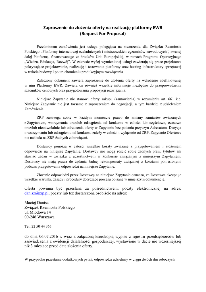 Zaproszenie do złożenia oferty na realizację platformy EWR (Request For Proposal) Przedmiotem zamówienia jest usługa polegająca na stworzeniu dla Związku Rzemiosła Polskiego „Platformy internetowej czeladniczych i mistrzowskich egzaminów zawodowych”, zwanej dalej Platformą, finansowanego ze środków Unii Europejskiej, w ramach Programu Operacyjnego „Wiedza, Edukacja, Rozwój”. W zakresie wyżej wymienionej usługi zawierają się prace projektowe pokrywające projektowanie, realizację i testowanie platformy oraz hosting infrastruktury sprzętowej w trakcie budowy i po uruchomieniu produkcyjnym rozwiązania. Załączony dokument zawiera zaproszenie do złożenia oferty na wdrożenie zdefiniowanej w nim Platformy EWR. Zawiera on również wszelkie informacje niezbędne do przeprowadzenia szacunków cenowych oraz przygotowania propozycji rozwiązania. Niniejsze Zapytanie nie stanowi oferty zakupu (zamówienia) w rozumieniu art. 661 k.c. Niniejsze Zapytanie nie jest tożsame z zaproszeniem do negocjacji, a tym bardziej z udzieleniem Zamówienia. ZRP zastrzega sobie w każdym momencie prawo do zmiany zamiarów związanych z Zapytaniem, wstrzymania oraz/lub odstąpienia od konkursu w całości lub częściowo, czasowo oraz/lub nieodwołalnie lub odrzucenia oferty w Zapytaniu bez podania przyczyn Adresatom. Decyzja o wstrzymaniu lub odstąpieniu od konkursu zależy w całości i wyłącznie od ZRP. Zapytanie Ofertowe nie nakłada na ZRP żadnych zobowiązań. Dostawcy ponoszą w całości wszelkie koszty związane z przygotowaniem i złożeniem odpowiedzi na niniejsze Zapytanie. Dostawcy nie mogą rościć sobie żadnych praw, tytułów ani stawiać żądań w związku z uczestnictwem w konkursie związanym z niniejszym Zapytaniem. Dostawcy nie mają prawa do żądania żadnej rekompensaty związanej z kosztami poniesionymi podczas przygotowania odpowiedzi na niniejsze Zapytanie. Złożenie odpowiedzi przez Dostawcę na niniejsze Zapytanie oznacza, że Dostawca akceptuje wszelkie warunki, zasady i procedury dotyczące procesu opisane w niniejszym dokumencie. Oferta powinna być przesłana za pośrednictwem: poczty elektronicznej na adres: [email protected], poczty lub też dostarczona osobiście na adres: Maciej Danisz Związek Rzemiosła Polskiego ul. Miodowa 14 00-246 Warszawa Tel. 22 50 44 365 do dnia 06.07.2016 r. wraz z załączoną kserokopią wypisu z rejestru przedsiębiorców lub zaświadczenia z ewidencji działalności gospodarczej, wystawione w dacie nie wcześniejszej niż 3 miesiące przed datą złożenia oferty. W przypadku przesłania dodatkowych pytań, odpowiedzi udzielimy w ciągu dwóch dni roboczych.