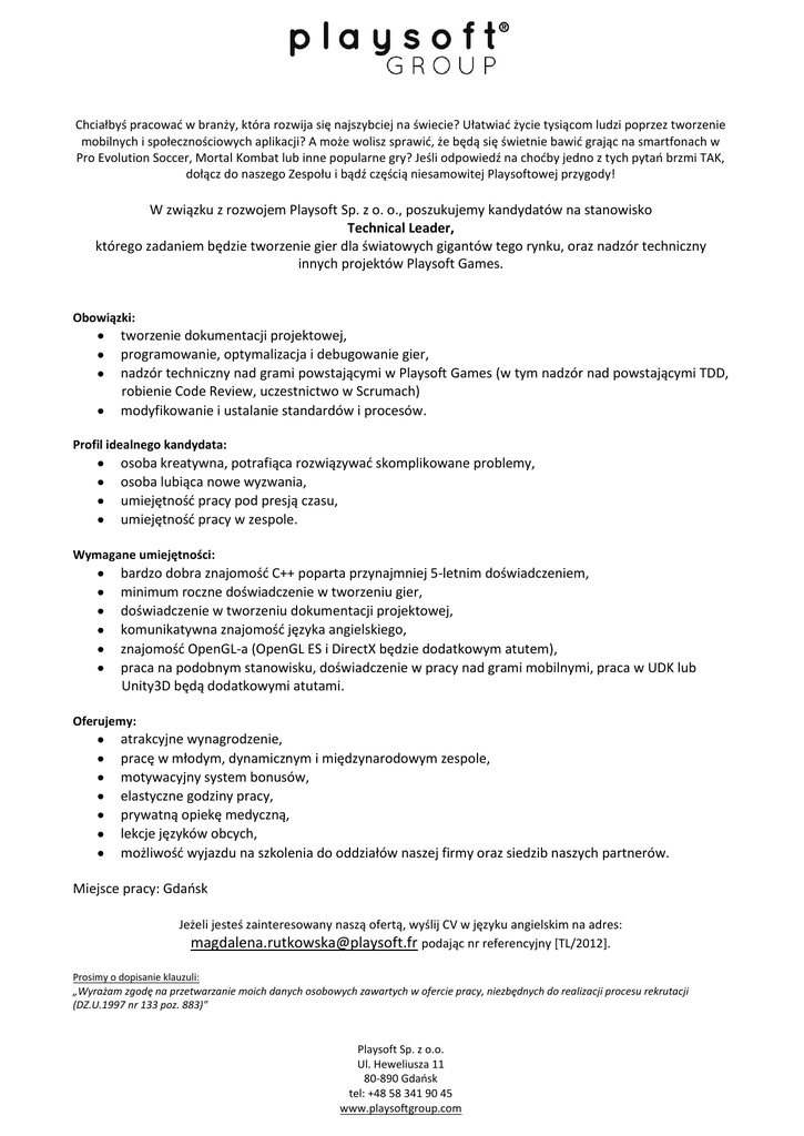 Chciałbyś pracować w branży, która rozwija się najszybciej na świecie? Ułatwiać życie tysiącom ludzi poprzez tworzenie mobilnych i społecznościowych aplikacji? A może wolisz sprawić, że będą się świetnie bawić grając na smartfonach w Pro Evolution Soccer, Mortal Kombat lub inne popularne gry? Jeśli odpowiedź na choćby jedno z tych pytań brzmi TAK, dołącz do naszego Zespołu i bądź częścią niesamowitej Playsoftowej przygody! W związku z rozwojem Playsoft Sp. z o. o., poszukujemy kandydatów na stanowisko Technical Leader, którego zadaniem będzie tworzenie gier dla światowych gigantów tego rynku, oraz nadzór techniczny innych projektów Playsoft Games. Obowiązki: tworzenie dokumentacji projektowej, programowanie, optymalizacja i debugowanie gier, nadzór techniczny nad grami powstającymi w Playsoft Games (w tym nadzór nad powstającymi TDD, robienie Code Review, uczestnictwo w Scrumach) modyfikowanie i ustalanie standardów i procesów. Profil idealnego kandydata: osoba kreatywna, potrafiąca rozwiązywać skomplikowane problemy, osoba lubiąca nowe wyzwania, umiejętność pracy pod presją czasu, umiejętność pracy w zespole. Wymagane umiejętności: bardzo dobra znajomość C++ poparta przynajmniej 5-letnim doświadczeniem, minimum roczne doświadczenie w tworzeniu gier, doświadczenie w tworzeniu dokumentacji projektowej, komunikatywna znajomość języka angielskiego, znajomość OpenGL-a (OpenGL ES i DirectX będzie dodatkowym atutem), praca na podobnym stanowisku, doświadczenie w pracy nad grami mobilnymi, praca w UDK lub Unity3D będą dodatkowymi atutami. Oferujemy: atrakcyjne wynagrodzenie, pracę w młodym, dynamicznym i międzynarodowym zespole, motywacyjny system bonusów, elastyczne godziny pracy, prywatną opiekę medyczną, lekcje języków obcych, możliwość wyjazdu na szkolenia do oddziałów naszej firmy oraz siedzib naszych partnerów. Miejsce pracy: Gdańsk Jeżeli jesteś zainteresowany naszą ofertą, wyślij CV w języku angielskim na adres: [email protected] podając nr referencyjny [TL/2012]. Prosimy o dopisanie klauzuli: „Wyrażam zgodę na przetwarzanie moich danych osobowych zawartych w ofercie pracy, niezbędnych do realizacji procesu rekrutacji (DZ.U.1997 nr 133 poz. 883)" Playsoft Sp. z o.o. Ul. Heweliusza 11 80-890 Gdańsk tel: +48 58 341 90 45 www.playsoftgroup.com