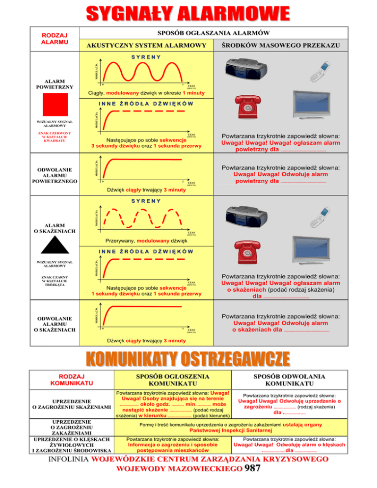 RODZAJ ALARMU SPOSÓB OGŁASZANIA ALARMÓW AKUSTYCZNY SYSTEM ALARMOWY ŚRODKÓW MASOWEGO PRZEKAZU MODULACJA SYRENY ALARM POWIETRZNY 0 1 CZAS [MINUTY] Ciągły, modulowany dźwięk w okresie 1 minuty MODULACJA INNE ŹRÓDŁA DŹWIĘKÓW WIZUALNY SYGNAŁ ALARMOWY CZAS [MINUTY] Następujące po sobie sekwencje 3 sekundy dźwięku oraz 1 sekunda przerwy MODULACJA ZNAK CZERWONY W KSZTAŁCIE KWADRATU ODWOŁANIE ALARMU POWIETRZNEGO 0 3 CZAS Powtarzana trzykrotnie zapowiedź słowna: Uwaga! Uwaga! Uwaga! ogłaszam alarm powietrzny dla ................................................... Powtarzana trzykrotnie zapowiedź słowna: Uwaga! Uwaga! Odwołuję alarm powietrzny dla ................................................... [MINUTY] Dźwięk ciągły trwający 3 minuty MODULACJA SYRENY ALARM O SKAŻENIACH CZAS [MINUTY] Przerywany, modulowany dźwięk MODULACJA INNE ŹRÓDŁA DŹWIĘKÓW WIZUALNY SYGNAŁ ALARMOWY CZAS [MINUTY] Następujące po sobie sekwencje 1 sekundy dźwięku oraz 1 sekunda przerwy ODWOŁANIE ALARMU O SKAŻENIACH MODULACJA ZNAK CZARNY W KSZTAŁCIE TRÓJKĄTA 0 3 CZAS [MINUTY] Powtarzana trzykrotnie zapowiedź słowna: Uwaga! Uwaga! Uwaga! ogłaszam alarm o skażeniach (podać rodzaj skażenia) dla ................................................... Powtarzana trzykrotnie zapowiedź słowna: Uwaga! Uwaga! Odwołuję alarm o skażeniach dla ................................................... Dźwięk ciągły trwający 3 minuty RODZAJ KOMUNIKATU SPOSÓB OGŁOSZENIA KOMUNIKATU Powtarzana trzykrotnie zapowiedź słowna: Uwaga! SPOSÓB ODWOŁANIA KOMUNIKATU Powtarzana trzykrotnie zapowiedź słowna: Uwaga! Osoby znajdująca się na terenie Uwaga! Uwaga! Odwołuję uprzedzenie o UPRZEDZENIE ..................... około godz. .............. min. ............... może zagrożeniu ......................... (rodzaj skażenia) O ZAGROŻENIU SKAŻENIAMI nastąpić skażenie ......................... (podać rodzaj dla ......................... skażenia) w kierunku .......................... (podać kierunek) UPRZEDZENIE Formę i treść komunikatu uprzedzenia o zagrożeniu zakażeniami ustalają organy O ZAGROŻENIU Państwowej Inspekcji Sanitarnej ZAKAŻENIAMI Powtarzana trzykrotnie zapowiedź słowna: Powtarzana trzykrotnie zapowiedź słowna: UPRZEDZENIE O KLĘSKACH Informacja o zagrożeniu i sposobie Uwaga! Uwaga! Odwołuję alarm o klęskach ŻYWIOŁOWYCH postępowania mieszkańców ......................... dla ......................... I ZAGROŻENIU ŚRODOWISKA INFOLINIA WOJEWÓDZKIE CENTRUM ZARZĄDZANIA KRYZYSOWEGO WOJEWODY MAZOWIECKIEGO 987