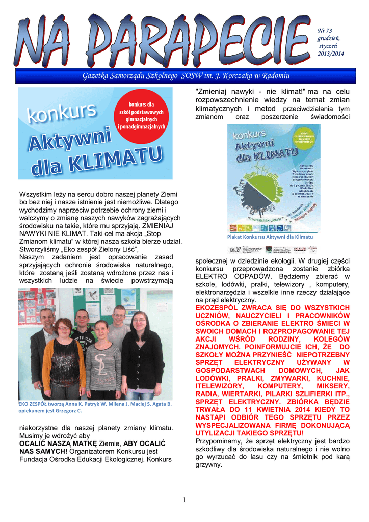 Nr 73 grudzień, styczeń 2013/2014 Gazetka Samorządu Szkolnego SOSW im. J. Korczaka w Radomiu "Zmieniaj nawyki - nie klimat!" ma na celu rozpowszechnienie wiedzy na temat zmian klimatycznych i metod przeciwdziałania tym zmianom Wszystkim leży na sercu dobro naszej planety Ziemi bo bez niej i nasze istnienie jest niemożliwe. Dlatego wychodzimy naprzeciw potrzebie ochrony ziemi i walczymy o zmianę naszych nawyków zagrażających środowisku na takie, które mu sprzyjają. ZMIENIAJ NAWYKI NIE KLIMAT. Taki cel ma akcja „Stop Zmianom klimatu” w której nasza szkoła bierze udział. Stworzyliśmy „Eko zespół Zielony Liść”, Naszym zadaniem jest opracowanie zasad sprzyjających ochronie środowiska naturalnego, które zostaną jeśli zostaną wdrożone przez nas i wszystkich ludzie na świecie powstrzymają oraz poszerzenie świadomości Plakat Konkursu Aktywni dla Klimatu społecznej w dziedzinie ekologii. W drugiej części konkursu przeprowadzona zostanie zbiórka ELEKTRO ODPADÓW. Będziemy zbierać w szkole, lodówki, pralki, telewizory , komputery, elektronarzędzia i wszelkie inne rzeczy działające na prąd elektryczny. EKOZESPÓL ZWRACA SIĘ DO WSZYSTKICH UCZNIÓW, NAUCZYCIELI I PRACOWNIKÓW OŚRODKA O ZBIERANIE ELEKTRO ŚMIECI W SWOICH DOMACH I ROZPROPAGOWANIE TEJ AKCJI WŚRÓD RODZINY, KOLEGÓW ZNAJOMYCH. POINFORMUJCIE ICH, ŻE DO SZKOŁY MOŻNA PRZYNIEŚĆ NIEPOTRZEBNY SPRZĘT ELEKTRYCZNY UŻYWANY W GOSPODARSTWACH DOMOWYCH, JAK LODÓWKI, PRALKI, ZMYWARKI, KUCHNIE, ITELEWIZORY, KOMPUTERY, MIKSERY, RADIA, WIERTARKI, PILARKI SZLIFIERKI ITP., SPRZĘT ELEKTRYCZNY. ZBIÓRKA BĘDZIE TRWAŁA DO 11 KWIETNIA 2014 KIEDY TO NASTĄPI ODBIÓR TEGO SPRZĘTU PRZEZ WYSPECJALIZOWANA FIRMĘ DOKONUJĄCĄ UTYLIZACJI TAKIEGO SPRZĘTU! Przypominamy, że sprzęt elektryczny jest bardzo szkodliwy dla środowiska naturalnego i nie wolno go wyrzucać do lasu czy na śmietnik pod karą grzywny. EKO ZESPÓŁ tworzą Anna K. Patryk W. Milena J. Maciej S. Agata B. opiekunem jest Grzegorz C. niekorzystne dla naszej planety zmiany klimatu. Musimy je wdrożyć aby OCALIĆ NASZĄ MATKĘ Ziemie, ABY OCALIĆ NAS SAMYCH! Organizatorem Konkursu jest Fundacja Ośrodka Edukacji Ekologicznej. Konkurs 1 3. WYBIERAJ TRANSPORT KORZYSTNY DLA ŚRODOWISKA • • staraj się poruszać pieszo lub rowerem, a nie samochodem, korzystaj z transportu publicznego, 4. KUPUJ INTELIGENTNIE • • • wybieraj produkty krajowe, sezonowe. wybieraj produkty jak najmniej opakowane, najlepiej wykonane z surowców wtórnych nie używaj jednorazowych toreb foliowych. 5.REDUKUJ ILOŚĆ ŚMIECI • Ogromna ingerencja i ekspansja człowieka w środowisku naturalnym prowadzi do wielu negatywnych konsekwencji, w tym między innymi ocieplenia klimatu. W związku z tym, że jest to proces powolny i długotrwały, ludzie odczuwając drastyczne skutki globalnego ocieplenia nie utożsamiają ich z własną działalnością. Biorąc pod uwagę fakt, że prawie każda nasza czynność zwiększa pulę gazów cieplarnianych, powinniśmy podjąć działania zmniejszające wielkość emisji z jednoczesną oszczędnością własnego budżetu domowego. Każdy z nas może chronić klimat! • • • • • 1. OSZCZĘDZAJ ENERGIĘ TURYSTYCZNE MIKOŁAJKI 2013 ELEKTRYCZNĄ W DOMU I W PRACY • • • • • • kupuj sprzęt AGD energooszczędny (klasy A),wymień żarówki na energooszczędne wyłączaj lampy oraz urządzenia z których nie korzystasz, regularnie rozmrażaj lodówkę, przed włożeniem jedzenia do lodówki ostudź je. gotuj potrawy pod przykrywką, obniż temperaturę w domu, termostatem nie przez otwieranie okien nie zostawiaj urządzeń włączonych na „stand by”, ładowarek w gniazdku ( np. telefon) 2. OSZCZĘDZAJ WODĘ • • • • kupuj tak aby pozostawić jak najmniej śmieci, jeśli masz możliwość, kompostuj odpady organiczne. segreguj odpady, wybieraj papier makulaturowy, jego produkcja pochłania ok. 70% mniej energii zapisuj zeszyty do końca, a papier drukuj dwustronnie. nie pal śmieci, mają niską wartość , a wszystkich trują. Wspólne zdjęcie u bram Puszczy Jodłowej zakręcaj kran kiedy myjesz zęby, bierz prysznic zamiast kąpieli na kranie zamontuj perlator, by zmniejszyć zużycie wody. pralkę i zmywarkę włączaj tylko gdy są pełne, wybieraj oszczędny program prania. jeśli masz ogród, podlewaj go późnym wieczorem lub wcześnie rano gdy jest chłodniej. W dniach 7-8 grudnia 2013 roku, odbyły się XVIII Turystyczne Mikołajki s SKKT –PTTK Nr 279 „ Jędrusiowe” W tegorocznej imprezie udział wzięły 54 osoby. Swoją obecnością zaszczyciło nas wielu znamienitych gości z zarządu PTTK, a także nasz były ksiądz katecheta Marian Marszałek. Zabawa była bardzo udana . 2 fantazyjne ozdobionych lukrem. Mamy nadzieję, że funduszy wystarczy na jakiś super wyjazd! Wspólne zdjęcie z Mikołajem KIERMASZ BOŻONARODZENIOWY Za zebrane pieniądze pojedziemy na wycieczkę. Jak co roku , Nasze Panie: . Beata. Wolnowska, Iwona. Nawrot i Beata. Grabowska przygotowały kiermasz, na którym mogliśmy podziwiać przepiękne ozdoby świąteczne. Wszystkie dekoracje zostały wykonane przez uczniów PSPdP pod czujnym okiem naszych Pań. W tym roku na niecodzienny pomysł wpadli organizatorzy Jaseł Bożonarodzeniowych: ks. Mariusz Wierzba wraz z p. B. Ruszewską. I to był pomysł na szóstkę!!! Ozdoby świąteczne na stoisku koło "Stokrotki" Można było zobaczyć i zakupić: pachnące pierniki, błyszczące bombki, milutkie choinki i inne cudeńka, a wszystko po to, by nasi uczniowie zebrali pieniążki na wycieczkę. W przedsięwzięciu wzięły udział klasy III B , IIIC, III D. Do zarobkowania na kiermaszach przygotowują się już od początku roku szkolnego. Zbierają szyszki, orzechy, suszą i barwią potrzebny do stroików materiał roślinny. Planują i robią zakupy. Jest to zawsze duże wyzwanie. W krótkim czasie przygotowują : bombki , choinki z szyszek, piórek, makaronu i pi