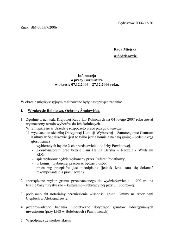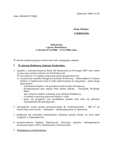 Sędziszów 2006-12-20 Znak: BM-0055/7/2006 Rada Miejska w Sędziszowie. Informacja o pracy Burmistrza w okresie 07.12.2006 – 27.12.2006 roku. W okresie międzysesyjnym realizowane były następujące zadania: I. W zakresie Rolnictwa, Ochrony Środowiska. 1. Zgodnie z uchwałą Krajowej Rady Izb Rolniczych na 04 lutego 2007 roku został wyznaczony termin wyborów do Izb Rolniczych. W tym zakresie w Urzędzie rozpoczęto prace przygotowawcze: 1) wyznaczono siedzibę Okręgowej Komisji Wyborczej – Samorządowe Centrum Kultury w Sędziszowie (jest to tylko jedna komisja na całą gminę – jeden okręg głosowania) - wybieranych będzie 2-ch przedstawicieli do Izby Powiatowej, - Koordynatorem prac będzie Pani Halina Barska – Naczelnik Wydziału RDG, - spis wyborów będzie wykonany przez Referat Podatkowy, - w komisji wyborczej pracować będzie 5 osób, - praca wg przepisów jest nieodpłatna (jednak Izba stara się dokonać rekompensatę dla pracujących). 2. sporządzono wykaz gruntu przeznaczonego do wydzierżawienia ~ 900 m2 na terenie bazy turystyczno – kulturalno – rekreacyjnej przy ul. Sportowej. 3. podpisano akt notarialny przeniesienia własności gruntu Gminy na rzecz pani Ciepluch w Aleksandrowie. 4. przeprowadzono badania hipotetyczne dotyczące gruntów udostępnianych inwestorom (przy LHS w Boleścicach i Pawłowicach). 5. Współpraca ze środowiskiem. W dniu 14 grudnia 2006 roku na szczeblu powiatu rozstrzygnięto konkurs organizowany przez Wojewodę Świętokrzyskiego na Regionalną Potrawę Świąteczną woj. świętokrzyskiego na którym komisja konkursowa złożona z przedstawicieli ARiMR w Jędrzejowie oraz Wojewody Świętokrzyskiego wytypowała „Pierożki Pawłowickie z barszczem wigilijnym” oferowane przez p. Wandę Gajos z Pawłowic – Przewodniczącą KGW jako potrawę regionalną powiatu jędrzejowskiego. W dniu 19 grudnia 2006 roku w budynku ŚUW odbył się finał konkursu, a panie z naszej gminy otrzymały cenne nagrody. II. W zakresie Gospodarki Komunalnej i Lokalowej. 1. Wykonano pomiary rezystancji izolacji instalacji elektrycznej w blokach Nr 3,4,5 i 10 na Osiedlu Drewnianym w Sędziszowie. Roboty wykonał Usługowy Zakład Elektroinstalacyjny Bogusław Baran Słupia 280 za kwotę ryczałtową brutto w wysokości 856,00 zł. 2. Ubezpieczono budynki komunalne w miejscowości Tarnawa Nr 103a i 103b. Kwota za ubezpieczenie na okres 1 roku – 232,00 zł. 3. Zakupiono 2 szt. kuchni węglowych przenośnych do lokali mieszkalnych na Oś. Drewnianym Nr 10/12 i 5/11 za kwotę 2.700,00 zł. 4. Dokonano wymiany 1 szt. okna w lokalu komunalnym w miejscowości Klimontów Nr 31/2 za kwotę ogółem 850,00 zł. Partycypacja w kosztach lokatora 50%. 5. Wykonano uzupełnienie ubytków pokrycia dachowego na powierzchni około 21 m2 papą termozgrzewalną oraz oczyszczenie rynien na budynku komunalnym przy ul. Kard. Stefana Wyszyńskiego Nr 4 (lokale użytkowe). Roboty wykonał PPHU „ZASADA” ul. Przypkowskiego 47/59 z Jędrzejowa za kwotę ryczałtową brutto 671,00 zł. 6. Wykonano zbiornik bezodpływowy na nieczystości ciekłe o pojemności 8,3 m3 oraz kanalizację sanitarną do dwóch lokali mieszkalnych w miejscowości Czepiec Nr18 na działce o nr geodez. 66/1. Roboty wykonał ZUK w Sędziszowie za kwotę brutto 8.238,13 zł. Wykonano również inwentaryzację zbiornika oraz przyłączy. Roboty wykonał M. Jędrzejczyk Biuro Usług Geodezyjnych w Sędziszowie za kwotę 535,00 zł. 7. Dokonano przydziału lokalu mieszkalnego socjalnego o pow. 15,82 m2 w miejscowości Tarnawa Nr 103a m.3 dla Pani Muszyńskiej Elżbiety. 8. Wykonano wymianę grzejnika c.o. w lokalu mieszkalnym usytuowanym w budynku Gimnazjum w Boleścicach Nr 76/2. Koszt materiałów 389,20 zł. Roboty za kwotę 100,00 zł wykonał Bogusław Żal Instalatorstwo Wodno – Kanalizacyjne i CO. 9. Zakupiono i przekazano dla Rady Sołeckiej Krzelów – Czekaj materiały o wartości 315,13 zł celem wykonania remontu świetlicy wiejskiej w miejscowości Czekaj. 10. W drodze przetargu nieograniczonego w dniu 05.12.2006 roku wybrano wykonawcę „PKP Energetyka” Sp. z o.o. Zakład Świętokrzyski w Kielcach do wykonania przedmiotu zamówienia pn. „Budowa oświetlenia: 1) Iluminacji Kościoła Św. Brata Alberta w Sędziszowie przy ul. Kard. Wyszyńskiego, 2) Iluminacji Kościoła Św. Ap. Piotra i Pawła w Sędziszowie przy ul. Kościelnej. Całkowity koszt wykonania zamówienia na kwotę 74.443,13 zł (brutto). Termin realizacji do 05.04.2007 roku. 11. Wykonano wymianę 3 szt. opraw rtęciowych na sodowe w miejscowości Zielonki. Roboty wykonał RZE w Jędrzejowie za kwotę 1.770,01 zł. III. W zakresie Drogownictwa. 1. Dostarczono na drogę wewnętrzną Sosnowiec Kruszywo z podtorza LHS w ilości ~ 90t. Kruszywo wbudowano. 2. Zakupiono na PKP płyty betonowe do wykonania zjazdów do łąk w miejscowości Przełaj. Wartość płyt 878,40 zł. 3. Trwa rozliczanie budżetu 2006 roku. IV. W zakresie Wodociągi i kanalizacja. 1. Obecnie trwają prace związane z budową sieci wodociągowej ul. Marianowskiej oraz wsi Marianów. Wykonany został odcinek ok. 1,0 km sieci wodociągowej ul. Marianowskiej. W miarę sprzyjających warunków atmosferycznych prace będą trwały nadal. Termin zakończenia budowy zgodnie z umową upływa w dniu 29.06.2007 roku. Zadanie wodociąg Marianów dofinansowane z środków ZPORR w wysokości 75% kosztów kwalifikowanych + 10% z rezerwy budżetowej. 2. Został ogłoszony przetarg na wykonanie wniosków do Funduszu Spójności na zadanie „Ochrona Zbiornika Wód Podziemnych na terenie gmin: Jędrzejów, Sędziszów, Wodzisław, Słupia Jędrzejowska”. Termin otwarcia ofert 31.01.2007 roku.