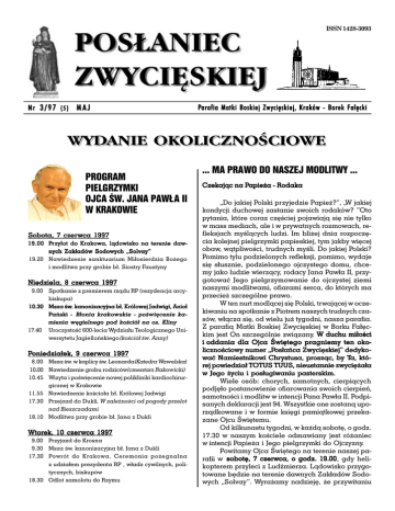 ISSN 1428-3093 Nr 3 / 9 7 ( 5 ) M A J Parafia Matki Boskiej Zwycięskiej, Krak ów - Borek FFałęcki ałęcki Kraków WYDANIE OKOLICZNOŚCIOWE PROGRAM PIELGRZYMKI OJCA ŚW. JANA PAWŁA II W KRAKOWIE Sobota, 7 cz er wca 1997 czer erwca 19.00 Pr zylot do Krakowa, lądowisko na terenie dawnych Zakładów Sodowych „Solvay „Solvay”” 19.20 Nawiedzenie sanktuarium Miłosierdzia Bożego i modlitwa przy grobie bł. Siostry Faustyny Niedziela, 8 czer wca 1997 czerwca 9.00 Spotkanie z premierem rządu RP (rezydencja arcybiskupa) 10.30 Msza św św.. kanonizacyjna bł. Królowej Jadwigi, Anioł Pański - Błonia krakowskie - poświęcenie kamienia węgielnego pod kościół na os. Kliny 17.40 Uroczystość 600-lecia Wydziału Teologicznego Uniwersytetu Jagiellońskiego (kościół św. Anny) Poniedziałek, 9 czer wca 1997 czerwca 8.00 Msza św. w kaplicy św. Leonarda (Katedra Wawelska) 10.00 Nawiedzenie grobu rodziców (cmentarz Rakowicki) 10.45 Wizyta i poświęcenie nowej polikliniki kardiochirurgicznej w Krakowie 11.55 Nawiedzenie kościoła bł. Królowej Jadwigi 17.30 Przejazd do Dukli. W zależności od pogody przelot nad Bieszczadami 18.10 Modlitwa przy grobie bł. Jana z Dukli Wtorek, 10 czer wca 1997 czerwca 9.00 Przyjazd do Krosna 9.30 Msza św. kanonizacyjna bł. Jana z Dukli 17.30 Powrót do Krakowa. Ceremonia pożegnalna z udziałem prezydenta RP , władz cywilnych, politycznych, biskupów 18.30 Odlot samolotu do Rzymu ... MA PRAWO DO NASZEJ MODLITWY ... Czekając na P apieża - Rodaka Papieża „Do jakiej Polski przyjedzie Papież?”, „W jakiej kondycji duchowej zastanie swoich rodaków? ”Oto pytania, które coraz częściej pojawiają się nie tylko w mass mediach, ale i w prywatnych rozmowach, refleksjach myślących ludzi. Im bliżej dnia rozpoczęcia kolejnej pielgrzymki papieskiej, tym jakby więcej obaw, wątpliwości, trudnych myśli. Do jakiej Polski? Pomimo tylu podzielonych refleksji, pomimo, wydaje się słusznie, podzielonego ojczystego domu, chcemy jako ludzie wierzący, rodacy Jana Pawła II, przygotować Jego pielgrzymowanie do ojczystej ziemi naszymi modlitwami, ofiarami serca, do których ma przecież szczególne prawo. W ten nurt modlącej się Polski, trwającej w oczekiwaniu na spotkanie z Piotrem naszych trudnych czasów, włącza się, od wielu już tygodni, nasza parafia. Z parafią Matki Boskiej Zwycięskiej w Borku Fałęckim jest On szczególnie związany. W duchu miłości i oddania dla Ojca Świętego pragniemy ten oko oko-licznościowy numer „P osłańca Zwycięskiej” dedyko „Posłańca dedyko-wać Namiestnikowi Chr ystusa, prosząc, by T a, któ Chrystusa, Ta, któ-rej powiedział TOTUS TUUS, nieustannie zwyciężała w Jego życiu i posługiwaniu pasterskim. Wiele osób: chorych, samotnych, cierpiących podjęło postanowienie ofiarowania swoich cierpień, samotności i modlitw w intencji Pana Pawła II. Podpisanych deklaracji jest 94. Wszystkie one zostaną uporządkowane i w formie księgi pamiątkowej przekazane Ojcu Świętemu. Od kilkunastu tygodni, w każdą sobotę, o godz. 17.30 w naszym kościele odmawiany jest różaniec w intencji Papieża i Jego pielgrzymki do Ojczyzny. Powitamy Ojca Świętego na terenie naszej pawca, o godz. 19.00 rafii w sobotę, 7 czer czerwca, 19.00, gdy helikopterem przyleci z Ludźmierza. Lądowisko przygotowane będzie na terenie dawnych Zakładów Sodowych „Solvay”. Wyrażamy nadzieję, że przywitaniu Papieża na ziemi krakowskiej i naszej, borkowskiej, towarzyszyć będzie wielu parafian, którzy nie tylko zgromadzą się wokół lądowiska, ale także będą obecni wzdłuż ulicy Zakopiańskiej, gdy będzie On jechał do Sanktuarium Bożego Miłosierdzia w Łagiewnikach. Bardzo prosimy o udekorowanie domów, balkonów, okien, flagami narodowymi, papieskimi, znakami religijnymi, obrazami, kwiatami, jako wyraźny znak, że są to domy ludzi wierzących, życzliwych Ojcu Świętemu, którego pot wsiąknął również w borkowską ziemię. Szczególnym wyrazem naszej wiary będzie udział we Mszy św. odprawianej przez Papieża na wca o godz. Błoniach krakowskich, w niedzielę 8 czer czerwca 10.30 10.30. Nie powinno tam nikogo z krakowian zabraknąć, spośród tych, którym zdrowie i siły pozwolą. Wspomnijmy lata minione, kiedy te Błonia jakby nie mogły pomieścić modlącego się i bierzmowanego tłu- W OCZEKIWANIU NA OJCA ŚWIĘTEGO Przygotowujemy się do kolejnej, piątej już z kolei pielgrzymki Ojca Świętego do Ojczyzny. Przygotowanie to obejmuje oczywiście najpierw stronę organizacyjną, by ta pielgrzymka przebiegła sprawnie, bezpiecznie i okazale, ale ważniejsze jest przygotowanie duchowe, byśmy sobie uświadomili, jak ważnym wydarzeniem dla naszego narodu, dla Kościoła katolickiego w Polsce i dla nas samych jest ta pielgrzymka, i jak wielkie dobra duchowe ona przyniesie, jeżeli ją dobrze przeżyjemy. Przybędzie do nas Namiestnik Chrystusowy, osoba o największym autorytecie moralnym na ziemi, jeden z najwybitniejszych papieży w dziejach Kościoła świętego, pierwszy Polak na Stolicy Piotrowej, który sławi imię Polski na całej ziemi, jak nikt z Polaków. Przybędzie, by umocnić nas w wierze, w miłości Boga i Ojczyzny, by narodowi naszemu stojącemu ciągle na rozdrożu wskazać właściwą drogę rozwoju. Nie wystarczy duma jaka nas ogarnia, gdy widzimy wspaniałą, niezmiernie gorliwą i mądrą działalność Ojca Świętego na arenie międzynarodowej i w życiu naszego Kościoła, nie wystarczy radość z tego, że znowu do nas przybędzie. Trzeba, byśmy szeroko otworzyli nasze umysły i serca i przygotowali je pod obfity zasiew Bożego Słowa z ust Namiestnika Chrystusowego, by ono padło na dobrą glebę naszych serc i obficie zaowocowało. Trzeba, byśmy się gorąco modlili o łaski Ducha Świętego, o siły duchowe i fizyczne dla Ojca Świętego na ten wielki trud apostolski, jaki Go czeka w naszej Ojczyźnie, trzeba się modlić za nasz naród i za
