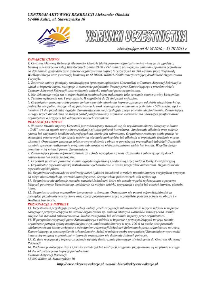 CENTRUM AKTYWNEJ REKREACJI Aleksander Okoński 62-800 Kalisz, ul. Stawiszyńska 10 obowiązujące od 01 XI 2010 – 31 III 2011 r. ZAWARCIE UMOWY 1. Centrum Aktywnej Rekreacji Aleksander Okoński (dalej zwanym organizatorem) oświadcza, Ŝe zgodnie z Ustawą o świadczeniu usług turystycznych z dnia 29.08.1997 roku (z późniejszymi zmianami) posiada zezwolenie na działalność gospodarczą w zakresie organizowania imprez turystycznych nr 346 wydane przez Wojewodę Wielkopolskiego oraz gwarancję bankową nr 651090/GW/00011/2008 zabezpieczającą działalność Organizatora Turystyki. 2. Zawarcie umowy pomiędzy zamawiającym (prawnym opiekunem Uczestnika) a Centrum Aktywnej Rekreacji o udział w imprezie turyst. następuje w momencie podpisania Umowy przez Zamawiającego i przedstawiciela Centrum Aktywnej Rekreacji oraz wpłacenia zaliczki, ustalonej przez organizatora. 3. Nie dokonanie wpłat rat w odpowiednich terminach jest traktowane jako zerwanie umowy z winy Uczestnika. 4. Terminy wpłacenia rat: I przy zapisie, II najpóźniej do 21 dni przed wyjazdem. 5. Organizator zastrzega sobie prawo zmiany ceny lub odwołania imprezy z przyczyn od siebie niezaleŜnych (np. podwyŜka cen paliw, decyzje władz państwowych, brak wymaganego minimum uczestników - 50% miejsc, itp.) w terminie 21 dni przed datą wyjazdu. Zamawiającemu nie przysługuje z tego powodu odszkodowanie. Zamawiający w ciągu trzech dni od dnia, w którym został poinformowany o zmianie warunków ma obowiązek poinformować organizatora o przyjęciu lub odrzuceniu nowych warunków. REALIZACJA UMOWY 6. W czasie trwania imprezy Uczestnik jest zobowiązany stosować się do regulaminu obozu (dostępny w biurze „CAR” oraz na stronie www.aktywnewakacje.pl) oraz poleceń instruktora. SpoŜywanie alkoholu oraz palenie tytoniu lub zaŜywanie środków odurzających na obozie jest zabronione. Organizator zastrzega sobie prawo (w sytuacjach ostatecznych) do uŜycia testów na obecność narkotyków lub alkoholu w organizmie (badanie moczu, alkomat). Organizator zastrzega sobie prawo wydalenia z obozu w powyŜszych przypadkach lub jeŜeli Uczestnik utrudnia sprawne realizowanie programu lub naraŜa na niebezpieczeństwo siebie lub innych. Wszelkie koszty powstałe w tej sytuacji ponosi Zamawiający. 7. Zamawiający ponosi odpowiedzialność za szkody wyrządzone z winy Uczestnika i zobowiązuje się do ich naprawienia lub pokrycia kosztów. 8. Uczestnik powinien posiadać w dniu wyjazdu wypełnioną i podpisaną przez rodzica Kartę Kwalifikacyjną. 9. Organizator zapewnia opiekę instruktorów-wychowawców w czasie przejazdów autokarami. Organizator nie zapewnia opieki pilota. 10. Organizator odpowiada za realizację ilości i jakości świadczeń w trakcie trwania imprezy z wyjątkiem przyczyn od niego niezaleŜnych np. warunki atmosferyczne, decyzje władz państwowych, siła wyŜsza itp. 11. Organizator nie dokonuje zwrotów wartości świadczeń, które nie zostały w pełni wykorzystane z przyczyn leŜących po stronie Uczestnika np. spóźnienie na miejsce zbiórki, rezygnacja z części lub całości imprezy, choroba i inne. 12. Organizator zaleca uczestnikom korzystanie z depozytu. Organizator nie ponosi odpowiedzialności za pieniądze, przedmioty wartościowe oraz rzeczy pozostawione przez uczestników podczas pobytu na obozie i w środkach transportu. REZYGNACJA Z IMPREZY 13. Uczestnikowi przysługuje zwrot pełnej wpłaty, jeŜeli rezygnacja lub niemoŜność wzięcia udziału w imprezie następuje z przyczyn leŜących po stronie organizatora np. zmiana istotnych warunków umowy (cena, termin, miejsce lub standard zakwaterowania, środek transportu) lub odwołanie imprezy przez organizatora. 14. W przypadku rezygnacji przez Zamawiającego z udziału w imprezie z przyczyn leŜących po jego stronie organizator potrąca opłatę manipulacyjną z tyt. anulowania imprezy w wys. 100 zł za osobę oraz pozostałe udokumentowane koszty związane z odwołaniem rezerwacji świadczeń dokonanych przez organizatora na rzecz Zamawiającego u poszczególnych usługodawców. JeŜeli w miejsce osoby rezygnującej Zamawiający wprowadzi inną osobę mogącą uczestniczyć w imprezie organizator nie dokonuje Ŝadnych potrąceń. 15. Za datę rezygnacji z imprezy przyjmuje się datę dostarczenia pisemnego oświadczenia do Centrum Aktywnej Rekreacji. 16. Reklamacje dotyczące ilości i jakości świadczeń lub realizacji programu przyjmowane są na piśmie w ciągu 14 dni od zakończenia imprezy pod adresem: Centrum Aktywnej Rekreacji 62-800 Kalisz, ul. Stawiszyńska 10 http://www.aktywnewakacje.pl, e-mail: [email protected]