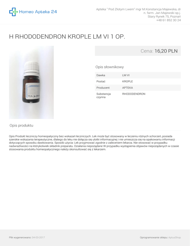 Apteka " Pod Złotym Lwem" mgr M.Konstancja Majewska, dr n. farm. Jan Majewski sp.j. Stary Rynek 75, Poznań +48 61 852 30 24 H RHODODENDRON KROPLE LM VI 1 OP. Cena: 16,20 PLN Opis słownikowy Dawka LM VI Postać KROPLE Producent APTEKA Substancja czynna RHODODENDRON Opis produktu Opis Produkt leczniczy homeopatyczny bez wskazań leczniczych. Lek może być stosowany w leczeniu różnych schorzeń, posiada szerokie wskazania terapeutyczne, dlatego do leku nie dołącza się ulotki informacyjnej i nie umieszcza się na opakowaniu informacji dotyczących sposobu dawkowania. Sposób użycia: Lek przyjmować zgodnie z zaleceniem lekarza. Nie stosować w przypadku nadwrażliwości na którykolwiek składnik preparatu. Działania niepożądane W przypadku wystąpienia objawów niepożądanych w czasie stosowania produktu homeopatycznego należy skonsultować się z lekarzem. Plik wygenerowano: 04-03-2017 Powered by TCPDF (www.tcpdf.org) Oprogramowanie sklepu: AptusShop