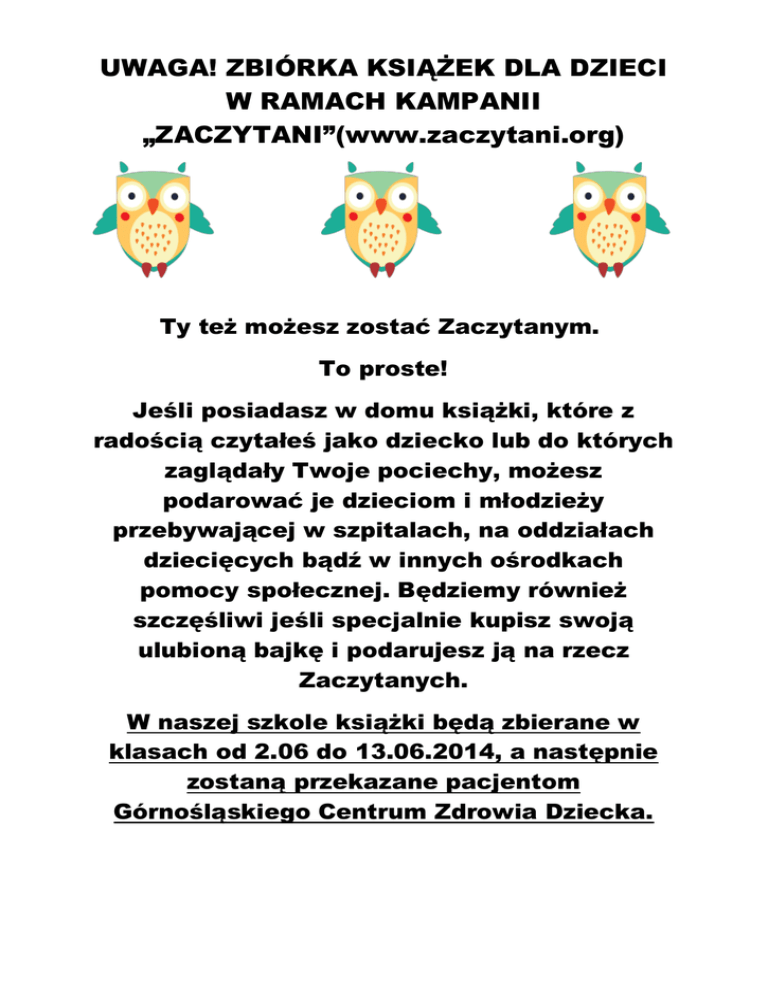 UWAGA! ZBIÓRKA KSIĄŻEK DLA DZIECI W RAMACH KAMPANII „ZACZYTANI”(www.zaczytani.org) Ty też możesz zostać Zaczytanym. To proste! Jeśli posiadasz w domu książki, które z radością czytałeś jako dziecko lub do których zaglądały Twoje pociechy, możesz podarować je dzieciom i młodzieży przebywającej w szpitalach, na oddziałach dziecięcych bądź w innych ośrodkach pomocy społecznej. Będziemy również szczęśliwi jeśli specjalnie kupisz swoją ulubioną bajkę i podarujesz ją na rzecz Zaczytanych. W naszej szkole książki będą zbierane w klasach od 2.06 do 13.06.2014, a następnie zostaną przekazane pacjentom Górnośląskiego Centrum Zdrowia Dziecka.