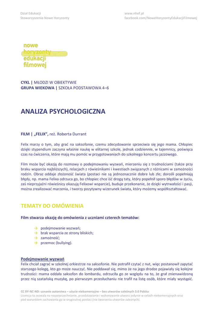 Dział Edukacji Stowarzyszenie Nowe Horyzonty www.nhef.pl facebook.com/NoweHoryzontyEdukacjiFilmowej CYKL | MŁODZI W OBIEKTYWIE GRUPA WIEKOWA | SZKOŁA PODSTAWOWA 4–6 ANALIZA PSYCHOLOGICZNA FILM | „FELIX”, reż. Roberta Durrant Felix marzy o tym, aby grać na saksofonie, czemu zdecydowanie sprzeciwia się jego mama. Chłopiec dzięki stypendium zaczyna właśnie naukę w elitarnej szkole, jednak codziennie, w tajemnicy, poświęca czas na ćwiczenia, które mają mu pomóc w przygotowaniach do szkolnego koncertu jazzowego. Film może być okazją do rozmowy o podejmowaniu wyzwań, mierzeniu się z trudnościami (także przy braku wsparcia najbliższych), relacjach z rówieśnikami i kwestiach związanych z różnicami w zamożności rodzin. Obraz oddaje złożoność świata (postaci nie są jednoznacznie dobre lub złe; dorośli popełniają błędy, np. mama Felixa odrzuca go, bo chłopiec chce iść drogą taty, który popełnił sporo błędów w życiu, zaś nieprzyjaźni rówieśnicy okazują Felixowi wsparcie), buduje przekonanie, że dzięki wytrwałości i pasji, można zrealizować marzenia, i tworzy pozytywny wizerunek świata, który możemy współkształtować. TEMATY DO OMÓWIENIA Film stwarza okazję do omówienia z uczniami czterech tematów: → → → → podejmowanie wyzwań; brak wsparcia ze strony bliskich; zamożność; przemoc (bullying). Podejmowanie wyzwań Felix chciał zagrać w szkolnej orkiestrze na saksofonie. Nie potrafił czytać z nut, więc postanowił zapytać starszego kolegę, kto go może nauczyć. Nie poddawał się, mimo że na jego drodze pojawiały się kolejne trudności: mama oddała saksofon do lombardu, odrzuciła go ze względu na to, że grał znienawidzoną przez nią szatańską muzykę, po pierwszym przesłuchaniu nie trafił na listę osób, które miały wystąpić. CC BY-NC-ND: uznanie autorstwa – użycie niekomercyjne – bez utworów zależnych 3.0 Polska Licencja ta zezwala na rozpowszechnianie, przedstawianie i wykonywanie utworu jedynie w celach niekomercyjnych oraz pod warunkiem zachowania go w oryginalnej postaci (nie tworzenia utworów zależnych). Każdą przeciwność losu starał się pokonać. Był wytrwały, a przed oczami miał ciągle swoje marzenie. Omawiając ten wątek, warto zadać uczniom następujące pytania naprowadzające: → → → czym jest wyzwanie? co dla Felixa było wyzwaniem, które zdecydował się podjąć? jakie trudności napotkał Felixa na swojej drodze i jak je rozwiązał? Brak wsparcia ze strony bliskich Felix realizował swoje marzenie wbrew zakazowi mamy. Tak bardzo pragnął grać na saksofonie, że nie mógł z niego zrezygnować. Szukał wsparcia u kolegi zmarłego taty, nauczycielki (pomogła mu zorganizować solowy występ na szkolnym koncercie), brata i siostry (ukrywali go przed mamą). Wierzył mocno w swoje marzenia i dzięki temu potrafił innych ludzi przekonać do pomocy. Omawiając ten temat, warto poprosić uczniów, by rozważyli następujące problemy: → → → → → co czujemy, kiedy najbliższe osoby nie zgadzają się z nami; jak mama Felixa reagowała na to, że pragnął grać na saksofonie; czy mama Felixa pomagała mu w spełnieniu jego marzenia; gdzie Felix szukał wsparcia, kiedy nie dostawał go od mamy; kto ostatecznie wsparł Felixa. Zamożność Omawiając problem zamożności, warto zachęcić uczniów, by zastanowili się, jak to jest pochodzić z mniej zamożnej rodziny. Można zadać dzieciom pytania naprowadzające: z jakich powodów rówieśnicy dokuczali Felixowi w szkole, czy Felix był mniej ważny ze względu na swoje pochodzenie, czego Felix się wstydził, co oznaczał skrót NNP. Należy zauważyć, że w przeciwieństwie do znacznej większości uczniów prywatnej placówki, do której Felix zaczął uczęszczać, chłopiec pochodził z mało majętnej rodziny. Jego plecak wyglądał inaczej, na lekcje podrzucali go sąsiedzi furgonetką, podczas gdy inne dzieci zajeżdżały dobrymi autami. Starsze dzieci używały skrótu NNP, który oznaczał Nie Nasz Poziom; rozumiały przez to: za mało bogaty, pochodzący z nieodpowiedniej rodziny, mieszkający w złej dzielnicy. Felix zaskarbił sobie popularność w szkole organizacją dobroczynnego koncertu i solowym występem na szkolnym koncercie. Przemoc (bullying) Z jakiego powodu silniejsze osoby mogą innych dręczyć? Należy podkreślić, że powody znęcania się nad kimś mogą być bardzo błahe. Trójka chłopaków upatrzyła sobie Felixa jako ofiarę, bo wyglądał inaczej niż oni – pochodził z innej dzielnicy, z mniej zamożnej rodziny, miał inny plecak i był nowy w szkole. W jaki sposób dokuczano Felixowi? Jeden chłopak po kryjomu kopnął go w trakcie meczu, mazano mu plecak, zerwano jego plakat, przerzucano się jego fletem. Warto poprosić uczniów, by przypomnieli sobie, w jaki sposób Felix radził sobie w tych trudnych sytuacjach i podkreślić znaczenie wsparcia, jakie okazywali mu dwaj koledzy, którzy bronili go przed innymi czy dzielili się z nim lunchem. CC BY-NC-ND: uznanie autorstwa – użycie niekomercyjne – bez utworów zależnych 3.0 Polska Licencja ta zezwala na rozpowszechnianie, przedstawianie i wykonywanie utworu jedynie w celach niekomercyjnych oraz pod warunkiem zachowania go w oryginalnej postaci (nie tworzenia utworów zależnych). 2