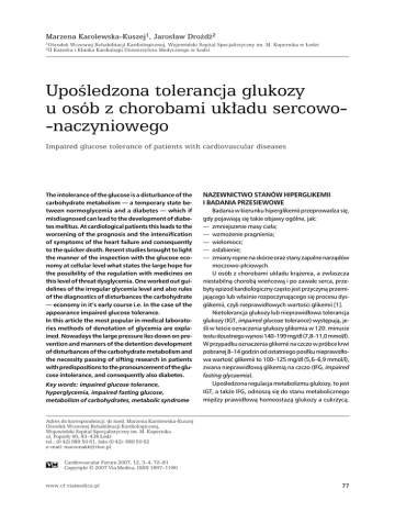 Marzena Karolewska-Kuszej1, Jarosław Drożdż2 1Ośrodek 2II Wczesnej Rehabilitacji Kardiologicznej, Wojewódzki Szpital Specjalistyczny im. M. Kopernika w Łodzi Katedra i Klinika Kardiologii Uniwersytetu Medycznego w Łodzi Upośledzona tolerancja glukozy u osób z chorobami układu sercowo-naczyniowego Impaired glucose tolerance of patients with cardiovascular diseases The intolerance of the glucose is a disturbance of the carbohydrate metabolism — a temporary state between normoglycemia and a diabetes — which if misdiagnosed can lead to the development of diabetes mellitus. At cardiological patients this leads to the worsening of the prognosis and the intensification of symptoms of the heart failure and consequently to the quicker death. Resent studies brought to light the manner of the inspection with the glucose economy at cellular level what states the large hope for the possibility of the regulation with medicines on this level of threat dysglycemia. One worked out guidelines of the irregular glycemia level and also rules of the diagnostics of disturbances the carbohydrate — economy in it’s early course i.e. in the case of the appearance impaired glucose tolerance. In this article the most popular in medical laboratories methods of denotation of glycemia are explained. Nowadays the large pressure lies down on prevention and manners of the detention development of disturbances of the carbohydrate metabolism and the necessity passing of sifting research in patients with predispositions to the pronouncement of the glucose intolerance, and consequently also diabetes. Key words: impaired glucose tolerance, hyperglycemia, impaired fasting glucose, metabolism of carbohydrates, metabolic syndrome NAZEWNICTWO STANÓW HIPERGLIKEMII I BADANIA PRZESIEWOWE Badania w kierunku hiperglikemii przeprowadza się, gdy pojawiają się takie objawy ogólne, jak: — zmniejszenie masy ciała; — wzmożenie pragnienia; — wielomocz; — osłabienie; — zmiany ropne na skórze oraz stany zapalne narządów moczowo-płciowych. U osób z chorobami układu krążenia, a zwłaszcza niestabilną chorobą wieńcową i po zawale serca, przebyty epizod kardiologiczny często jest przyczyną przemijającego lub właśnie rozpoczynającego się procesu dysglikemii, czyli nieprawidłowych wartości glikemii [1]. Nietolerancja glukozy lub nieprawidłowa tolerancja glukozy (IGT, impaired glucose tolerance) występują, jeśli w teście oznaczenia glukozy glikemia w 120. minucie testu doustnego wynosi 140–199 mg/dl (7,8–11,0 mmol/l). W przypadku oznaczenia glikemii na czczo w próbce krwi pobranej 8–14 godzin od ostatniego posiłku nieprawidłowa wartość glikemii to 100–125 mg/dl (5,6–6,9 mmol/l), zwana nieprawidłową glikemią na czczo (IFG, impaired fasting glycaemia). Upośledzona regulacja metabolizmu glukozy, to jest IGT, a także IFG, odnoszą się do stanu metabolicznego między prawidłową homeostazą glukozy a cukrzycą. Adres do korespondencji: dr med. Marzena Karolewska-Kuszej Ośrodek Wczesnej Rehabilitacji Kardiologicznej, Wojewódzki Szpital Specjalistyczny im. M. Kopernika ul. Popioły 40, 93–438 Łódź tel.: (0 42) 689 50 61, faks (0 42): 689 50 62 e-mail: [email protected] Cardiovascular Forum 2007, 12, 3–4, 72–81 Copyright © 2007 Via Medica, ISSN 1897–1180 www.cf.viamedica.pl 77 Cardiovascular Forum 2007, tom 12, nr 3–4 Pojęcia te nie są jednak wymienne i odpowiadają innym zaburzeniom regulacji metabolizmu glukozy: IFG — na czczo, a IGT — po posiłku [2]. Upośledzona tolerancja glukozy stanowi stadium naturalnego przebiegu zaburzenia metabolizmu węglowodanów. Osoby z IGT oraz z IFG są obciążone zwiększonym ryzykiem rozwoju cukrzycy i powikłań makroangiopatycznych i mają podobny profil ryzyka sercowo-naczyniowego [3, 4]. Nazewnictwo stanów hiperglikemicznych: — prawidłowa glikemia na czczo: 60–99 mg/dl (3,4– –5,5 mmol/l); — IFG: 100–125 md/dl (5,6–6,9 mmol/l); — IGT w 2. godzinie testu tolerancji glukozy według Światowej Organizacji Zdrowia (WHO, World Health Organisation): 140–199 mg/dl (7,8–11 mmol/l) [6]. Pacjenci, u których stwierdzono IGT lub IFG, mogą się znajdować przez większość czasu w stanie euglikemii, na co wskazuje prawidłowy lub niemal prawidłowy odsetek hemoglobiny glikowanej. Nieprawidłowa glikemia na czczo i nieprawidłowa tolerancja glukozy same nie stanowią jednostek klinicznych, lecz raczej kategorie ryzyka rozwoju cukrzycy i choroby sercowo-naczyniowej [7, 8]. Mogą one stanowić etap pośredni każdego z procesów chorobowych wymienionych na rycinie 1. Nieprawidłowa tolerancja glukozy często wiąże się z zespołem metabolicznym (zespołem insulinooporności) [9]. Podsumowując: IGT może nie mieć bezpośredniego udziału w patogenezie chorób sercowo-naczynio- Rycina 1. Zasady rozpoznawania zaburzeń gospodarki węglowodanowej 78 wych, lecz służyć raczej jako wskaźnik zwiększonego ryzyka sercowo-naczyniowego. U osób z IGT nietolerancję glukozy stwierdza się tylko po doustnym obciążeniu [8–10]. Z powodu ograniczeń wynikających z tematu niniejszej pracy nie omówiono innych typów etiologicznych obejmujących defekty, zaburzenia czy procesy prowadzące do rozwoju cukrzycy. ZESPÓŁ METABOLICZNY Nie ma obecnie jednej przyjętej definicji tego zespołu. Określa się raczej zbiór jednostek przyczynowo-skutkowych tworzących jego cechy, takich jak: — upośledzona regulacja metabolizmu glukozy lub cukrzyca; i/lub — insulinooporność (w sytuacji hiperinsulinemii i euglikemii, wychwyt glukozy poniżej najniższego kwartylu w badanej populacji) [11]; oraz co najmniej 2 z następujących składowych: — ciśnienie tętnicze powyżej 140/90 mm Hg; — stężenie triglicerydów w osoczu powyżej 150 mg/dl (> 1,7 mmol/l) lub stężenie cholesterolu frakcji HDL w osoczu poniżej 35 mg/dl (< 0,9 mmol/l) u mężczyzn i poniżej 39 mg/dl (< 1,0 mmol/l) u kobiet; — otyłość centr