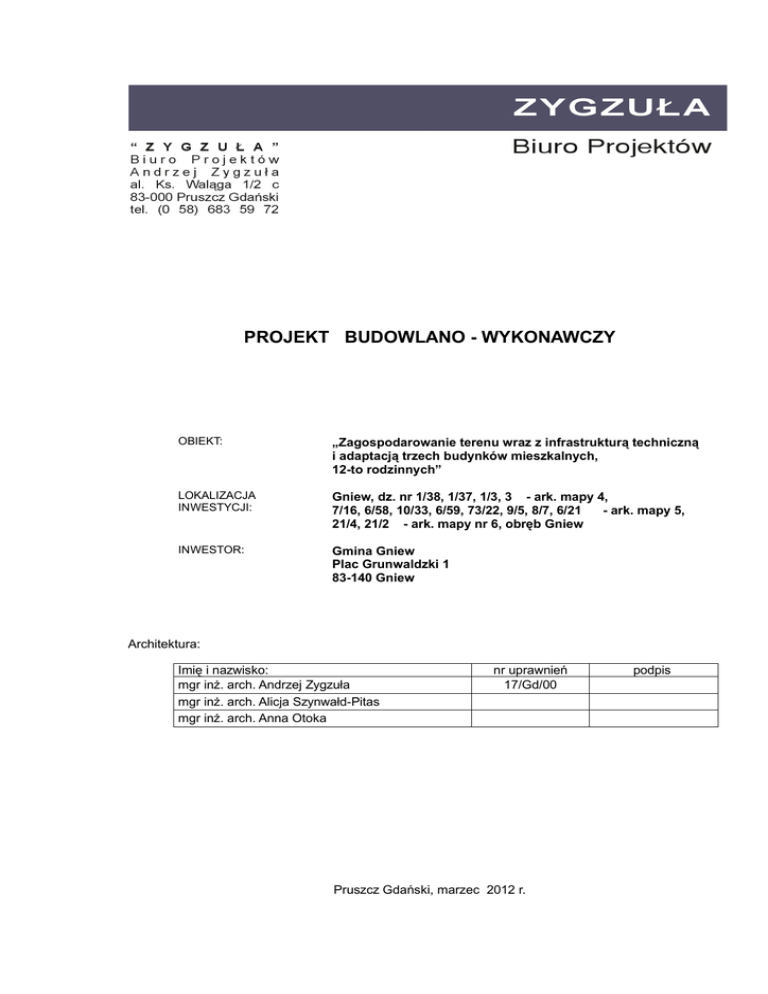 PROJEKT BUDOWLANO - WYKONAWCZY OBIEKT: „Zagospodarowanie terenu wraz z infrastrukturą techniczną i adaptacją trzech budynków mieszkalnych, 12-to rodzinnych” LOKALIZACJA INWESTYCJI: Gniew, dz. nr 1/38, 1/37, 1/3, 3 - ark. mapy 4, 7/16, 6/58, 10/33, 6/59, 73/22, 9/5, 8/7, 6/21 - ark. mapy 5, 21/4, 21/2 - ark. mapy nr 6, obręb Gniew INWESTOR: Gmina Gniew Plac Grunwaldzki 1 83-140 Gniew Architektura: Imię i nazwisko: mgr inż. arch. Andrzej Zygzuła mgr inż. arch. Alicja Szynwałd-Pitas mgr inż. arch. Anna Otoka nr uprawnień 17/Gd/00 Pruszcz Gdański, marzec 2012 r. podpis ZAWARTOŚĆ OPRACOWANIA I. – – – – – – – – – – Załączniki Kopie uprawnień projektowych projektantów Zaświadczenia o przynależności do izby Oświadczenia projektanta do projektu o o zgodności projektu z obowiązującymi przepisami. Typowy projekt architektoniczno-budowlany budynku mieszkalnego wielorodzinnego "Dom nad bulwarem 15" wykonany przez ARCHON+ Biuro Projektów, 32-400 Myślenice, ul. Słowackiego 86 -dołączony do projektu jako oddzielne opracowanie. Zgody projektanta projektu typowego budynku mieszkalnego „Dom nad bulwarem 15” na zmiany w projekcie. Uzgodnienie sieci telekomunikacyjnej RN/28436/2012 z dn. 21.03.2012r. z Telekomunikacją Polską S.A. Uzgodnienie ZUDP w Gniewie. Uzgodnienie z Energa-Operator SA z 28.05.2012r. Uzgodnienie z Powiatowym Zarządem Dróg w Tczewie. Decyzja podziału dr nr 10/33. II. Opis 1. Dane ogólne 2. Opis do projektu zagospodarowania terenu 3. Opis techniczny adaptacji projektu typowego budynku mieszkalnego, wielorodzinnego 4. Warunki przeciwpożarowe do zagospodarowania terenu. 5. Informacja BiOZ III. Część graficzna Z-1 Z-2 Z-3 A-1 A-2 A-3 A-4 D-1 D-2 D-3 D-4 D-5 D-6 D-7 D-8 D-9 D-10 D-11 D-12 Plan zagospodarowania terenu Zbiorcza plansza sieci Projekt zieleni Śmietnik Murki przy wejściu do budynku nr 1 wraz z balustradą Murki przy wejściu do budynku nr 2 wraz z balustradą Murki przy wejściu do budynku nr 3 wraz z balustradą Zestaw Zamek Lokomotywa z wagonem Paskownica Karuzela tarczowa Sprężynowiec skuter Sprężynowiec konik Sprężynowiec delfin Siatka ochronna (piłkochwyt) Kosz do koszykówki Kosz Ławka zoparciem Detal furtki do śmietnika 1:500 1:500 1:500 1:50 1:5, 1:50 1:5, 1:50 1:5, 1:50 1:20 2 II. OPIS 1. DANE OGÓLNE 1.1. Przedmiot inwestycji Trzy budynki mieszklane, wielorodzinne wraz z infrastrukturą techniczną. 1.2. Podstawa opracowania 1. Umowa z Inwestorem na wykonanie adaptacji gotowego projektu budynku mieszkalnego wielorodzinnego "Dom nad bulwarem 15" wykonanego przez ARCHON+ Biuro Projektów, 32-400 Myślenice, ul. Słowackiego 86. 2. Wypis i wyrys z Miejscowego Planu Zagospodarowania Przestrzennego. 3. Specyfikacja warunków zamówienia. 1.3. Materiały wyjściowe 1. Dane materiałowe i programowe dostarczone przez Inwestora. 2. Dokumentacja projektowa typowego budynku mieszkalnego wielorodzinnego "Dom nad bulwarem 15" wykonanego przez ARCHON+ Biuro Projektów, 32-400 Myślenice, ul. Słowackiego 86. 3. Mapa sytuacyjna do celów projektowych . 4. Badania gruntowe wykonane przez biuro Usług Geologicznych GEOPROFIL Zygmunt Kola, 80-809 Gdańsk, ul. Cieszyńskiego 38/34B. 2. OPIS DO PROJEKTU ZAGOSPODAROWANIA TERENU 2.0. Opis terenu Teren ma kształt niereguralny, różnica poziomów wynosi około 4m. Teren jest pochylony w kierunku południowym. Teren jest częściowo uzbrojony od strony południowo-wschodniej, wzdłuż ul. 27 Stycznia.Od strony pd-zach. teren sąsiaduje z zespołem istniejących garaży, a od strony pd.-wsch. z istn. ul. 27 Stycznia. 2.1. Rozwiązania przestrzenne Na działce nr 1/38 projektuje się trzy powtarzalne budynki mieszkalne wielorodzinne nr 1, nr 2 i nr 3, 4-kondygnacyjne, podpiwniczone. Od strony południowej adaptowanych budynków projektuje się parkingi łącznie z 56 miejscami postojowymi w tym 3 miejsca dla osób niepełnosprawnych. W obrębie działki zaprojektowano drogę wewnętrzną zapewniającą dojazd do miejsc postojowych. W części południowej przedsięwzięcia projektuje się strefę rekreacyjną z placem zabaw dla dzieci i z elementami małej architektury oraz ogrodzony plac do gier sportowych. Na działce zlokalizowano dwa miejsca gromadzenia odpadów bytowych - od strony zach. i od strony pn. - wsch. działki. Na dz. projektuje się układ ciągów pieszych. Główny ciąg pieszy pn-pd. stanowi oś kompozycyjną zakończoną skupiskiem zieleni wysokiej. Ponadto projektuje się trawniki i opaski żwirowe wokół budynków. Wzdłuż drogi powiatowej (ul. 27 Stycznia) projektuje się szpaler drzew oraz wymianę wodociągu. Wzdłuż zach. granicy działki nr 1/38, w sąsiedztwie garaży projektuje się pas zieleni o zróżnicowanej wysokości o funkcji izolacyjnej. Opracowanie obejmuje także projekt drogi dojazdowej wraz z chodnikami, oświetleniem, odwodnieniem i placykiem do zawracania zlokalizowanej na działkach nr 6/58, 7/16, 1/37. Opracowanie obejmuje także projekt infrastruktury technicznej: sieć wodociągowa, przyłącza wodociągowe, sieć kanalizacji sanitarnej, przyłącza kanalizacji sanitarnej, sieć kanalizacji deszczowej, przyłącze kanalizacji deszczowej, drenaż, sieć cieplna, przyłącza cieplne, linia kablowa oświetlenia ulicznego i oświetlenia terenu. 2.2. Założenia kompozycyjne Podstawowe założenia kompozycyjne: - utworzenie spójnej przestrzeni wewnątrzosiedlowej, - operowanie zharmonizowaną formą architektoniczną, - zachowanie obowiązującej i nieprzekraczalnej linii zabudowy, stworzenie pierzei, - wyznaczenie osi kompozycyjnej 2.3. Właściwości ekologiczne obiektu 2.3.1. Projektowane budynki nie mają negatywnego wpływu na środowisko przyrodnicze, ludzi i obiekty sąsiadujące. 2.3.2. Ochrona powietrza: obiekty nie są monitorem spalin technologicznych. 2.4. Bilans powierzchni terenu Dla działki nr 1/38: Powierzchnia działki nr 1/38: Projektowana powierzchnia zabudowy działki Procentowy udział zabudowy na dz