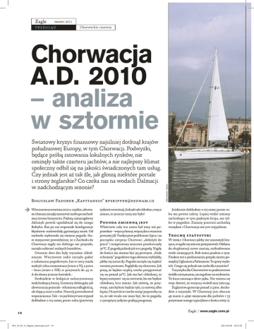 Żagle marzec 2011 Przegląd Chorwackie czartery Światowy kryzys finansowy najsilniej dotknął krajów południowej Europy, w tym Chorwacji. Podwyżki, będące próbą ratowania lokalnych rynków, nie ominęły także czarteru jachtów, a nie najlepszy klimat społeczny odbił się na jakości świadczonych tam usług. Czy jednak jest aż tak źle, jak głoszą niektóre portale i strony żeglarskie? Co czeka nas na wodach Dalmacji w nadchodzącym sezonie? Bogusław Pazorek „Kapitansio” [email protected] Wieczorem 9 września 2010 r. ciężkie, ołowiane chmury zaczęły zasnuwać niebo po zachodniej stronie horyzontu. Piękny, szmaragdowy Adriatyk powoli upodabniał się do sinego Bałtyku. Raz po raz wspaniałe konfiguracje błyskawic rozświetlały gęstniejący mrok. Od zachodu szykowała się zmiana pogody. Stare miejscowe powiedzenie, że z Zachodu do Chorwacji nigdy nic dobrego nie przyszło, zaczęło nabierać realnych kształtów... Ostatnie dwa dni były wyraźnie chłodniejsze. Wieczorem radio zaczęło gadać o załamaniu pogodowym. Już w nocy miała nadejść silna tramontana (wiatr z N), a jutro – bora (wiatr z NE) w porywach do 45 w. A do domu jeszcze kawałek... Siedziałem w kokpicie zafascynowany nadchodzącą burzą. Grzmoty dobiegały jak złowieszczy pomruk – stłumiony odległością, ale dający znać o sobie. Nastrój prowokował wspomnienia. Tak – to już któryś tam wyjazd dokładnie o tej samej porze roku (pierwszy 14 014_18_03_11_Raport_chorwacki.in14 14 tydzień września). Jednak tak chłodno, wręcz zimno, to jeszcze tutaj nie było! Pogoda zmienną jest Właściwie cały ten sezon był inny niż poprzednie – więcej chmur, więcej dni z wiatrem powyżej 5B. Tradycyjnie pod koniec lipca i na początku sierpnia Chorwaci „dołożyli do pieca” i temperatury znacznie przekroczyły 30°C. Z pogodą jednak jak to z pogodą. Nigdy do końca nie można być jej pewnym. „Stałe schematy” pogodowe tego akwenu wyblakły, jakby się zatraciły. Pogoda zaczęła się rządzić swoimi prawami. Pogłębiły się ekstrema. Jak piszą, że będzie cieplej, trzeba przygotować się na ponad 30°C. Jak ma być chłodniej, to lepiej rozejrzeć się za swetrem, bo nie będzie chłodniej, lecz zimno. Jak mówią, że przywieje, niechybnie będzie tyle, co mówią albo lepiej. Oczywiście trzeba wziąć poprawkę na to, że tak wcale nie musi być, bo to pogoda, a synoptycy jedynie podają prognozę. archiwum "Żagli" Chorwacja A.D. 2010 – analiza w sztormie Jeżdżenie dokładnie o tej samej porze roku ma pewne zalety. Lepiej widać zmiany zachodzące w tym pięknym kraju, nie tylko w pogodzie. Zmiany przecież zachodzą wszędzie i Chorwacja nie jest wyjątkiem. Trochę statystyki W 2009 r. Chorwaci jakby nie zauważyli kryzysu, w ogóle się nim nie przejmowali. Oddano do eksploatacji nowe mariny, rozbudowano wiele istniejących. Rok temu pisałem o tym. Pisałem też o podniesieniu przęsła mostu pomiędzy Uglianem a Pašmanem. To spory wydatek. Czego się jednak nie zrobi dla turystów? Turystyka dla Chorwatów to podstawowe źródło utrzymania, szczególnie na wybrzeżu. To kura znosząca złote jajka. Nie można się więc dziwić, że wszyscy wokół niej tańcują. Żeglarstwo generuje ponad 11 proc. dochodów z turystyki. W Chorwacji jest obecnie 49 marin z 4290 miejscami dla jachtów i 33 przystanie innego typu (dane z końca 2009 r.). Żagle | www.zagle.com.pl 2011-02-09 10:27:29