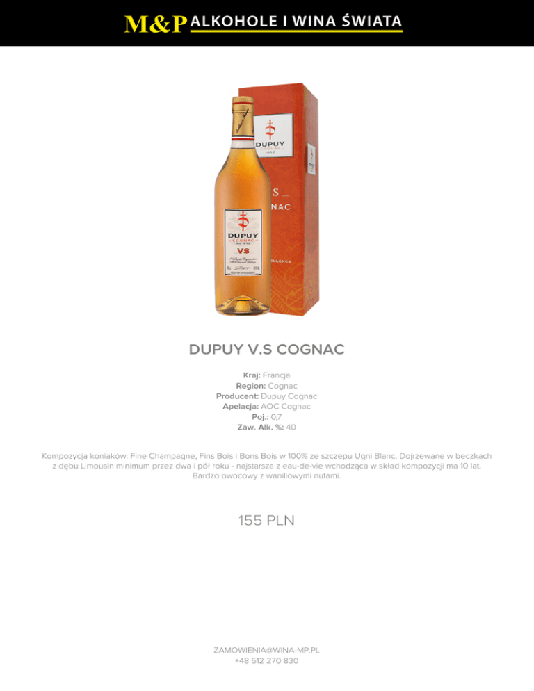 DUPUY V.S COGNAC Kraj: Francja Region: Cognac Producent: Dupuy Cognac Apelacja: AOC Cognac Poj.: 0,7 Zaw. Alk. %: 40 Kompozycja koniaków: Fine Champagne, Fins Bois i Bons Bois w 100% ze szczepu Ugni Blanc. Dojrzewane w beczkach z dębu Limousin minimum przez dwa i pół roku - najstarsza z eau-de-vie wchodząca w skład kompozycji ma 10 lat. Bardzo owocowy z waniliowymi nutami. 155 PLN [email protected] +48 512 270 830