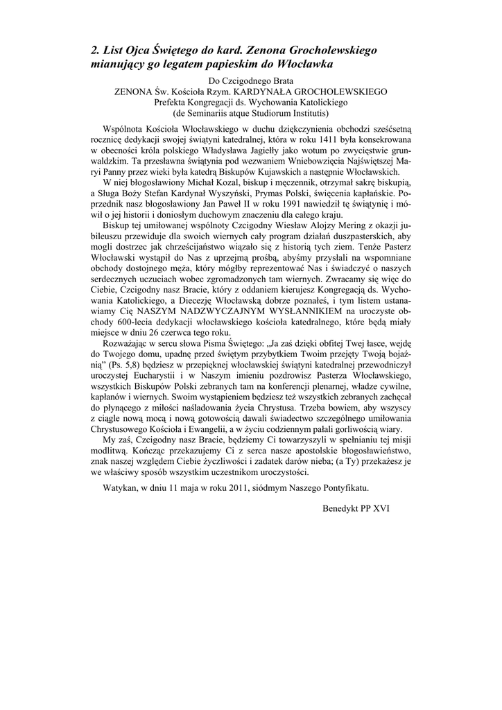 2. List Ojca Świętego do kard. Zenona Grocholewskiego mianujący go legatem papieskim do Włocławka Do Czcigodnego Brata ZENONA Św. Kościoła Rzym. KARDYNAŁA GROCHOLEWSKIEGO Prefekta Kongregacji ds. Wychowania Katolickiego (de Seminariis atque Studiorum Institutis) Wspólnota Kościoła Włocławskiego w duchu dziękczynienia obchodzi sześćsetną rocznicę dedykacji swojej świątyni katedralnej, która w roku 1411 była konsekrowana w obecności króla polskiego Władysława Jagiełły jako wotum po zwycięstwie grunwaldzkim. Ta przesławna świątynia pod wezwaniem Wniebowzięcia Najświętszej Maryi Panny przez wieki była katedrą Biskupów Kujawskich a następnie Włocławskich. W niej błogosławiony Michał Kozal, biskup i męczennik, otrzymał sakrę biskupią, a Sługa Boży Stefan Kardynał Wyszyński, Prymas Polski, święcenia kapłańskie. Poprzednik nasz błogosławiony Jan Paweł II w roku 1991 nawiedził tę świątynię i mówił o jej historii i doniosłym duchowym znaczeniu dla całego kraju. Biskup tej umiłowanej wspólnoty Czcigodny Wiesław Alojzy Mering z okazji jubileuszu przewiduje dla swoich wiernych cały program działań duszpasterskich, aby mogli dostrzec jak chrześcijaństwo wiązało się z historią tych ziem. Tenże Pasterz Włocławski wystąpił do Nas z uprzejmą prośbą, abyśmy przysłali na wspomniane obchody dostojnego męża, który mógłby reprezentować Nas i świadczyć o naszych serdecznych uczuciach wobec zgromadzonych tam wiernych. Zwracamy się więc do Ciebie, Czcigodny nasz Bracie, który z oddaniem kierujesz Kongregacją ds. Wychowania Katolickiego, a Diecezję Włocławską dobrze poznałeś, i tym listem ustanawiamy Cię NASZYM NADZWYCZAJNYM WYSŁANNIKIEM na uroczyste obchody 600-lecia dedykacji włocławskiego kościoła katedralnego, które będą miały miejsce w dniu 26 czerwca tego roku. Rozważając w sercu słowa Pisma Świętego: „Ja zaś dzięki obfitej Twej łasce, wejdę do Twojego domu, upadnę przed świętym przybytkiem Twoim przejęty Twoją bojaźnią” (Ps. 5,8) będziesz w przepięknej włocławskiej świątyni katedralnej przewodniczył uroczystej Eucharystii i w Naszym imieniu pozdrowisz Pasterza Włocławskiego, wszystkich Biskupów Polski zebranych tam na konferencji plenarnej, władze cywilne, kapłanów i wiernych. Swoim wystąpieniem będziesz też wszystkich zebranych zachęcał do płynącego z miłości naśladowania życia Chrystusa. Trzeba bowiem, aby wszyscy z ciągle nową mocą i nową gotowością dawali świadectwo szczególnego umiłowania Chrystusowego Kościoła i Ewangelii, a w życiu codziennym pałali gorliwością wiary. My zaś, Czcigodny nasz Bracie, będziemy Ci towarzyszyli w spełnianiu tej misji modlitwą. Kończąc przekazujemy Ci z serca nasze apostolskie błogosławieństwo, znak naszej względem Ciebie życzliwości i zadatek darów nieba; (a Ty) przekażesz je we właściwy sposób wszystkim uczestnikom uroczystości. Watykan, w dniu 11 maja w roku 2011, siódmym Naszego Pontyfikatu. Benedykt PP XVI