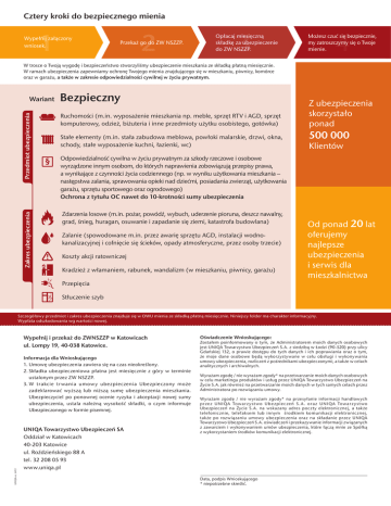 Cztery kroki do bezpiecznego mienia 1 Wypełnij załączony wniosek. 2 Przekaż go do ZW NSZZP. 3 Opłacaj miesięczną składkę za ubezpieczenie do ZW NSZZP. 4 Możesz czuć się bezpiecznie, my zatroszczymy się o Twoje mienie. W trosce o Twoją wygodę i bezpieczeństwo stworzyliśmy ubezpieczenie mieszkania ze składką płatną miesięcznie. W ramach ubezpieczenia zapewniamy ochronę Twojego mienia znajdującego się w mieszkaniu, piwnicy, komórce oraz w garażu, a także w zakresie odpowiedzialności cywilnej w życiu prywatnym. Przedmiot ubezpieczenia Bezpieczny Ruchomości (m.in. wyposażenie mieszkania np. meble, sprzęt RTV i AGD, sprzęt komputerowy, odzież, biżuteria i inne przedmioty użytku osobistego, gotówka) Zakres ubezpieczenia Wariant Zdarzenia losowe (m.in. pożar, powódź, wybuch, uderzenie pioruna, deszcz nawalny, grad, śnieg, huragan, osuwanie i zapadanie się ziemi, katastrofa budowlana) Stałe elementy (m.in. stała zabudowa meblowa, powłoki malarskie, drzwi, okna, schody, stałe wyposażenie kuchni, łazienki, wc) Z ubezpieczenia skorzystało ponad 500 000 Klientów Odpowiedzialność cywilna w życiu prywatnym za szkody rzeczowe i osobowe wyrządzone innym osobom, do których naprawienia zobowiązują przepisy prawa, a wynikające z czynności życia codziennego (np. w wyniku użytkowania mieszkania – następstwa zalania, sprawowania opieki nad dziećmi, posiadania zwierząt, użytkowania garażu, sprzętu sportowego oraz ogrodowego) Ochrona z tytułu OC nawet do 10-krotności sumy ubezpieczenia Zalanie (spowodowane m.in. przez awarię sprzętu AGD, instalacji wodnokanalizacyjnej i cofnięcie się ścieków, opady atmosferyczne, przez osoby trzecie) Koszty akcji ratowniczej Kradzież z włamaniem, rabunek, wandalizm (w mieszkaniu, piwnicy, garażu) Przepięcia Od ponad 20 lat oferujemy najlepsze ubezpieczenia i serwis dla mieszkalnictwa Stłuczenie szyb Szczegółowy przedmiot i zakres ubezpieczenia znajduje się w OWU mienia ze składką płatną miesięcznie. Niniejszy folder ma charakter informacyjny. Wypłata odszkodowania wg wartości nowej. Wypełnij i przekaż do ZWNSZZP w Katowicach ul. Lompy 19, 40-038 Katowice. UNIQA wz. 6413 Informacja dla Wnioskującego 1. Umowę ubezpieczenia zawiera się na czas nieokreślony. 2.Składka ubezpieczeniowa płatna jest miesięcznie z góry w terminie ustalonym przez ZW NSZZP. 3.W trakcie tr wania umow y ubezpieczenia Ubezpieczony może zadeklarować wyższą lub niższą sumę ubezpieczenia mieszkania. Ubezpieczyciel po ponownej ocenie ryzyka i akceptacji nowej sumy ubezpieczenia, ustala należną wysokość składki, o czym informuje Ubezpieczonego w formie pisemnej. UNIQA Towarzystwo Ubezpieczeń SA Oddział w Katowicach 40-203 Katowice ul. Roździeńskiego 88 A tel. 32 208 05 93 www.uniqa.pl Oświadczenie Wnioskującego: Zostałem poinformowany o tym, że Administratorem moich danych osobowych jest UNIQA Towarzystwo Ubezpieczeń S.A. z siedzibą w Łodzi (90-520) przy ulicy Gdańskiej 132, o prawie dostępu do tych danych i ich poprawiania oraz o tym, że moje dane osobowe będą wykorzystywane w celu obsługi i wykonywania umowy ubezpieczenia, rozliczeń z pośrednikami ubezpieczonymi, a także w celach analitycznych i archiwalnych. Wyrażam zgodę / nie wyrażam zgody* na przetwarzanie moich danych osobowych w celu marketingu produktów i usług przez UNIQA Towarzystwo Ubezpieczeń na Życie S.A. jak również na przetwarzanie moich danych w tych samych celach przez Administratora po rozwiązaniu umowy. Wyrażam zgodę / nie wyrażam zgody* na przesyłanie informacji handlowych przez UNIQA Towarz yst wo Ubezpiec zeń S. A . oraz UNIQA Towarz yst wo Ubezpieczeń na Życie S.A. na wskazany adres poczty elektronicznej, a także telefonicznie, telefaksem lub innym środkiem komunikacji elektronicznej, także po rozwiązaniu umowy ubezpieczenia oraz na składanie przez UNIQA Towarzystwo Ubezpieczeń S.A. oświadczeń i przekazywanie informacji związanych z zawarciem i wykonywaniem umów ubezpieczenia, które łączą mnie ze Spółką z wykorzystaniem środków komunikacji elektronicznej. Data, podpis Wnioskującego * niepotrzebne skreślić. r ta Specjalna ofe SZZP N W Z w ó k n o dla czł Szanowni Państwo, Przedstawiamy specjalny program ubezpieczeniowy przygotowany dla Państwa wraz z Zarządem Wojewódzkim NSZZ Policjantów. Proponujemy kompelksowe ubezpieczenia Państwa mieszkań i domów jednorodzinnych z unikatową formą płatności – miesięczną składką opłacaną do ZW NSZZP. Ofertę tą kierujemy do funkcjonariuszy i pracowników służb mundurowych oraz emerytowanych pracowników i funkcjonariuszy oraz ich rodzin i partnerów. Dodatkowo przygotowaliśmy dla Państwa dodatkowe bonifikaty na pozostałe produkty ubezpieczeniowe z oferty UNIQA. Szczegółowych informacji udzielają: ZW NSZZP w Katowicach, ul. Lompy 19 Katowice, tel. 32 200 19 72, 32 200 20 37, www.zwnszzp-katowice.pl Śląska Agencja Ubezpieczeń GWARANT, 44-335 Jastrzębie Zdrój ul. Opolska 1, tel. 32 476 34 80, 500 196 303, 500 222 258, www.sau-gwarant.pl UNIQA Towarzystwo Ubezpieczeń SA Oddział w Katowicach 40-203 Katowice, ul. Roździeńskiego 88 A, tel. 32 208 05 93, www.uniqa.pl Wniosek o ubezpieczenie mieszkania/domu ze składką płatną miesięcznie Wypełnij i przekaż do biura ZW NSZZP Deklaruję chęć przystąpienia do ubezpieczenia wg wybranego wariantu z sumą ubezpieczenia mieszkania/domu oraz składką płatną miesięcznie w wysokości zaznaczonej w tabeli (właściwe zaznaczyć X): Wariant Bezpieczny - wartość odtworzeniowa Nazwisko i imię Wnioskującego PESEL Ja, niżej podpisany składam wniosek o ubezpieczenie mieszkania/domu zlokalizowanego: Ulica, nr domu, nr lokalu Kod, miejscowość Nr telefonu e-mail Powierzchnia lokalu (m ) 2 Składka miesięczna (zł) Suma OC w życiu ubezpieczenia (zł)prywatnym (zł) 5,00 6 000 10,0012 000 15,0018 000 30,0036 000 60 000 120 000 180 000 200 000 1. Upoważn