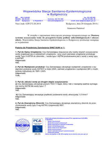 Wojewódzka Stacja Sanitarno-Epidemiologiczna w Bydgoszczy NIP: 953-11-08-025 REGON: 000 293 841 85-031 Bydgoszcz ul. Kujawska 4 Centrala: 523 761 800 www. pwis bydgoszcz. pl Nasz znak: EZP.272.20.2014 fax: 523 459 840 tel. 523 761 800 – 99 e-mail: wsse. bydgoszcz @ pis. gov. pl Bydgoszcz, dnia 20 listopada 2014 r. Szanowni Państwo! W związku z zapytaniami dotyczącymi przetargu nieograniczonego na: Dostawę systemu oczyszczania wody do przygotowywania podłoży mikrobiologicznych i odczynników, Wojewódzka Stacja Sanitarno-Epidemiologiczna w Bydgoszczy przekazuje następujące wyjaśnienia: Pytania do Przedmiotu Zamówienia SIWZ SUW nr 1: 1. Pyt do Opisu Urządzenia: Czy Zamawiający dopuszcza aby każdy stopień oczyszczania wody znajdował się w oddzielnym urządzeniu , przy czym pierwsze urządzenie produkuje wodę Typu II ASTM do zbiornika , i woda typu I ASTM produkowana jest z wody z wody typu II ASTM? Odpowiedź: NIE. 2. Pyt do Wydajność produkcji: Czy Zamawiający akceptuje wydajność urządzenie o wydajności produkcji wody ASTM II w ilości 20l/h, zamiast urządzenia o wydajności 8l/h z możliwością rozbudowy do 16l/h i 24l/h. Odpowiedź: TAK. 3. Pyt do Jakości wody po drugim etapie oczyszczania: a) Czy Zamawiający akceptuje poziom TOC=1-5ppb, który i tak z nawiązką spełnia wymagania normy ASTM dla wody typu I ? Odpowiedź: NIE. b) Czy Zamawiający akceptuje prędkość podawania wody ultraczystej 1,5 l/min? Odpowiedź: NIE. 4. Pyt do Zewnętrzny Zbiornik: Czy Zamawiający akceptuje zewnętrzny zbiornik do przechowywania wody typu II wg ASTM o pojemności 60l? Odpowiedź: NIE. Dział Laboratoryjny akredytowany przez PCA, sygnatariusza ILAC-MRA, w dziedzinie: − Badań chemicznych − Badań klinicznych medycznych − Badań dotyczących inżynierii środowiska − Badań mikrobiologicznych − Badań właściwości fizycznych − Badań sensorycznych − Badań radiochemicznych i promieniowania − Pobierania próbek Zakres akredytacji nr AB 435 znajduje się na stronie www. pca. gov. pl 5. Pyt do Funkcje dodatkowe: a) Czy Zamawiający dopuszcza rezygnację z włącznika nożnego dla wody Typu I w zamian za precyzyjny dozownik odmierzonych objętości wody przy pomocy ruchomego dżojstika? Odpowiedź: TAK. TAK b) Które elementy systemu Zamawiający chce montować na ścianie? Odpowiedź: SYSTEM BEZ ZBIORNIKA. 6. Pyt do Archiwizacji danych: Czy Zamawiający dopuszcza możliwość archiwizacji danych zgodnie z zasadami GLP przez możliwość podłączenia drukarki do złącza RS 232? Odpowiedź: NIE. 7. Pyt do Wyświetlacz: a) Czy Zamawiający jako dotykowy wyświetlacz umożliwiający pracę w rękawiczkach rozumie dotykowy monitor LCD czy dotykowy panel sterujący? Odpowiedź: PANEL STERUJACY. b) Czy Zamawiający zaakceptuje instrukcję ze szczegółowym opisem czynności wspartym i rysunkami w postaci wydrukowanej i zalaminowanej planszy lub w wersji elektronicznej na komputer zamiast opisu czynności na wyświetlaczu? Odpowiedź: NIE. 8. Pyt do Zbiornika do przechowywania wody: Czy Zamawiający zaakceptuje zbiornik z najwyższej jakości polietylenu odpornego na działanie wody typu II ASTM i bezpiecznego dla zastosowań w przemyśle spożywczym zamiast zbiornika do którego trzeba wkładać worki do przechowywania wody? Odpowiedź: NIE. 9. Pyt do materiały eksploatacyjne dostarczone wraz z urządzeniem: Czy Zamawiający dopuści jeden filtr końcowy zamontowany na urządzeniu podlegający możliwości kilku krotnej autoklawizacji zamiast dostarczenia 3 filtrów końcowych na wymianę? Odpowiedź: NIE. 10. Pyt do Wyposażenie opcjonalne: a) Czy Zamawiający pod pojęciem wyposażenia opcjonalnego rozumie możliwość późniejszego rozbudowania systemu o dodatkowe elementy? Odpowiedź: TAK. b) O jakiego typu moduł pomiaru TOC chodzi Zamawiającemu? Odpowiedź: MONTOWANY WWENĄTRZ URZĄDZENIA. 2/ 5 c) Czy Zamawiający akceptuje wydajność urządzenie o wydajności produkcji wody ASTM II w ilości 20l/h, zamiast urządzenia o wydajności 8l/h z możliwością rozbudowy do 16l/h i 24l/h? Odpowiedź: TAK. 11. Pyt do Pobór mocy: Czy Zamawiający akceptuje, że każde urządzenie w ramach dwustopniowego systemu oczyszczania wody i zbiornik pobiera moc 100 W? Odpowiedź: TAK. 12. Pyt do Wymiary: Czy Zamawiający akceptuje wymiary dwóch urządzeń 372x330x603 i zbiornika fi=380 x h=912 i masę urządzenia pierwszego stopnia oczyszczania 26 kg i drugiego stopnia oczyszczania 24 kg i zbiornika 60l 10kg/70kg zamiast zaproponowanych? Odpowiedź: NIE. Pytania do Przedmiotu Zamówienia SIWZ SUW nr 2: 1. Pyt do Opisu Urządzenia: Czy Zamawiający dopuszcza aby każdy stopień oczyszczania wody znajdował się w oddzielnym urządzeniu , przy czym pierwsze urządzenie produkuje wodę Typu II ASTM do zbiornika , i woda typu I ASTM produkowana jest z wody z wody typu II ASTM? Odpowiedź: NIE. 2. Pyt do Wydajność produkcji: Czy Zamawiający akceptuje wydajność urządzenie o wydajności produkcji wody ASTM II w ilości 20l/h, zamiast urządzenia o wydajności 8l/h z możliwością rozbudowy do 16l/h i 24l/h? Odpowiedź: TAK. 3. Pyt do Jakości wody po drugim etapie oczyszczania: a) Czy Zamawiający akceptuje poziom TOC<5ppb, który i tak z nawiązką spełnia wymagania normy ASTM dla wody typu I ? Odpowiedź: 1. NIE b) Czy Zamawiający akceptuje prędkość podawania wody ultraczystej 1,5 l/min? Odpowiedź: NIE. 4. Pyt do Zewnętrzny Zbiornik: Czy Zamawiający akceptuje zewnętrzny zbiornik do przechowywania wody typu II wg ASTM o pojemności 60l? Odpowiedź: NIE. 5. Pyt do Funkcje dodatkowe: a) Czy Zamawiający dopuszcza rezygnację z włącznika nożnego dla wody Typu I w zamian za precyzyjny dozownik wody Typu I odmierzonych objętości wody przy pomocy ruchomego dżojstika oraz dozownik wody Typu II w postaci 'pistoletu' dozującego na ruchomym przewodzie? Odpowiedź: TAK. 3/ 5 b) Co Zamawiający rozumie jako system montowany na blacie - czy chodzi o dozownik dla