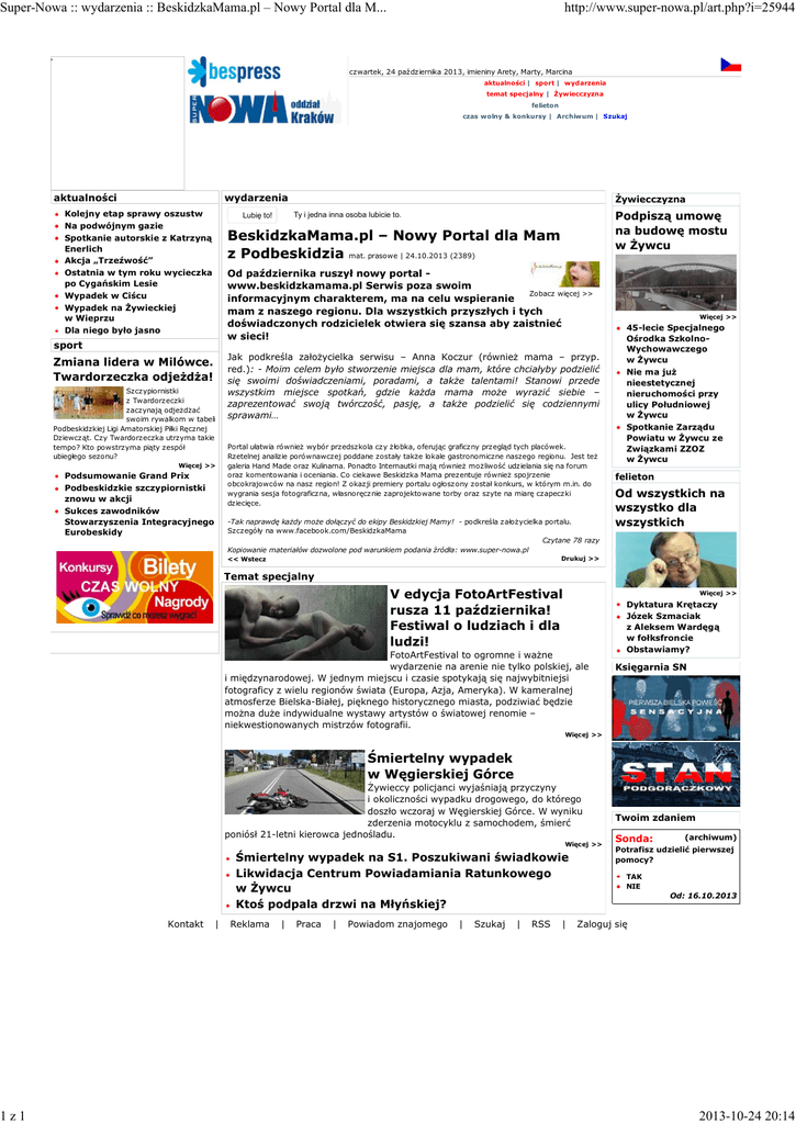 Super-Nowa :: wydarzenia :: BeskidzkaMama.pl – Nowy Portal dla M... 1z1 http://www.super-nowa.pl/art.php?i=25944 ' czwartek, 24 października 2013, imieniny Arety, Marty, Marcina aktualności | sport | wydarzenia temat specjalny | Żywiecczyzna felieton czas wolny & konkursy | Archiwum | Szukaj aktualności wydarzenia Kolejny etap sprawy oszustw Na podwójnym gazie Spotkanie autorskie z Katrzyną Enerlich Akcja „Trzeźwość” Ostatnia w tym roku wycieczka po Cygańskim Lesie Wypadek w Ciścu Wypadek na Żywieckiej w Wieprzu Dla niego było jasno Żywiecczyzna Podpiszą umowę na budowę mostu w Żywcu Ty i jedna inna osoba lubicie to. Lubię to! BeskidzkaMama.pl – Nowy Portal dla Mam z Podbeskidzia mat. prasowe | 24.10.2013 (2389) Od października ruszył nowy portal www.beskidzkamama.pl Serwis poza swoim Zobacz więcej >> informacyjnym charakterem, ma na celu wspieranie mam z naszego regionu. Dla wszystkich przyszłych i tych doświadczonych rodzicielek otwiera się szansa aby zaistnieć w sieci! sport Zmiana lidera w Milówce. Twardorzeczka odjeżdża! Szczypiornistki z Twardorzeczki zaczynają odjeżdżać swoim rywalkom w tabeli Podbeskidzkiej Ligi Amatorskiej Piłki Ręcznej Dziewcząt. Czy Twardorzeczka utrzyma takie tempo? Kto powstrzyma piąty zespół ubiegłego sezonu? Więcej >> Podsumowanie Grand Prix Podbeskidzkie szczypiornistki znowu w akcji Sukces zawodników Stowarzyszenia Integracyjnego Eurobeskidy Jak podkreśla założycielka serwisu – Anna red.): - Moim celem było stworzenie miejsca się swoimi doświadczeniami, poradami, a wszystkim miejsce spotkań, gdzie każda zaprezentować swoją twórczość, pasję, a sprawami… Koczur (również mama – przyp. dla mam, które chciałyby podzielić także talentami! Stanowi przede mama może wyrazić siebie – także podzielić się codziennymi Portal ułatwia również wybór przedszkola czy żłobka, oferując graficzny przegląd tych placówek. Rzetelnej analizie porównawczej poddane zostały także lokale gastronomiczne naszego regionu. Jest też galeria Hand Made oraz Kulinarna. Ponadto Internautki mają również możliwość udzielania się na forum oraz komentowania i oceniania. Co ciekawe Beskidzka Mama prezentuje również spojrzenie obcokrajowców na nasz region! Z okazji premiery portalu ogłoszony został konkurs, w którym m.in. do wygrania sesja fotograficzna, własnoręcznie zaprojektowane torby oraz szyte na miarę czapeczki dziecięce. -Tak naprawdę każdy może dołączyć do ekipy Beskidzkiej Mamy! - podkreśla założycielka portalu. Szczegóły na www.facebook.com/BeskidzkaMama Czytane 78 razy Kopiowanie materiałów dozwolone pod warunkiem podania źródła: www.super-nowa.pl Więcej >> 45-lecie Specjalnego Ośrodka SzkolnoWychowawczego w Żywcu Nie ma już nieestetycznej nieruchomości przy ulicy Południowej w Żywcu Spotkanie Zarządu Powiatu w Żywcu ze Związkami ZZOZ w Żywcu felieton Od wszystkich na wszystko dla wszystkich Drukuj >> << Wstecz Temat specjalny V edycja FotoArtFestival rusza 11 października! Festiwal o ludziach i dla ludzi! Więcej >> FotoArtFestival to ogromne i ważne wydarzenie na arenie nie tylko polskiej, ale i międzynarodowej. W jednym miejscu i czasie spotykają się najwybitniejsi fotograficy z wielu regionów świata (Europa, Azja, Ameryka). W kameralnej atmosferze Bielska-Białej, pięknego historycznego miasta, podziwiać będzie można duże indywidualne wystawy artystów o światowej renomie – niekwestionowanych mistrzów fotografii. Dyktatura Krętaczy Józek Szmaciak z Aleksem Wardęgą w fołksfroncie Obstawiamy? Księgarnia SN Więcej >> Śmiertelny wypadek w Węgierskiej Górce Żywieccy policjanci wyjaśniają przyczyny i okoliczności wypadku drogowego, do którego doszło wczoraj w Węgierskiej Górce. W wyniku zderzenia motocyklu z samochodem, śmierć poniósł 21-letni kierowca jednośladu. Więcej >> Śmiertelny wypadek na S1. Poszukiwani świadkowie Likwidacja Centrum Powiadamiania Ratunkowego w Żywcu Ktoś podpala drzwi na Młyńskiej? Kontakt | Reklama | Praca | Powiadom znajomego | Szukaj | RSS | Twoim zdaniem Sonda: (archiwum) Potrafisz udzielić pierwszej pomocy? TAK NIE Od: 16.10.2013 Zaloguj się 2013-10-24 20:14