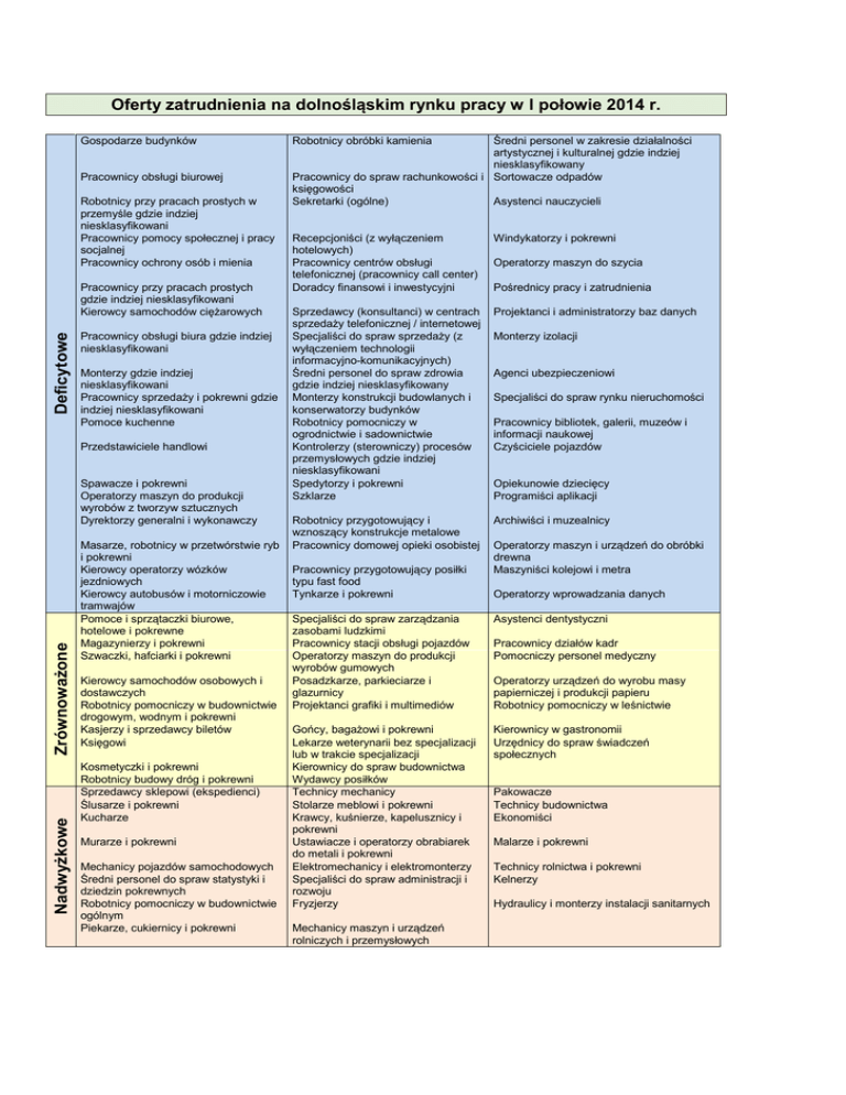 Oferty zatrudnienia na dolnośląskim rynku pracy w I połowie 2014 r. Gospodarze budynków Pracownicy obsługi biurowej Robotnicy przy pracach prostych w przemyśle gdzie indziej niesklasyfikowani Pracownicy pomocy społecznej i pracy socjalnej Pracownicy ochrony osób i mienia Deficytowe Pracownicy przy pracach prostych gdzie indziej niesklasyfikowani Kierowcy samochodów ciężarowych Pracownicy obsługi biura gdzie indziej niesklasyfikowani Monterzy gdzie indziej niesklasyfikowani Pracownicy sprzedaży i pokrewni gdzie indziej niesklasyfikowani Pomoce kuchenne Przedstawiciele handlowi Nadwyżkowe Zrównoważone Spawacze i pokrewni Operatorzy maszyn do produkcji wyrobów z tworzyw sztucznych Dyrektorzy generalni i wykonawczy Masarze, robotnicy w przetwórstwie ryb i pokrewni Kierowcy operatorzy wózków jezdniowych Kierowcy autobusów i motorniczowie tramwajów Pomoce i sprzątaczki biurowe, hotelowe i pokrewne Magazynierzy i pokrewni Szwaczki, hafciarki i pokrewni Kierowcy samochodów osobowych i dostawczych Robotnicy pomocniczy w budownictwie drogowym, wodnym i pokrewni Kasjerzy i sprzedawcy biletów Księgowi Kosmetyczki i pokrewni Robotnicy budowy dróg i pokrewni Sprzedawcy sklepowi (ekspedienci) Ślusarze i pokrewni Kucharze Murarze i pokrewni Mechanicy pojazdów samochodowych Średni personel do spraw statystyki i dziedzin pokrewnych Robotnicy pomocniczy w budownictwie ogólnym Piekarze, cukiernicy i pokrewni Robotnicy obróbki kamienia Średni personel w zakresie działalności artystycznej i kulturalnej gdzie indziej niesklasyfikowany Pracownicy do spraw rachunkowości i Sortowacze odpadów księgowości Sekretarki (ogólne) Asystenci nauczycieli Recepcjoniści (z wyłączeniem hotelowych) Pracownicy centrów obsługi telefonicznej (pracownicy call center) Doradcy finansowi i inwestycyjni Windykatorzy i pokrewni Sprzedawcy (konsultanci) w centrach sprzedaży telefonicznej / internetowej Specjaliści do spraw sprzedaży (z wyłączeniem technologii informacyjno-komunikacyjnych) Średni personel do spraw zdrowia gdzie indziej niesklasyfikowany Monterzy konstrukcji budowlanych i konserwatorzy budynków Robotnicy pomocniczy w ogrodnictwie i sadownictwie Kontrolerzy (sterowniczy) procesów przemysłowych gdzie indziej niesklasyfikowani Spedytorzy i pokrewni Szklarze Projektanci i administratorzy baz danych Robotnicy przygotowujący i wznoszący konstrukcje metalowe Pracownicy domowej opieki osobistej Archiwiści i muzealnicy Pracownicy przygotowujący posiłki typu fast food Tynkarze i pokrewni Operatorzy maszyn do szycia Pośrednicy pracy i zatrudnienia Monterzy izolacji Agenci ubezpieczeniowi Specjaliści do spraw rynku nieruchomości Pracownicy bibliotek, galerii, muzeów i informacji naukowej Czyściciele pojazdów Opiekunowie dziecięcy Programiści aplikacji Operatorzy maszyn i urządzeń do obróbki drewna Maszyniści kolejowi i metra Operatorzy wprowadzania danych Specjaliści do spraw zarządzania zasobami ludzkimi Pracownicy stacji obsługi pojazdów Operatorzy maszyn do produkcji wyrobów gumowych Posadzkarze, parkieciarze i glazurnicy Projektanci grafiki i multimediów Asystenci dentystyczni Gońcy, bagażowi i pokrewni Lekarze weterynarii bez specjalizacji lub w trakcie specjalizacji Kierownicy do spraw budownictwa Wydawcy posiłków Technicy mechanicy Stolarze meblowi i pokrewni Krawcy, kuśnierze, kapelusznicy i pokrewni Ustawiacze i operatorzy obrabiarek do metali i pokrewni Elektromechanicy i elektromonterzy Specjaliści do spraw administracji i rozwoju Fryzjerzy Kierownicy w gastronomii Urzędnicy do spraw świadczeń społecznych Mechanicy maszyn i urządzeń rolniczych i przemysłowych Pracownicy działów kadr Pomocniczy personel medyczny Operatorzy urządzeń do wyrobu masy papierniczej i produkcji papieru Robotnicy pomocniczy w leśnictwie Pakowacze Technicy budownictwa Ekonomiści Malarze i pokrewni Technicy rolnictwa i pokrewni Kelnerzy Hydraulicy i monterzy instalacji sanitarnych Oferty zatrudnienia na dolnośląskim rynku pracy w I połowie 2014 r. Zestawienie opracowano w Dolnośląskim Wojewódzkim Urzędzie Pracy na podstawie danych statystycznych z Załącznika 3 do sprawozdania MPiPS-01 za I półrocze 2014 r. W zestawieniu ujęto dominujące w I połowie 2014 r. elementarne grupy zawodów w zawodach deficytowych, zrównoważonych i nadwyżkowych. Wśród zawodów deficytowych wykazano te elementarne grupy zawodów, w których odnotowano napływ co najmniej 50 ofert zatrudnienia. W zawodach zrównoważonych wykazano te elementarne grupy zawodów, w których wpłynęło co najmniej 10 ofert pracy i odnotowano napływ co najmniej 10 osób bezrobotnych. W grupie zawodów nadwyżkowych wykazano te elementarne grupy zawodów, w których odnotowano napływ co najmniej 500 bezrobotnych.