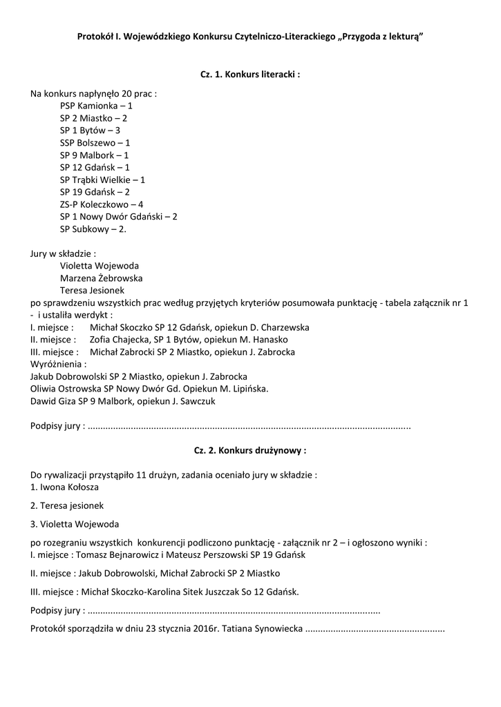 Protokół I. Wojewódzkiego Konkursu Czytelniczo-Literackiego „Przygoda z lekturą” Cz. 1. Konkurs literacki : Na konkurs napłynęło 20 prac : PSP Kamionka – 1 SP 2 Miastko – 2 SP 1 Bytów – 3 SSP Bolszewo – 1 SP 9 Malbork – 1 SP 12 Gdańsk – 1 SP Trąbki Wielkie – 1 SP 19 Gdańsk – 2 ZS-P Koleczkowo – 4 SP 1 Nowy Dwór Gdański – 2 SP Subkowy – 2. Jury w składzie : Violetta Wojewoda Marzena Żebrowska Teresa Jesionek po sprawdzeniu wszystkich prac według przyjętych kryteriów posumowała punktację - tabela załącznik nr 1 - i ustaliła werdykt : I. miejsce : Michał Skoczko SP 12 Gdańsk, opiekun D. Charzewska II. miejsce : Zofia Chajecka, SP 1 Bytów, opiekun M. Hanasko III. miejsce : Michał Zabrocki SP 2 Miastko, opiekun J. Zabrocka Wyróżnienia : Jakub Dobrowolski SP 2 Miastko, opiekun J. Zabrocka Oliwia Ostrowska SP Nowy Dwór Gd. Opiekun M. Lipińska. Dawid Giza SP 9 Malbork, opiekun J. Sawczuk Podpisy jury : ............................................................................................................................... Cz. 2. Konkurs drużynowy : Do rywalizacji przystąpiło 11 drużyn, zadania oceniało jury w składzie : 1. Iwona Kołosza 2. Teresa jesionek 3. Violetta Wojewoda po rozegraniu wszystkich konkurencji podliczono punktację - załącznik nr 2 – i ogłoszono wyniki : I. miejsce : Tomasz Bejnarowicz i Mateusz Perszowski SP 19 Gdańsk II. miejsce : Jakub Dobrowolski, Michał Zabrocki SP 2 Miastko III. miejsce : Michał Skoczko-Karolina Sitek Juszczak So 12 Gdańsk. Podpisy jury : ................................................................................................................... Protokół sporządziła w dniu 23 stycznia 2016r. Tatiana Synowiecka .......................................................