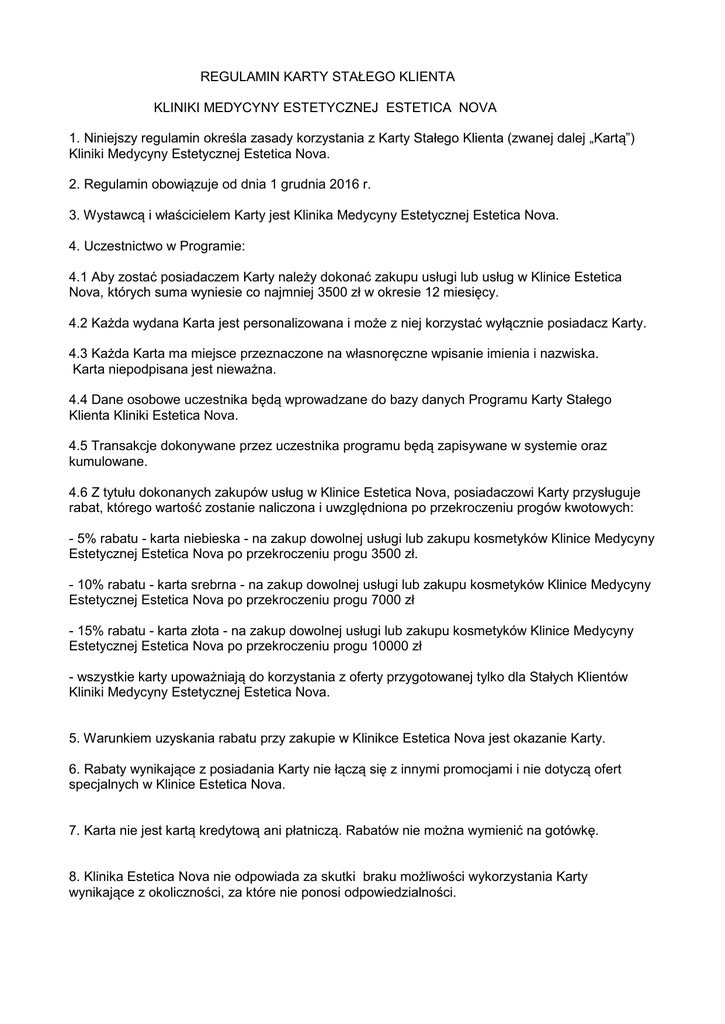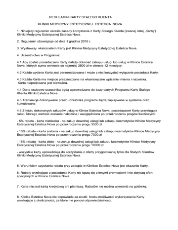 REGULAMIN KARTY STAŁEGO KLIENTA KLINIKI MEDYCYNY ESTETYCZNEJ ESTETICA NOVA 1. Niniejszy regulamin określa zasady korzystania z Karty Stałego Klienta (zwanej dalej „Kartą”) Kliniki Medycyny Estetycznej Estetica Nova. 2. Regulamin obowiązuje od dnia 1 grudnia 2016 r. 3. Wystawcą i właścicielem Karty jest Klinika Medycyny Estetycznej Estetica Nova. 4. Uczestnictwo w Programie: 4.1 Aby zostać posiadaczem Karty należy dokonać zakupu usługi lub usług w Klinice Estetica Nova, których suma wyniesie co najmniej 3500 zł w okresie 12 miesięcy. 4.2 Każda wydana Karta jest personalizowana i może z niej korzystać wyłącznie posiadacz Karty. 4.3 Każda Karta ma miejsce przeznaczone na własnoręczne wpisanie imienia i nazwiska. Karta niepodpisana jest nieważna. 4.4 Dane osobowe uczestnika będą wprowadzane do bazy danych Programu Karty Stałego Klienta Kliniki Estetica Nova. 4.5 Transakcje dokonywane przez uczestnika programu będą zapisywane w systemie oraz kumulowane. 4.6 Z tytułu dokonanych zakupów usług w Klinice Estetica Nova, posiadaczowi Karty przysługuje rabat, którego wartość zostanie naliczona i uwzględniona po przekroczeniu progów kwotowych: - 5% rabatu - karta niebieska - na zakup dowolnej usługi lub zakupu kosmetyków Klinice Medycyny Estetycznej Estetica Nova po przekroczeniu progu 3500 zł. - 10% rabatu - karta srebrna - na zakup dowolnej usługi lub zakupu kosmetyków Klinice Medycyny Estetycznej Estetica Nova po przekroczeniu progu 7000 zł - 15% rabatu - karta złota - na zakup dowolnej usługi lub zakupu kosmetyków Klinice Medycyny Estetycznej Estetica Nova po przekroczeniu progu 10000 zł - wszystkie karty upoważniają do korzystania z oferty przygotowanej tylko dla Stałych Klientów Kliniki Medycyny Estetycznej Estetica Nova. 5. Warunkiem uzyskania rabatu przy zakupie w Klinikce Estetica Nova jest okazanie Karty. 6. Rabaty wynikające z posiadania Karty nie łączą się z innymi promocjami i nie dotyczą ofert specjalnych w Klinice Estetica Nova. 7. Karta nie jest kartą kredytową ani płatniczą. Rabatów nie można wymienić na gotówkę. 8. Klinika Estetica Nova nie odpowiada za skutki braku możliwości wykorzystania Karty wynikające z okoliczności, za które nie ponosi odpowiedzialności. 9. Wymiana Karty uprawniającej do korzystania z wyższego rabatu nastąpi po zgłoszeniu przez posiadacza Karty, informacji o przekroczeniu kolejnego progu kwotowego i zwrotu dotychczas posiadanej Karty. 10. Prawo do korzystania z wyższego rabatu przysługuje w chwili zakupu zabiegu lub produktu w przypadku gdy jest on dokonywany po pełnym przekroczeniu progu rabatowego. 11. Karta ważna jest do momentu, aż jej właściciel: Klinika Medycyny Estetycznej Estetica Nova, nie poinformuje o jej wycofaniu bądź zmianie na inną kartę. 12. Klinika Estetica Nova zastrzega sobie prawo do wyłączenia niektórych towarów i usług z oferty objętej rabatem wynikającym z posiadania Karty. 13. Karta uszkodzona w sposób uniemożliwiający identyfikację Karty lub jej posiadacza nie będzie honorowana. 14. Za wystawienie Karty bądź jej wymianę nie jest pobierana opłata. 15. Wystawca zastrzega sobie prawo do unieważnienia Karty w przypadku, gdy jej posiadacz świadomie udostępnia ją osobom trzecim w celu uzyskania przez nie dodatkowych zniżek lub innych korzyści wynikających z posiadania Karty. 16. Klinika Medycyny Estetycznej Estetica Nova zastrzega sobie prawo do zmian w Regulaminie Karty. 17. Posiadacz Karty ma prawo wglądu do swoich danych personalnych oraz do ich zmiany. 18. Dane osobowe przekazane przez posiadacza Karty Kliniki Estetica Nova przechowywane są w sposób uniemożliwiający dostęp do nich osobom trzecim. Klinika Medycyny Estetycznej Estetica Nova