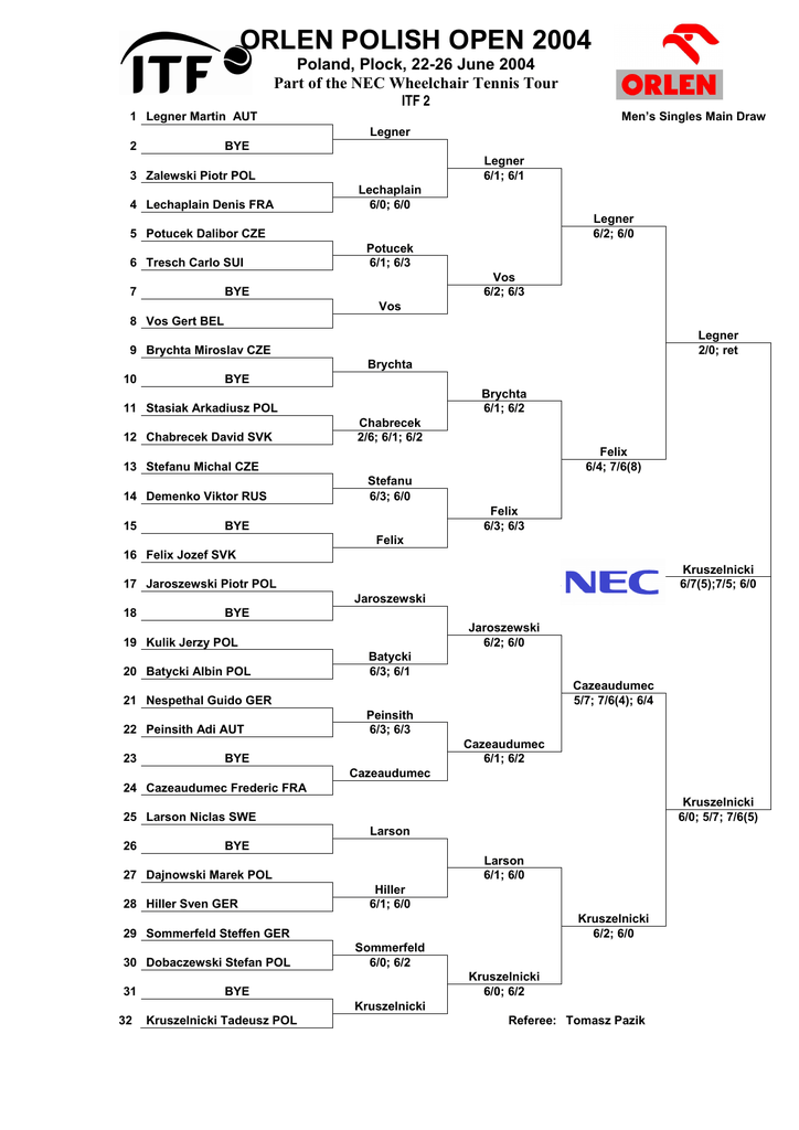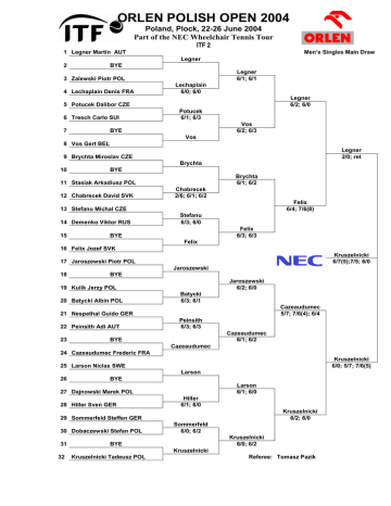 ORLEN POLISH OPEN 2004 Poland, Plock, 22-26 June 2004 Part of the NEC Wheelchair Tennis Tour ITF 2 1 Legner Martin AUT Men’s Singles Main Draw Legner 2 BYE Legner 6/1; 6/1 3 Zalewski Piotr POL 4 Lechaplain Denis FRA Lechaplain 6/0; 6/0 Legner 6/2; 6/0 5 Potucek Dalibor CZE 6 Tresch Carlo SUI 7 Potucek 6/1; 6/3 Vos 6/2; 6/3 BYE Vos 8 Vos Gert BEL Legner 2/0; ret 9 Brychta Miroslav CZE Brychta 10 BYE Brychta 6/1; 6/2 11 Stasiak Arkadiusz POL 12 Chabrecek David SVK Chabrecek 2/6; 6/1; 6/2 Felix 6/4; 7/6(8) 13 Stefanu Michal CZE 14 Demenko Viktor RUS 15 Stefanu 6/3; 6/0 Felix 6/3; 6/3 BYE Felix 16 Felix Jozef SVK Kruszelnicki 6/7(5);7/5; 6/0 17 Jaroszewski Piotr POL Jaroszewski 18 BYE Jaroszewski 6/2; 6/0 19 Kulik Jerzy POL 20 Batycki Albin POL Batycki 6/3; 6/1 Cazeaudumec 5/7; 7/6(4); 6/4 21 Nespethal Guido GER 22 Peinsith Adi AUT 23 Peinsith 6/3; 6/3 Cazeaudumec 6/1; 6/2 BYE Cazeaudumec 24 Cazeaudumec Frederic FRA Kruszelnicki 6/0; 5/7; 7/6(5) 25 Larson Niclas SWE Larson 26 BYE Larson 6/1; 6/0 27 Dajnowski Marek POL 28 Hiller Sven GER Hiller 6/1; 6/0 Kruszelnicki 6/2; 6/0 29 Sommerfeld Steffen GER 30 Dobaczewski Stefan POL 31 Sommerfeld 6/0; 6/2 Kruszelnicki 6/0; 6/2 BYE Kruszelnicki 32 Kruszelnicki Tadeusz POL Referee: Tomasz Pazik ORLEN POLISH OPEN 2004 Poland, Plock, 22-26 June 2004 Part of the NEC Wheelchair Tennis Tour ITF 2 Women’s Singles Main Draw 1 Gravellier Florence FRA Gravellier 2 BYE Gravellier 6/0; 6/2 3 Bakhmatova Natalia RUS Bakhmatova 7/6(5); 6/4 4 Bubnova Ludmila RUS Gravellier 6/0; 6/3 5 Blake Kimberly GBR Blake 6 BYE Blake 6/1; 6/0 7 Skorupińska Lucyna POL Skorupińska 6/1; 6/1 8 Godzińska-Kubiak POL Siegers 1/6; 6/4; 6/4 9 Bartczak Agnieszka POL Bartczak 6/2; 6/3 10 Olszewska Judyta POL McMoran 6/2; 4/6; 7/5 11 BYE McMoran 12 McMoran Janet POL Siegers 6/2; 6/2 13 Wojcieszak Katarzyna POL Kruger 6/1; 6/0 14 Kruger Katharine GER Siegers 6/1; 6/0 15 BYE Siegers 16 Siegers Britta GER Referee: Tomasz Pazik ORLEN POLISH OPEN 2004 Poland, Plock, 22-26 June 2004 Part of the NEC Wheelchair Tennis Tour ITF 2 Men’s Doubles Main Draw Kruszelnicki Tadeusz POL 1 Legner Martin AUT Kruszelnicki Legner 2 BYE Kruszelnicki Legner 6/2; 6/3 Kordek Wojciech POL 3 Zalewski Piotr POL Felix Jozef SVK 4 Stefanu Michal SVK Felix Stefanu 6/0; 6/;0 Kruszelnicki Legner 6/1; 6/0 Larsson Niclas SWE 5 Peinsith Adi AUT Larsson Peinsith 6 BYE Larsson Peinsith 6/2; 6/1 Potucek Dalibor CZE 7 Stasiak Arkadiusz POL Dajnowski Marek POL 8 Dobaczewski Stefan POL Potucek Stasiak 6/3; 6/0 Kruszelnicki Legner 6/1; 6/1 Hiller Sven GER 9 Sommerfeld Steffen GER Lechapain Denis FRA 10 Tresce Carlo SUI Lechapain Tresce 7/5; 6/1 Cazeaudumec Vos 6/4; 6/3 11 BYE Cazeaudumec Vos Cazeaudumec Frederic FRA 12 Vos Gert BEL Brychta Jaroszewski 6/1; 6/1 Batycki Albin POL 13 Kulik Jerzy POL Chabrecek David SVK 14 Nespethal Guido GER Batycki Kulik 6/0; 6/7(5); 6/3 Brychta Jaroszewski 7/5; 6/1 15 BYE Brychta Jaroszewski Brychta Miroslav CZE 16 Jaroszewski Piotr POL Referee: Tomasz Pazik ORLEN POLISH OPEN 2004 Poland, Plock, 22-26 June 2004 Part of the NEC Wheelchair Tennis Tour ITF 2 Women’s Doubles Main Draw Gravellier Florence FRA 1 Siebers Brita GER Gravellier Siebers 2 BYE Gravellier Siebers 6/1; 6/2 Gdzińska-Kubiak POL 3 Kruger Katharina GER Bubnova Bakhmatova 6/4; 6/0 Bubnova Ludmila RUS 4 Bakhmatova Natalia RUS Gravellier Siebers 6/4; 6/0 Olszewska Judyta POL 5 Wojcieszak Katarzyna POL Bartczak Skorupińska 6/2; 6/1 Bartczak Agnieszka POL 6 Skorupińska Lucyna POL McMoran Blake 6/0; 6/4 7 BYE McMoran Blake McMoran Janet GBR 8 Blake Kimberly GBR Referee: Tomasz Pazik ORLEN POLISH OPEN 2004 Poland, Plock, 22-26 June 2004 Part of the NEC Wheelchair Tennis Tour ITF 2 Men’s Singles Second Draw 1 Glaz Bogusław POL Glaz 6/0; 6/0 2 Fiedotov Alexander RUS Glaz 6/3; 6/0 3 Miecznik Jan POL Miecznik 4/6; 7/5; 6/2 4 Wierdak Jacek POL Glaz 6/2; 7/6(4) 5 Śmietanka Mariusz POL Śmietanka 6/0; 6/1 6 Walenciak Dariusz POL Śmietanka 6/1; 6/2 7 Pranschke Piotr POL Aksamitowski 6/2; 6/3 8 Aksamitowski Krzysztof POL Glaz 6/4; 6/0 9 Nowicki Robert POL Offman 6/0; 6/3 10 Offman Grzegorz POL Offman 6/0; 7/5 11 Jankowski Dariusz POL Pienczyn 6/1; 6/1 12 Pienczyn Marek POL Offman 6/0; 6/2 13 Szczygieł Ryszard POL Szczygieł 4/6; 6/1; 6/2 14 Bukowski Mariusz POL Rogowski 6/1; 6/7(3); 7/5 15 Miętrkiewicz Paweł POL Rogowski 7/5; 6/3 16 Rogowski Marcin POL Referee: Tomasz Pazik ORLEN POLISH OPEN 2004 Poland, Plock, 22-26 June 2004 Part of the NEC Wheelchair Tennis Tour ITF 2 Men’s Doubles Second Draw Glaz Bogusław POL 1 Szczygieł Ryszard POL Glaz Szczygieł 2 BYE Glaz Szczygieł 6/7(2); 6/4; 6/2 Aksamitowski Krzysztof POL 3 Offman Grzegorz POL Aksamitowski Krzysztof ret Jankowski Dariusz POL 4 Pranschke Piotr POL Glaz Szczygieł 6/3; 7/6(4) Pienczyn Marek POL 5 Rogowski Marcin POL Pienczyn Marek 6/2; 6/3 Fedotov Alexandre RUS 6 Korzenev Nikolai RUS Pienczyn Marek 6/4; 6/0 Walenciak Dariusz POL 7 Śmietanka Mariusz POL Walenciak Śmietanka 7/5; 7/5 Bukowski Mariusz POL 8 Miętrkiewicz Paweł POL Referee: Tomasz Pazik ORLEN POLISH OPEN 2004 Poland, Plock, 22-26 June 2004 Part of the NEC Wheelchair Tennis Tour ITF 2 Men’s Singles B Draw Player 1 2 3 4 X 4/6 6/3 4/6 6/4 6/4 0/6 0/6 2 Soboń Paweł POL 6/4 3/6 6/4 X 7/5 5/7 6/1 3 Kordek Wojciech POL 4/6 4/6 5/7 7/5 1/6 4 Sobczyński Andrzej POL 6/0 6/0 1/6 3/6 1 Korzenev Nikolai RUS Gem Set Match Place 26 : 35 3 : 4 1 : 0 3 6/1 6/3 45 : 24 6 : 2 3 : 2 1 X 6/3 6/4 33 : 37 3 : 4 1 : 2 2 3/6 4/6 X 23 : 24 2 : 4 1 : 2 4 ORLEN POLISH OPEN 2004 Poland, Plock, 22-26 June 2004 Part of the NEC Wheelchair Tennis Tour ITF 2 Women’s Singles Main Draw Consolation Player 1 2 3 4 Gem Set Match Place X 8/5 8/1 8/0 24 : 6 3 : 0 3 : 0 1 2 Gidzińska-Kubiak Agnieszka POL 5/8 X 8/2 8/0 21 : 10 2 : 1 2 : 1 2 3 Olszewska Judyta POL 1/8 2/8 X 8/6 11 : 22 1 : 2 1 : 2 3 4 Wojcieszak Katarzyna POL 0/8 0/8 6/8 X 6 : 24 0 : 3 0 : 3 4 1 Bubnova Ludmila RUS ORLEN POLISH OPEN 2004 Poland, Plock, 22-26 June 2004 