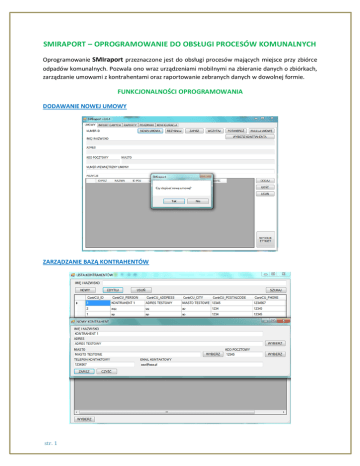 SMIRAPORT – OPROGRAMOWANIE DO OBSŁUGI PROCESÓW KOMUNALNYCH Oprogramowanie SMIraport przeznaczone jest do obsługi procesów mających miejsce przy zbiórce odpadów komunalnych. Pozwala ono wraz urządzeniami mobilnymi na zbieranie danych o zbiórkach, zarządzanie umowami z kontrahentami oraz raportowanie zebranych danych w dowolnej formie. FUNKCJONALNOŚCI OPROGRAMOWANIA DODAWANIE NOWEJ UMOWY ZARZĄDZANIE BAZĄ KONTRAHENTÓW str. 1 ZARZĄDZANIE UMOWAMI Z KONTRAHENTAMI Umowy są statusowane (anulowane, wpisane, zatwierdzone). Możliwe jest notowanie wewnętrznych numerów umów. Wydruki etykiet na dowolnej drukarce kodów kreskowych według specyfikowanych etykiet w języku drukarki. Wydruki można wykonywać zarówno zbiorczo, jak i pojedynczo. str. 2 IMPORT DANYCH Z DOWOLNEGO URZĄDZENIA MOBILNEGO PDA Zapewniamy pełen przekrój urządzeń mobilnych – od najprostszych, do najbardziej wyrafinowanych z możliwością pracy w temperaturach ujemnych (-20 st.C) i przy opadach deszczu (IP 67). Stosujemy technologie kodów 1D/2D w zależności od zapotrzebowania. Obecna implementacja kodu zawiera zabezpieczenie przed zapisem nieprawidłowych kodów, jednocześnie zawierając dane dotyczące lokalizacji, rodzaju pojemnika na odpady oraz umowy z kontrahentem. Można obsługiwać tu także pojemniki jednorazowe. System zapewnia bieżący podgląd na zapisy w centrali firmy i ich ocenę pod kątem prawidłowości realizacji umowy. str. 3 URZĄDZENIA MOBILNE Oprogramowanie na urządzenie mobilne dostosowujemy każdorazowo w zależności od typu instalacji. Podstawową funkcjonalnością jest jednak odczyt i zbiór danych z zeskanowanych pojemników oraz odtransmitowanie wykonanej pracy do centrali firmy w formacie plików XML/CSV. Polecamy urządzenia firmy HONEYWELL, CIPHERLAB, UNITECH oraz MOTOROLA. Dobór urządzenia zależny jest od warunków pracy – wyposażamy od razu urządzenie mobilne w odpowiedni program – jest on prosty ze względu na specyfikę pracy terenowej. ZARZĄDZANIE POJEMNIKAMI NA ODPADY System pozwala na zarządzanie pojemnikami na odpady niezależnie od ich opisu i przeznaczenia. Jedyną granicą ilości pojemników jest pojemność bazy danych. Każdy pojemnik może mieć indywidualnie zdefiniowaną etykietę. str. 4 PROSTA KONFIGURACJA Banalna konfiguracja systemu pozwala na bardzo szybkie wdrożenie systemu oraz wpływ użytkownika na jego funkcję bez potrzeby firm wspomagających. RAPORTOWANIE Raportowanie może być dostosowane dowolnie do Państwa życzeń. WDROŻENIE ZDALNE System może być wdrażany zdalnie za pomocą popularnych programów do podglądu pulpitu (TeamViewer, VNC, SKYPE, RDP itd.). Tak samo może być świadczony szybko i sprawnie serwis i suport, o ile będzie wymagany. str. 5 TECHNIKALIA System działa na bazie danych MICROSOFT SQL SERVER w wersjach od 2005 do 2012 (typ serwera nie jest istotny). Można użyć darmowych baz danych oraz istniejących już produktów w zakresie MS SQL w Państwa firmie. System może działać jednostanowiskowo lub sieciowo. Jedynym ograniczeniem systemu jest wydajność bazy danych, która to powinna zostać dobrana w zależności od wielkości instalacji. System potrzebuje do uruchomienia środowiska .net framework 4 oraz silnika raportującego ReportViewer (rozwiązanie darmowe). Większość komputerów PC istniejących na rynku spełnia wymagania podstawowe do prawidłowego działania systemu SMIraport. System operacyjny minimalnie zainstalowany to WINDOWS XP SP3, pamięć RAM – 1GB, wymagania dyskowe – zależnie od funkcjonalności stanowiska. Program został stworzony w najnowszej technologii MICROSOFT i może być modyfikowany także jako oprogramowanie web’owe. LICENCJONOWANIE System licencjonowany jest stanowiskowo. Program przypisywany jest do komputera, na którym pracuje. Każdorazowa zmiana komputera powoduje wymóg aktywacji systemu. KONTAKT DYSTRYBUCYJNY Dział AUTO ID T: +48 58 773 99 91 M: +48 661 950 814 @: [email protected] www: www.torell.pl -------------------------------------------------------------TORELL - Danuta Wingert i Wspólnicy – Spółka jawna ul. Obr. Westerplatte 5 83-000 Pruszcz Gdański -------------------------------------------------------------Zanim wydrukujesz, pomyśl o Środowisku Naturalnym! str. 6